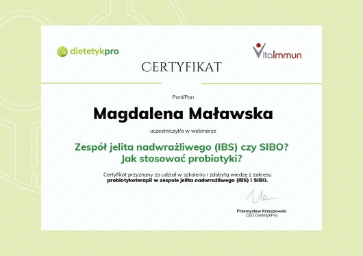 Ukończyłam Uniwersytet Przyrodniczy we Wrocławiu – Wydziału Nauk o Żywności oraz studia podyplomowe Psychodietetyka Uniwersytetu SWPS oraz szkolenie specjalistyczne w ramach Szkoły Insulinooporności SOIT. Doświadczenie zdobyłam współpracując z poradniami dietetycznymi, prowadząc oddział poradni warszawskiej we Wrocławiu (SetPoint) oraz w Centrum Dietetyczne Nutri-Med. Pomagam uzyskać cel i poprawić samopoczucie osobom z chorobami tarczycy (niedoczynność i Hashimoto), pacjentom z insulinoopornością i cukrzycą, z alergiami pokarmowymi, chorobami układu pokarmowego oraz zaburzeniami odżywiania. Wiedzę na bieżąco poszerzam oraz wykorzystuje ją także w działalności edukacyjnej (posiadając uprawnienia pedagogiczne). Pracowałam jako wykładowca dietetyki i zasad żywienia w policealnych i wyższych szkołach we Wrocławiu. Prowadzę warsztaty i wykłady o tematyce żywieniowej dla przedszkoli, szkół oraz firm. Jestem autorką wielu publikacji dotyczących diety i nawyków żywieniowych. Współpracuje również z prasą oraz mediami elektronicznymi występując jako ekspert żywieniowy. Jestem członkiem Polskiego Towarzystwa Badań nad Otyłością oraz Polskiego Towarzystwa Dietetyki. Zapraszam na konsultacje w gabinecie i online. Przeprowadzam także Wodorowe Testy Oddechowe (WTO)- przerost flory bakteryjnej jelit SIBO, nietolerancja laktozy, nietolerancja fruktozy, nietolerancja sorbitolu. #1Dietetyk Wrocław #1Dietetyczka Wrocław #1Dietetyczka Online