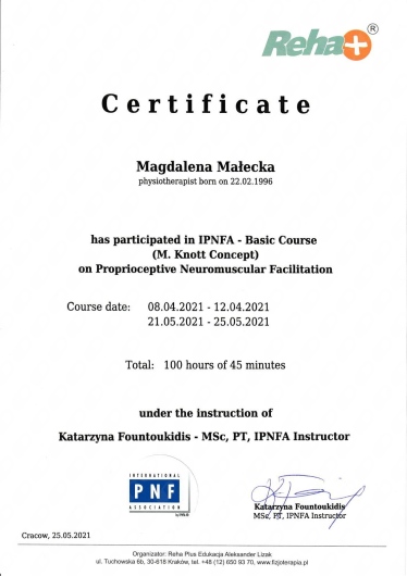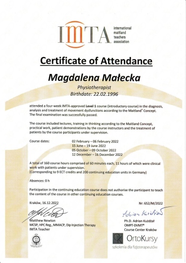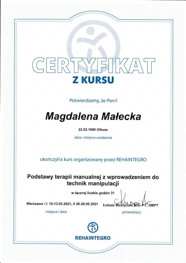Witam, jestem absolwentką studiów magisterskich na Uniwersytecie Jagiellońskim na kierunku fizjoterapia oraz posiadam również tytuł technika masażysty. Praktykę i doświadczenie zdobywałam w licznych placówkach rehabilitacyjnych , pracując z pacjentami z różnego typu dysfunkcjami, gdzie miałam możliwość prowadzenia pacjenta w sposób indywidualny i kompleksowy. Mam doświadczenie w pracy z pacjentami ortopedycznymi, neurologicznymi, pooperacyjnymi, onkologicznymi, stomatologicznymi i sportowcami. Zdobyte przeze mnie doświadczenie zawodowe wykorzystuję w pracy z pacjentem oferując szeroki wachlarz zabiegów z dziedziny fizjoterapii i szeroko pojętej terapii manualnej. Do każdego pacjenta podchodzę holistycznie, dużą wagę przywiązuję do postawienia trafnej diagnozy, która pozwoli zmaksymalizować efekty terapii oraz skrócić czas leczenia. Moim głównym celem jest powrót do zdrowia moich pacjentów, dlatego też pogłębiam swoją wiedzę w zakresie najnowszych technik terapii manualnej, terapii powięziowej i innych skutecznych form uwalniania od bólu. Moje dotychczasowe kursy: * Terapia manualna Maitland * Medycyna manualna wg FRSc * Suche igłowanie/ Akupunktura medyczna * PNF * Masaż tkanek głębokich * Terapia punktów spustowych * Drenaż limfatyczny i kompleksowa terapia przeciwobrzękowa * Pinoterapia * Osteopatyczne podejście do zaburzeń psychosomatycznych * Kinesiology Taping * Podstawy terapii manualnej z wprowadzeniem do technik manipulacji