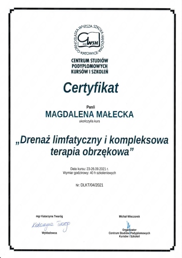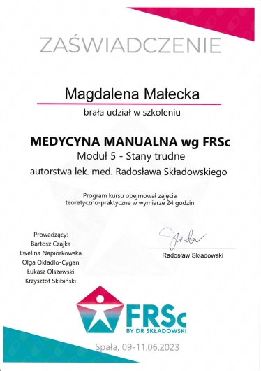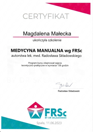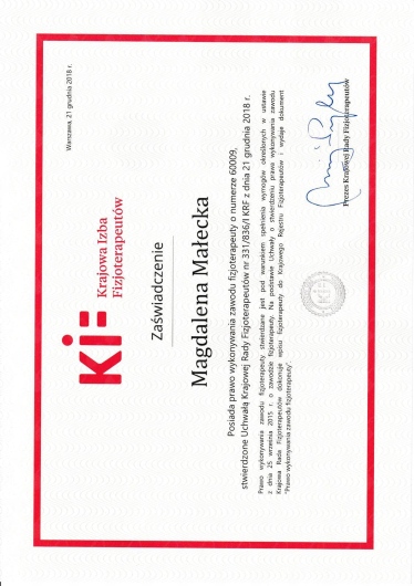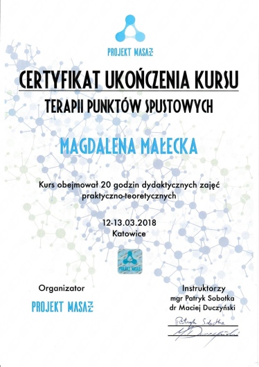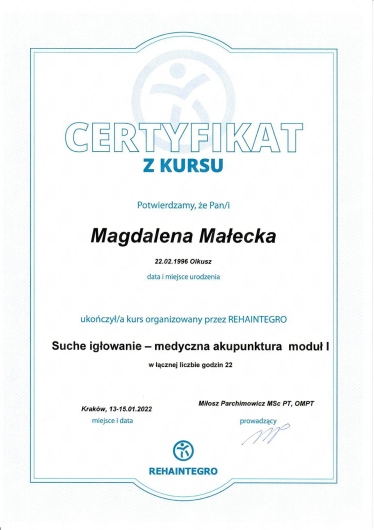 Miałam ogromne szczęście trafić na Panią Magdalenę Małecką – fizjoterapeutkę z prawdziwego powołania. Pani Magda jest niezwykle profesjonalna, zaangażowana i pełna empatii. Dzięki Jej wiedzy i doświadczeniu udało mi się znacząco zmniejszyć napięciowe bóle głowy oraz dolegliwości związane ze zwyrodnieniami kręgosłupa. Dodatkowo, bardzo skutecznie pomogła mi w rozluźnianiu nadmiernie zaciskanej żuchwy, co przyniosło mi ogromną ulgę. Każda wizyta przebiega w przyjaznej atmosferze, a podejście Pani Magdy do pacjenta jest indywidualne i holistyczne. Z całego serca polecam Jej usługi każdemu, kto szuka skutecznej i profesjonalnej pomocy fizjoterapeutycznej.