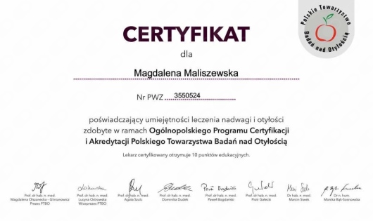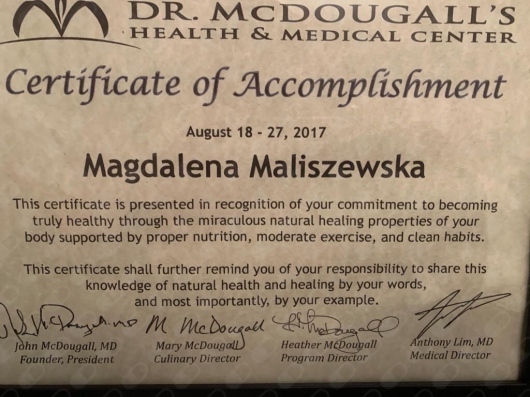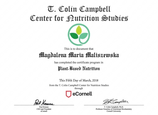 Oprócz zagadnień związanych ze zdrowiem psychicznym interesuję się tematyką holistycznego podejścia do zdrowia. Ukończyłam staże w McDougall Health Center oraz True North Health Center w Santa Rosa w stanie Kalifornii, gdzie poznawałam sposoby leczenia chorób zgodnie z zasadami zdrowego stylu życia. Otrzymałam Plant- Based Nutrition Certificate (Certyfikat Zasad Odżywiania Roślinnego) pod kierownictwem T. Colin Campbell Center for Nutrition Studies na eCornell University w USA oraz Certyfikat Ogólnopolskiego Programu Certyfikacji i Akredytacji Polskiego Towarzystwa Badań Nad Otyłością.