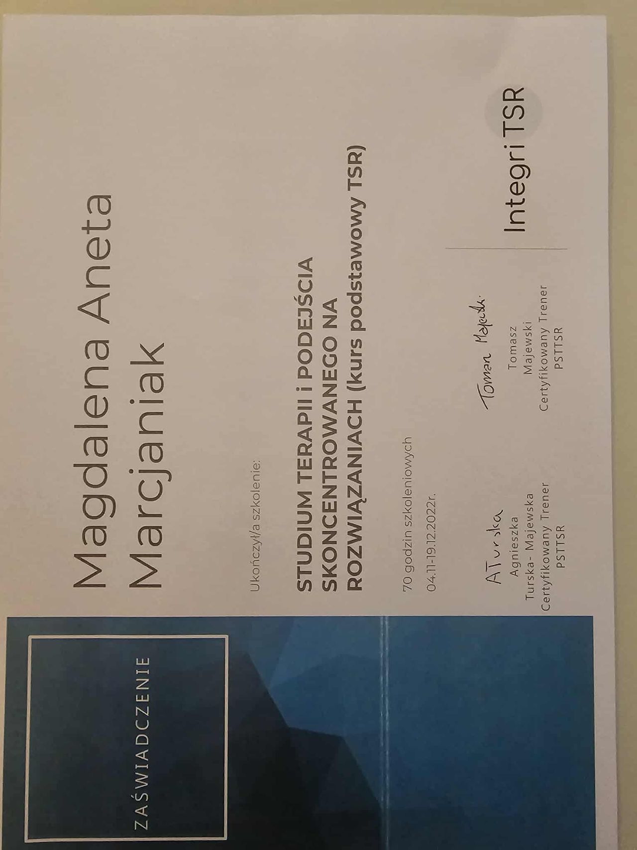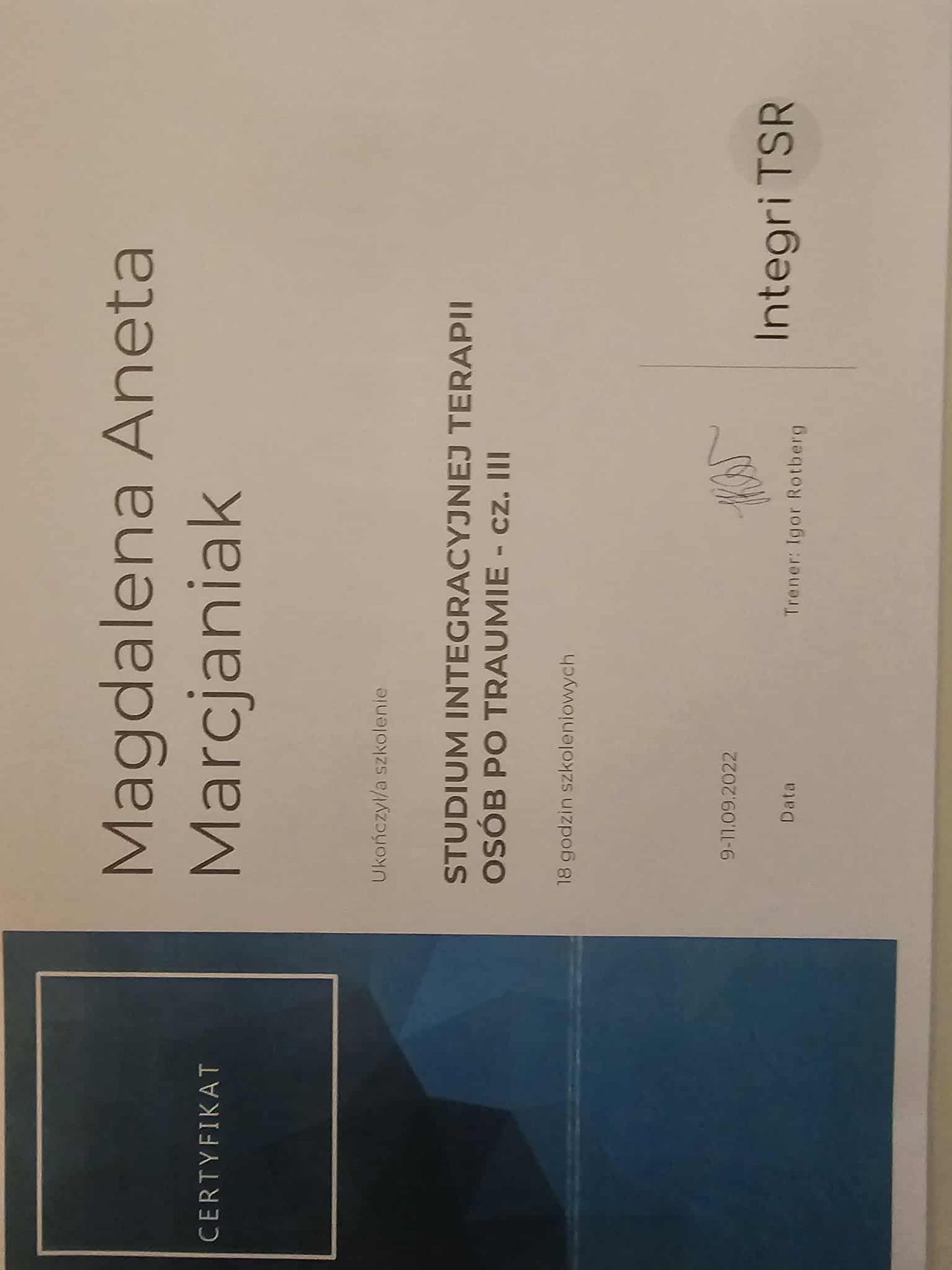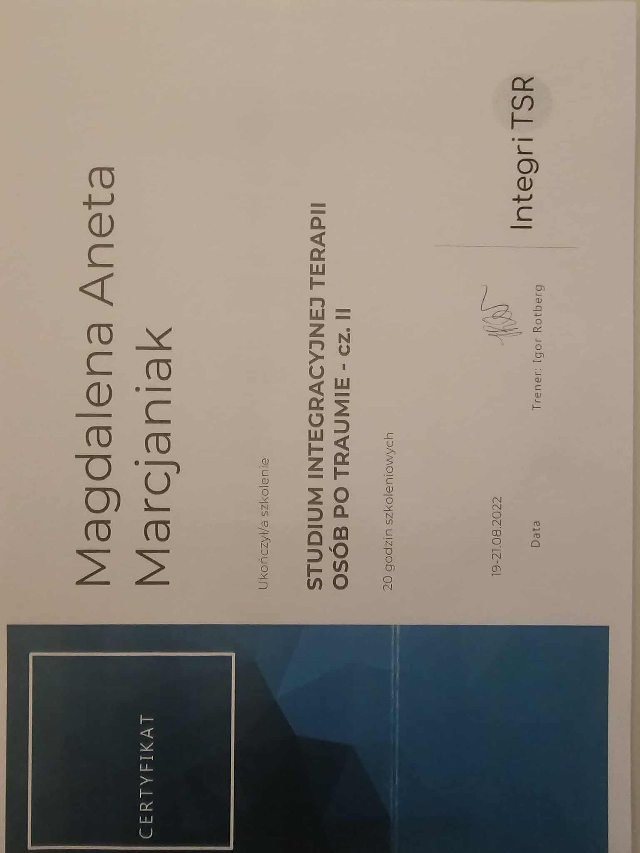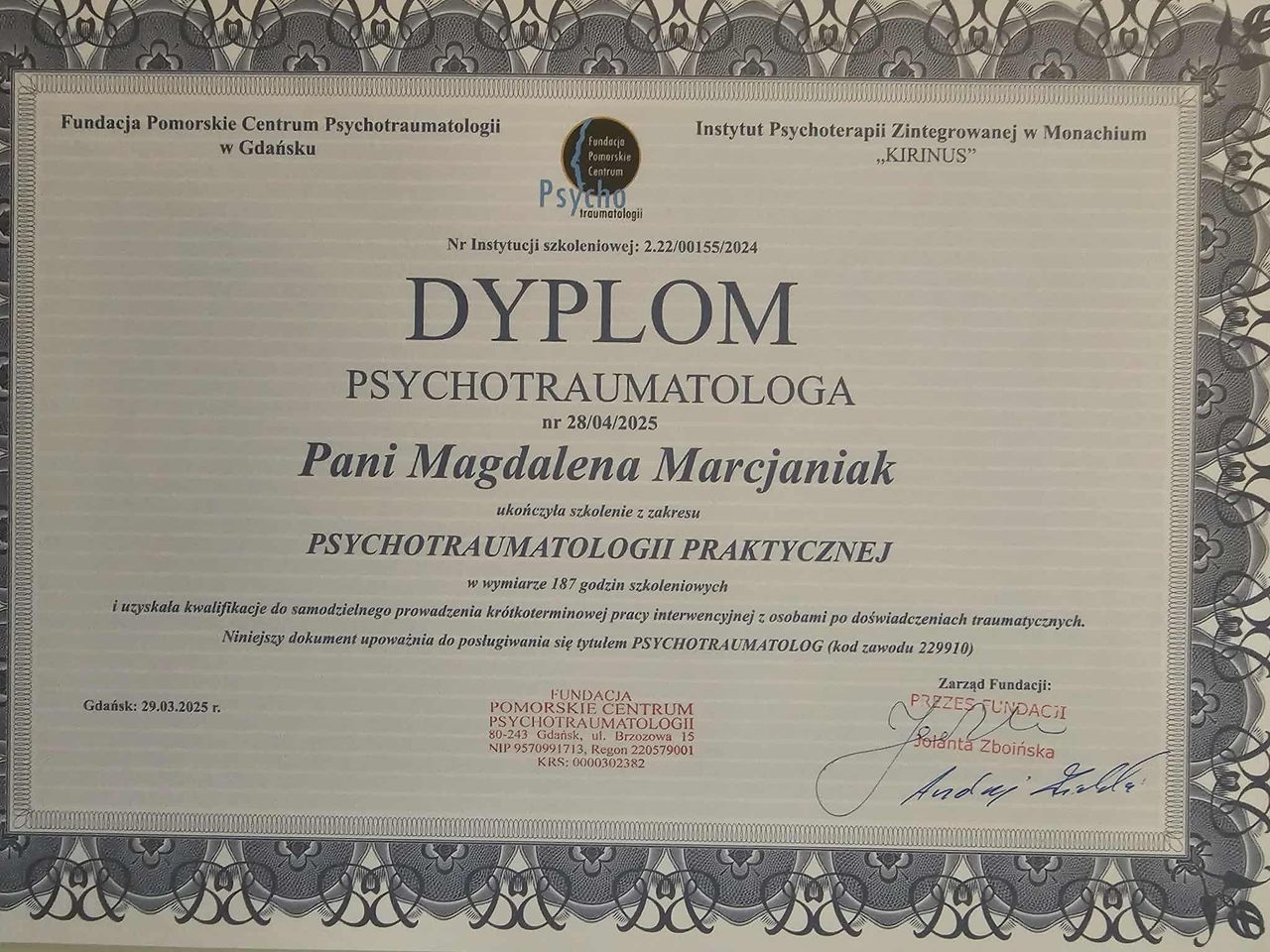 Dodatkowo pogłębiałam swoją wiedzę dotyczącą zespołu stresu pourazowego (PTSD), co pozwala mi skutecznie pomagać osobom doświadczającym różnych form traumy psychicznej, a w szczególności tych o charakterze relacyjnym.