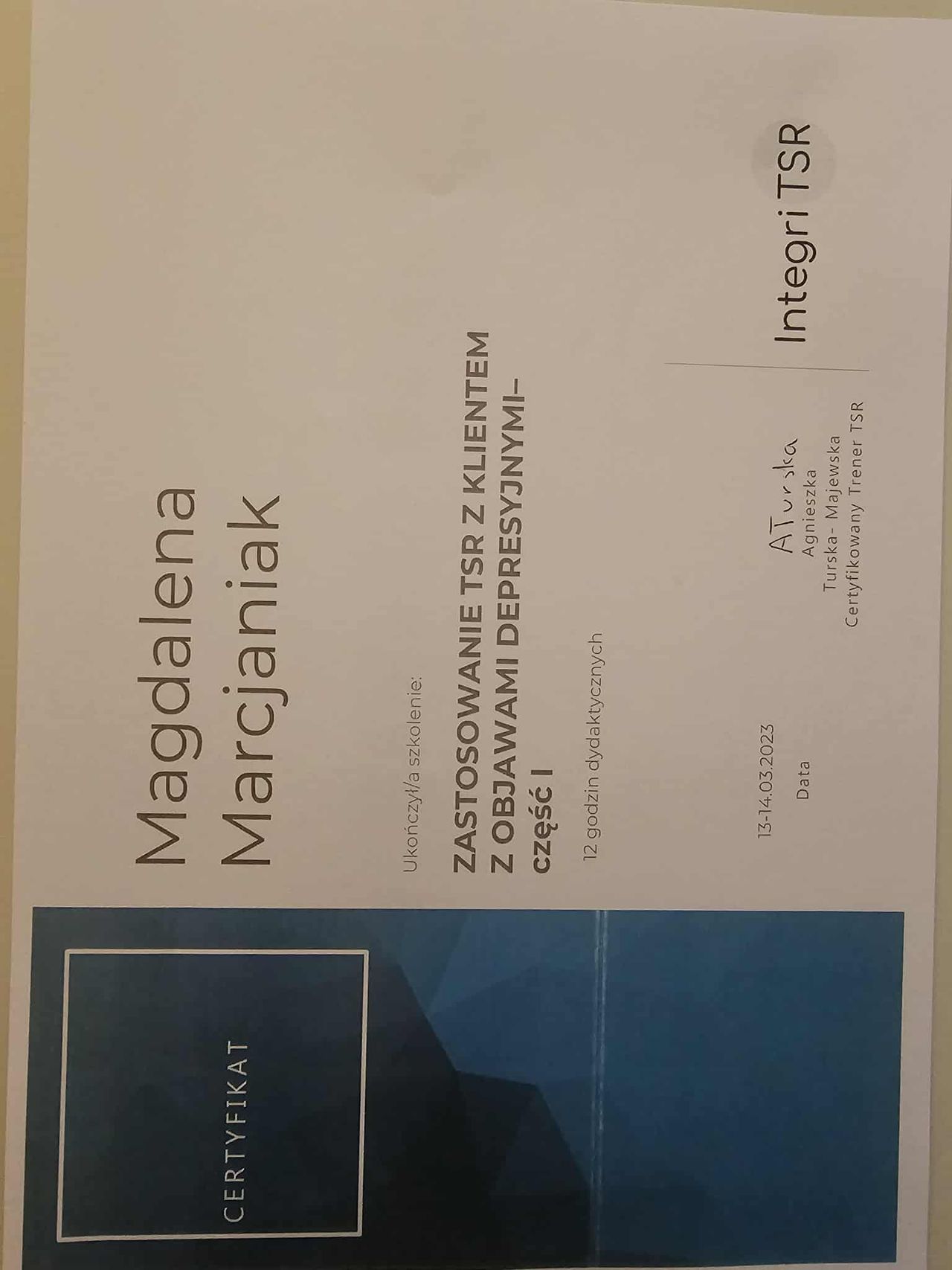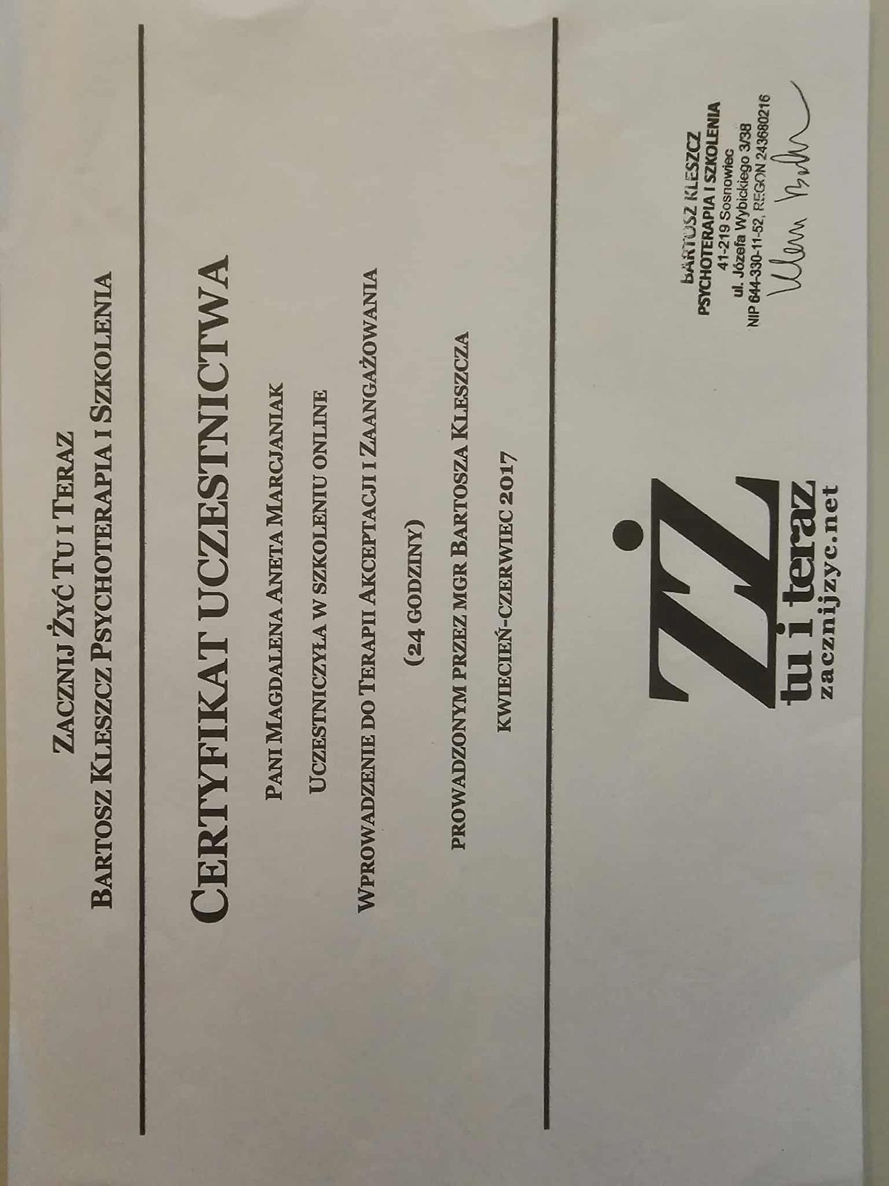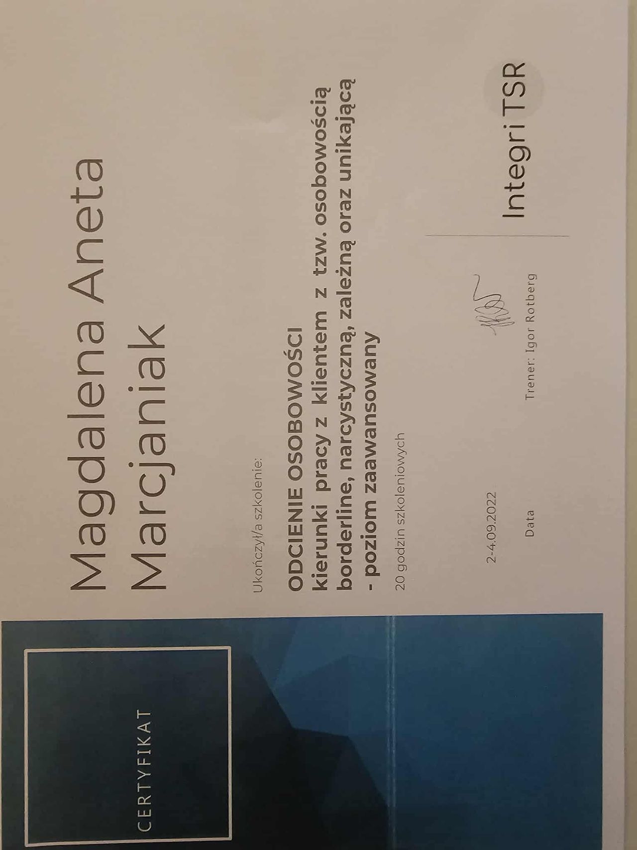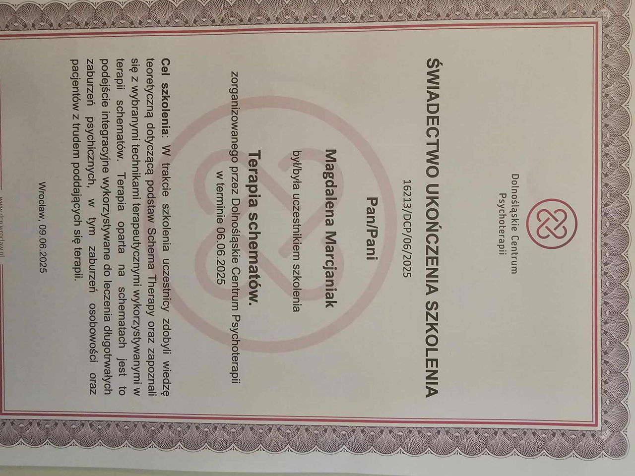 Dodatkowo pogłębiałam swoją wiedzę dotyczącą zespołu stresu pourazowego (PTSD), co pozwala mi skutecznie pomagać osobom doświadczającym różnych form traumy psychicznej, a w szczególności tych o charakterze relacyjnym.