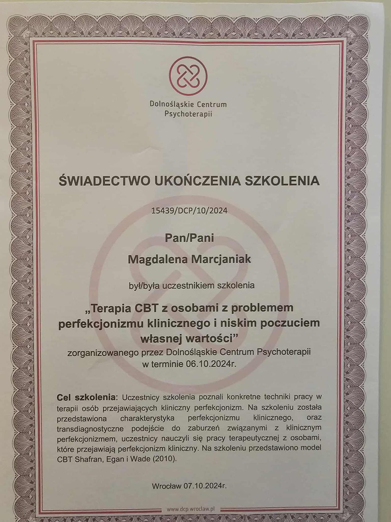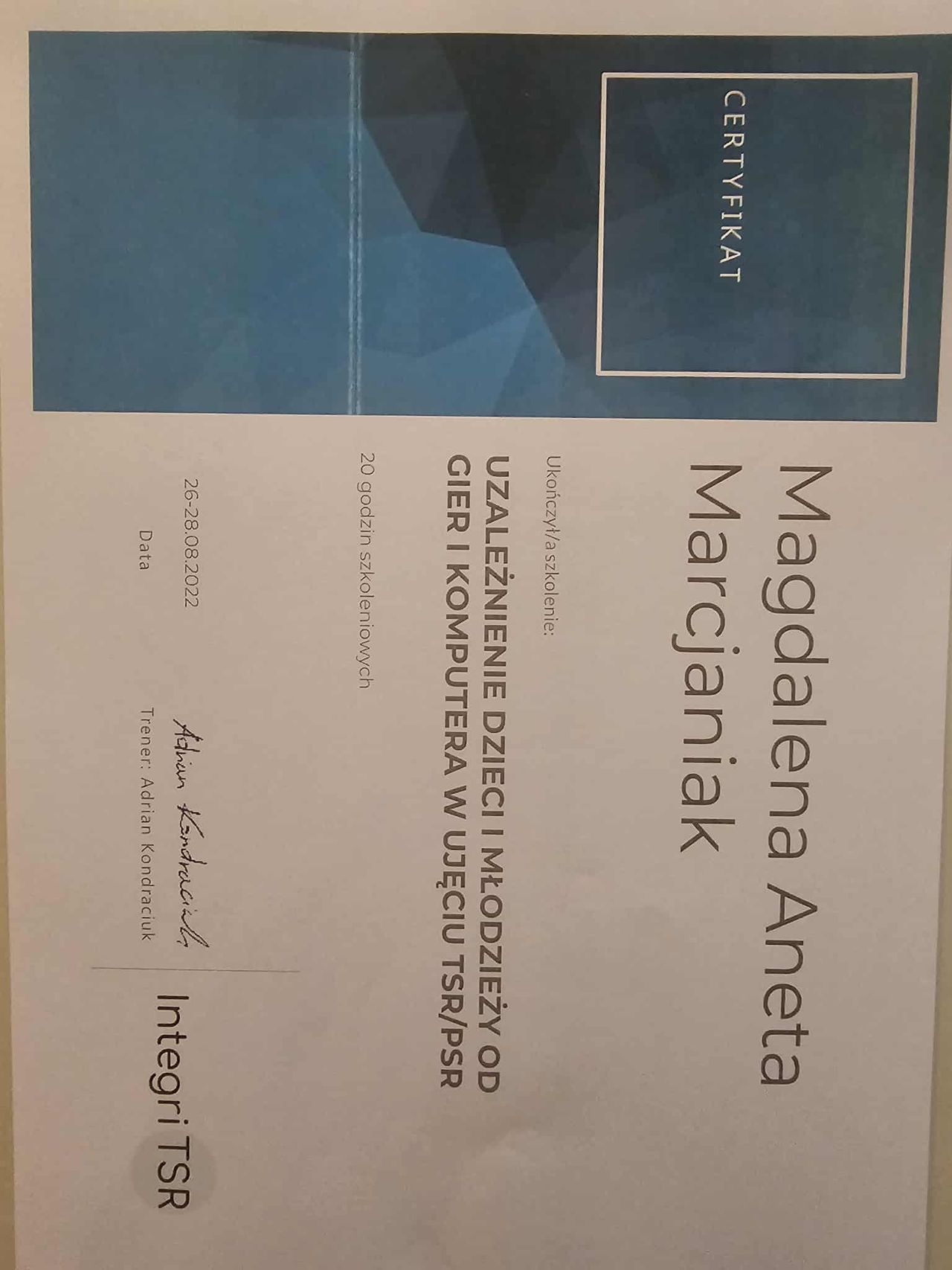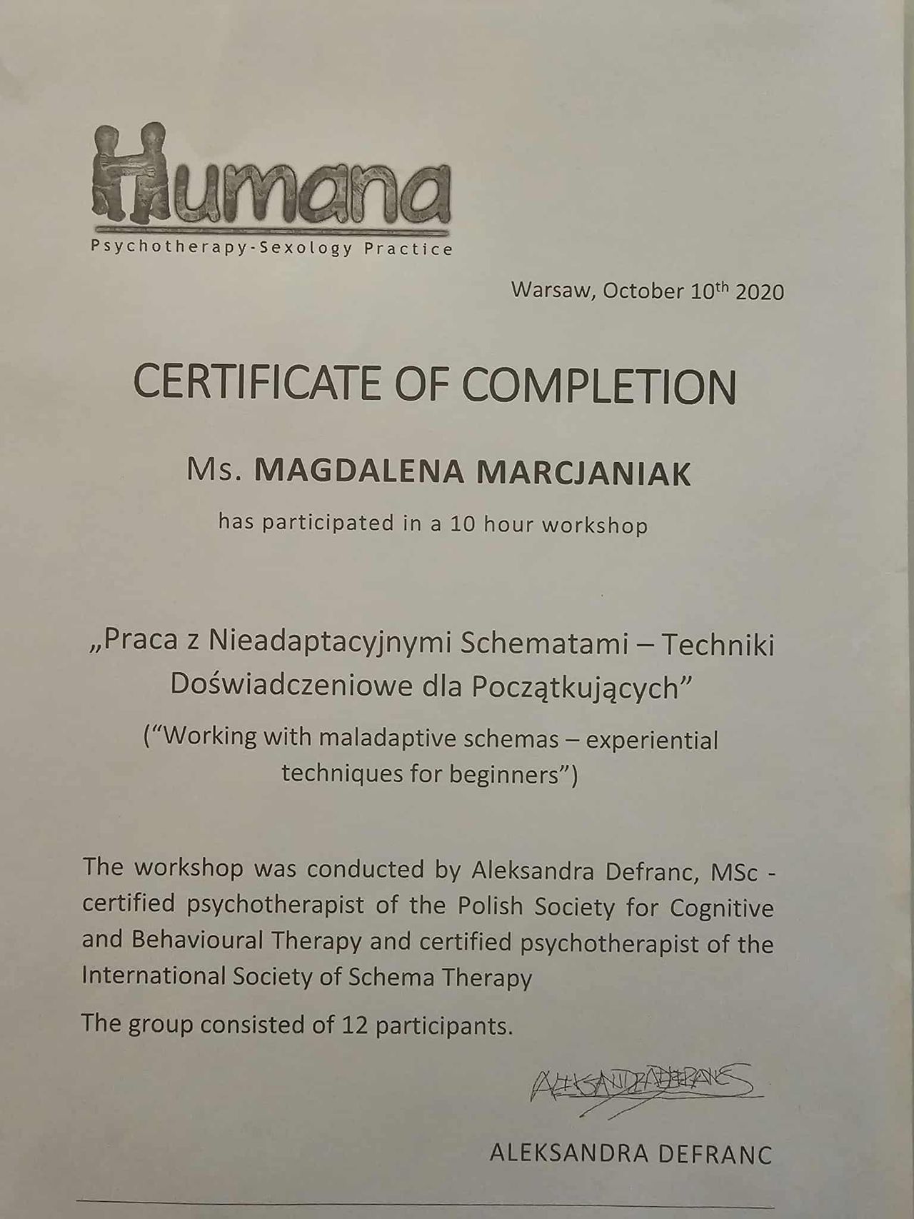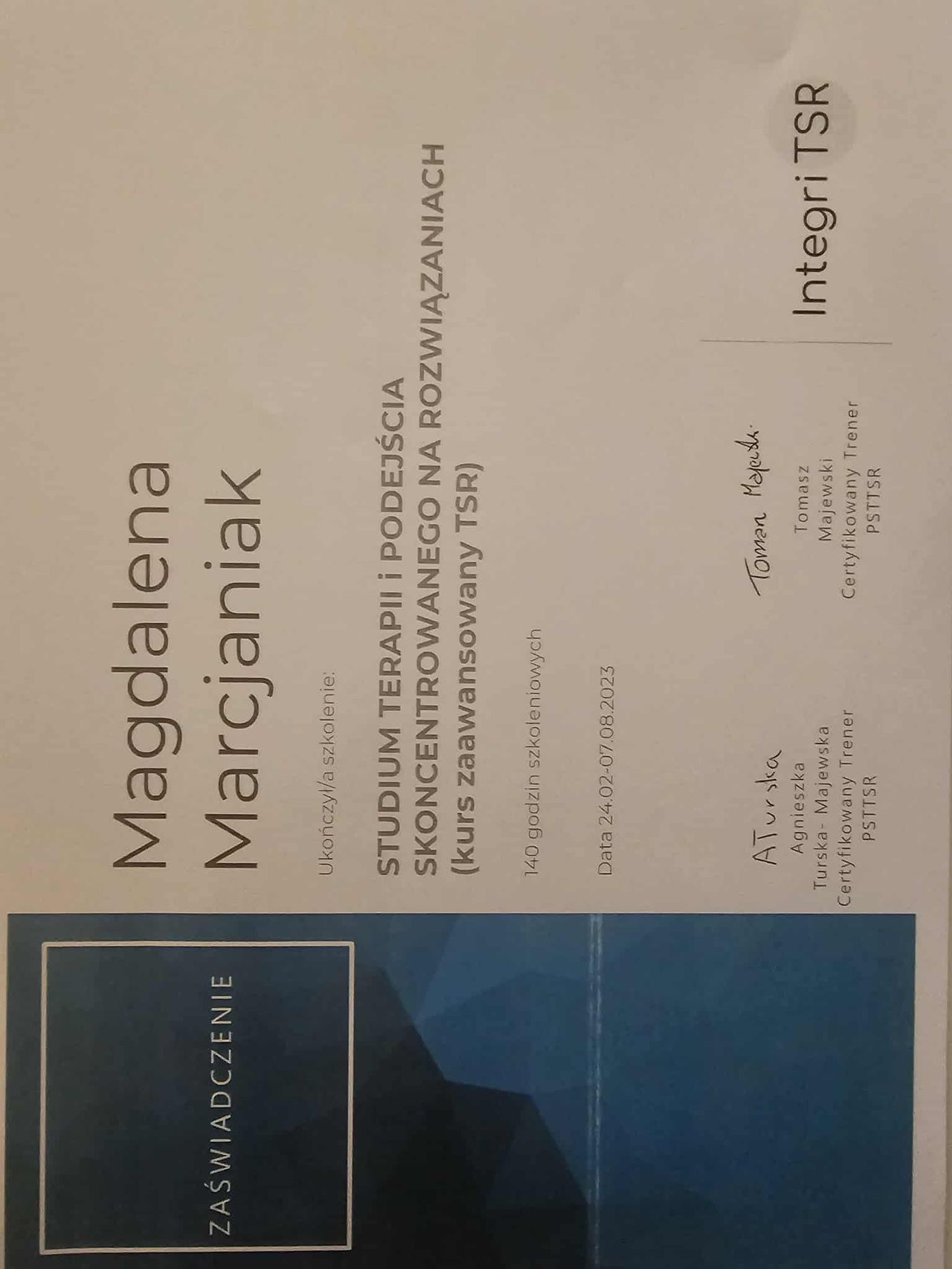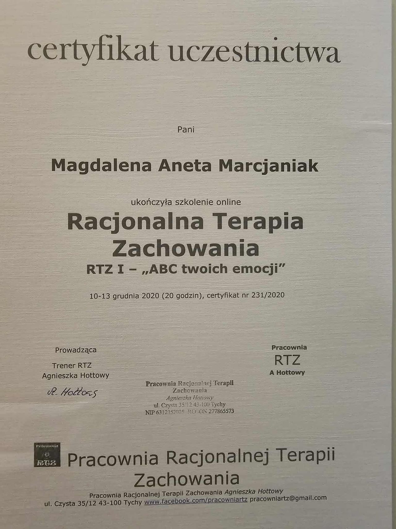 Dodatkowo pogłębiałam swoją wiedzę dotyczącą zespołu stresu pourazowego (PTSD), co pozwala mi skutecznie pomagać osobom doświadczającym różnych form traumy psychicznej, a w szczególności tych o charakterze relacyjnym.