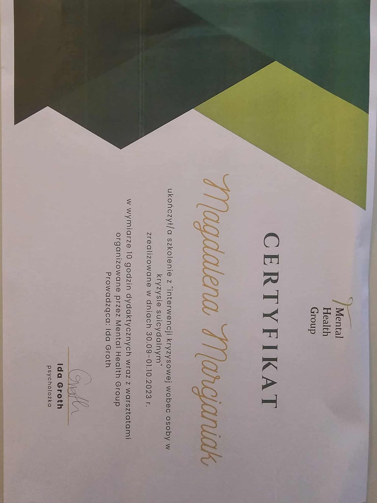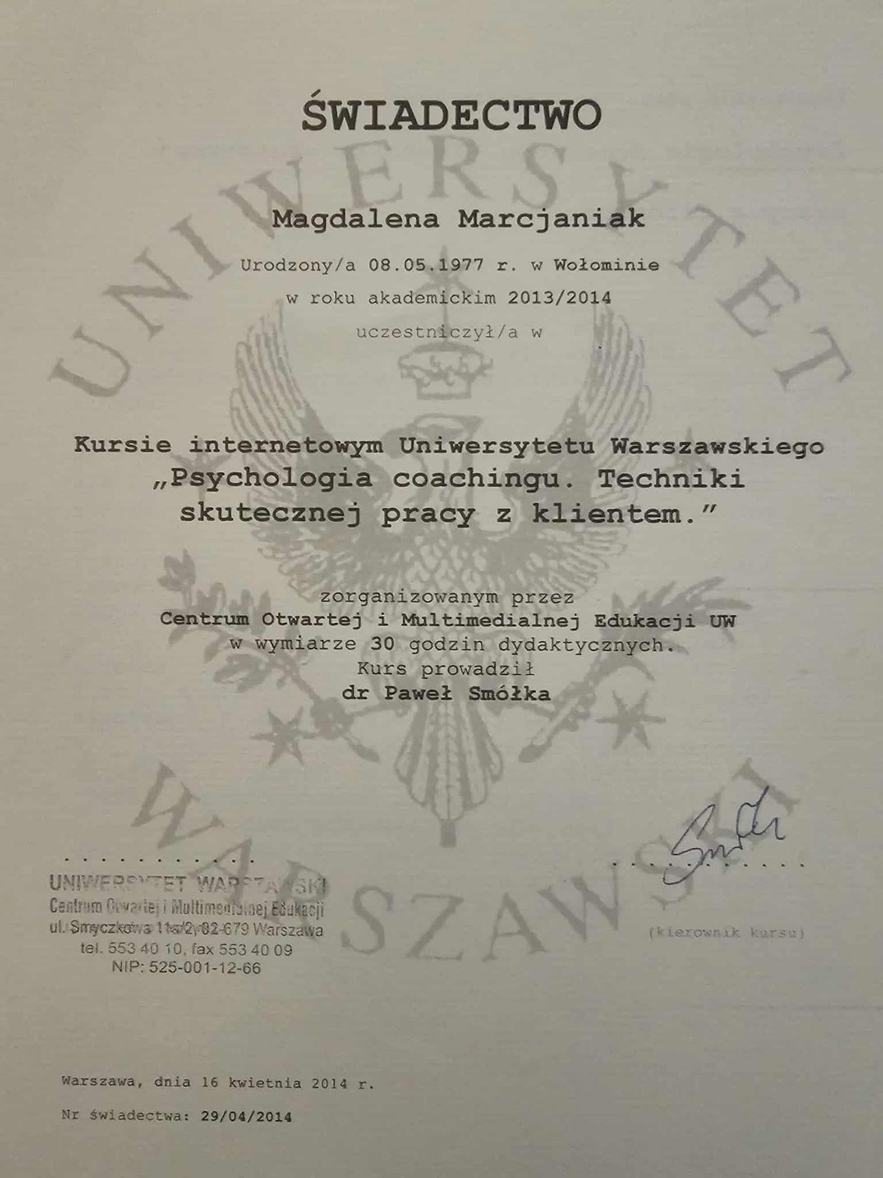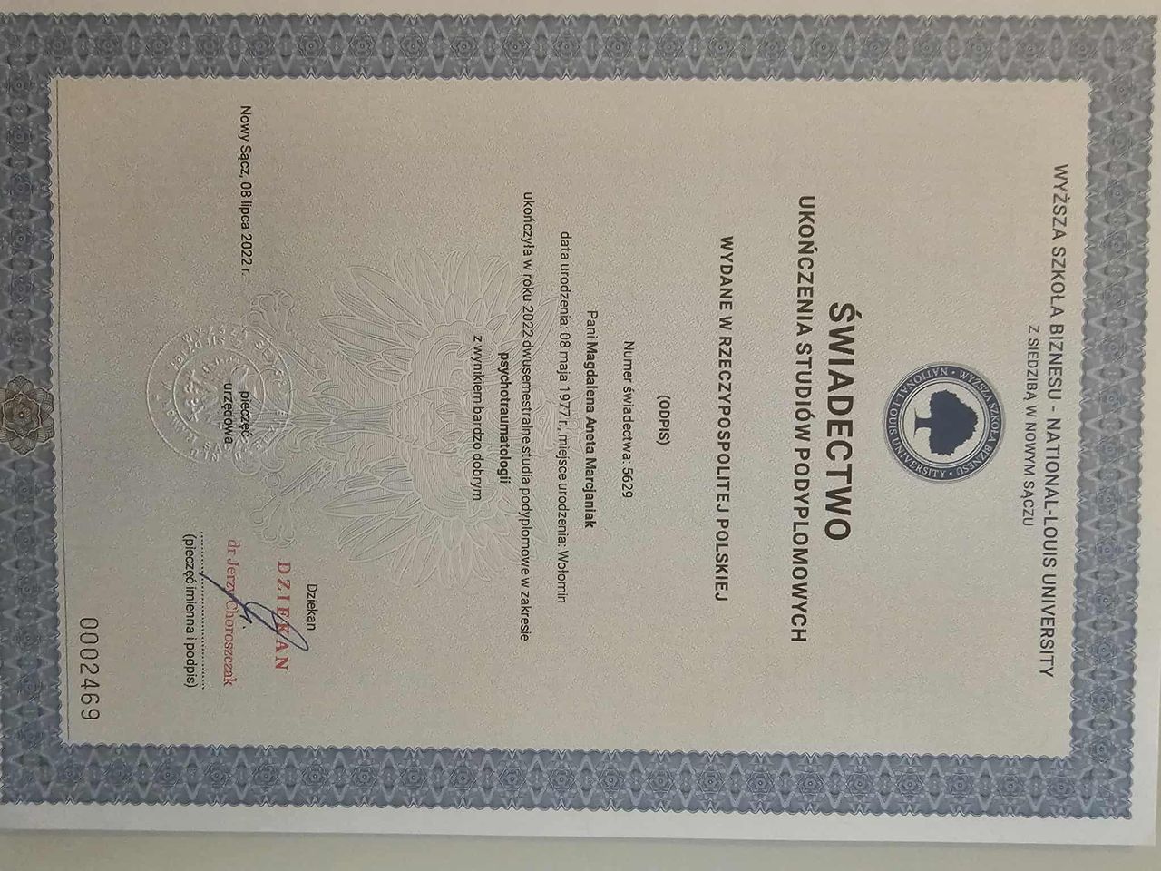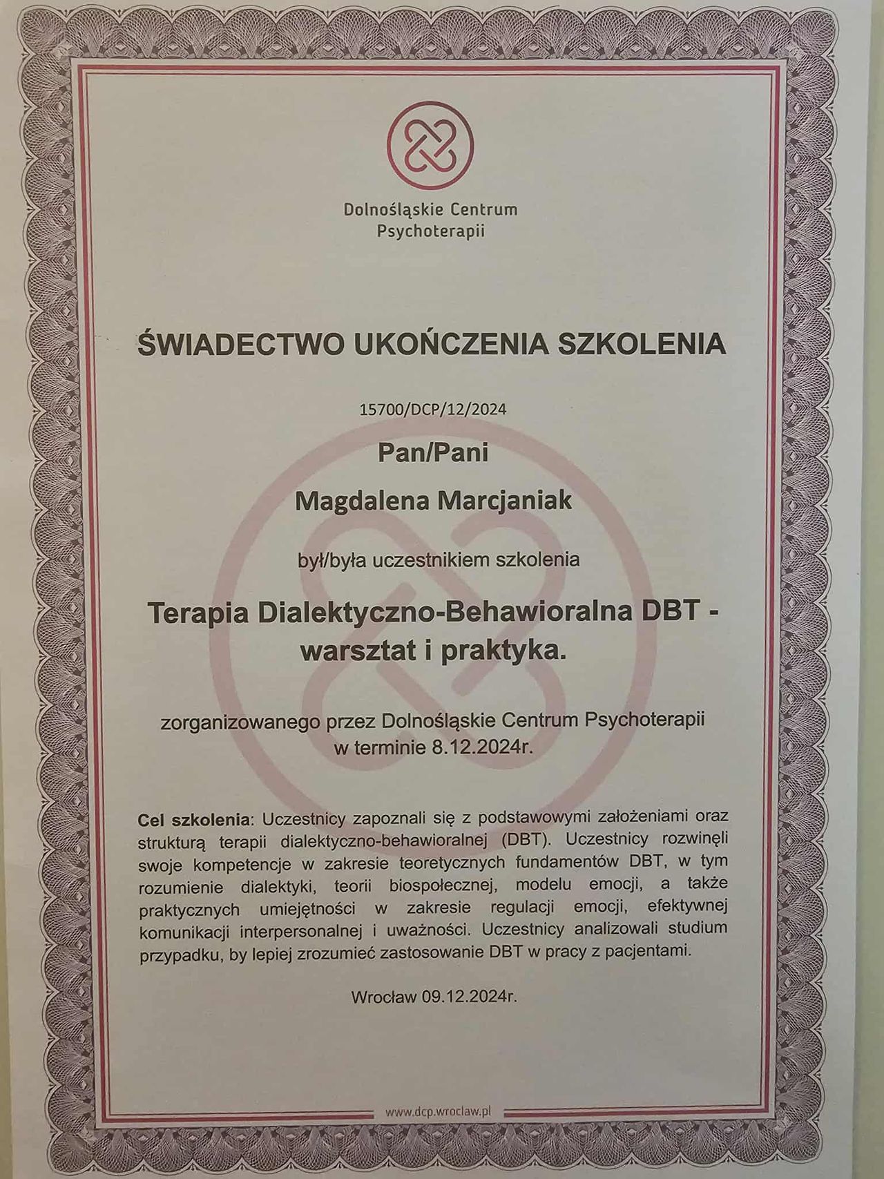 Dodatkowo pogłębiałam swoją wiedzę dotyczącą zespołu stresu pourazowego (PTSD), co pozwala mi skutecznie pomagać osobom doświadczającym różnych form traumy psychicznej, a w szczególności tych o charakterze relacyjnym.