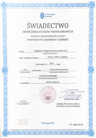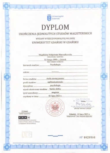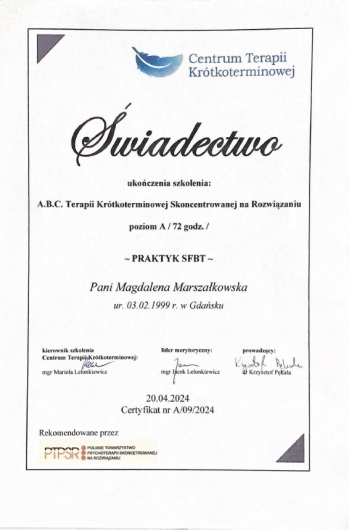 Jestem psychologiem i psychotraumatologiem z pasją pomagania młodzieży i dorosłym w radzeniu sobie z trudnościami emocjonalnymi i życiowymi. Ukończyłam Uniwersytet Gdański, a w swojej pracy wykorzystuję Terapię Skoncentrowaną na Rozwiązaniach (SFBT), która pomaga w szybkim znajdowaniu konkretnych rozwiązań dla problemów. Doświadczenie zdobywałam, pracując w różnych placówkach państwowych i prywatnych, wspierając osoby indywidualnie, pary oraz grupy. Specjalizuję się w terapii traumy oraz pomocy osobom w kryzysach emocjonalnych. Od 2023 roku prowadzę prywatną praktykę, gdzie oferuję wsparcie psychologiczne, pomagając moim klientom nie tylko w przezwyciężaniu trudnych doświadczeń, ale również w rozwoju osobistym i poprawie kompetencji emocjonalno-społecznych. Serdecznie zapraszam do współpracy osoby, które potrzebują profesjonalnego wsparcia, by lepiej radzić sobie z wyzwaniami życia codziennego oraz budować zdrowe, pełniejsze relacje ze sobą i innymi.