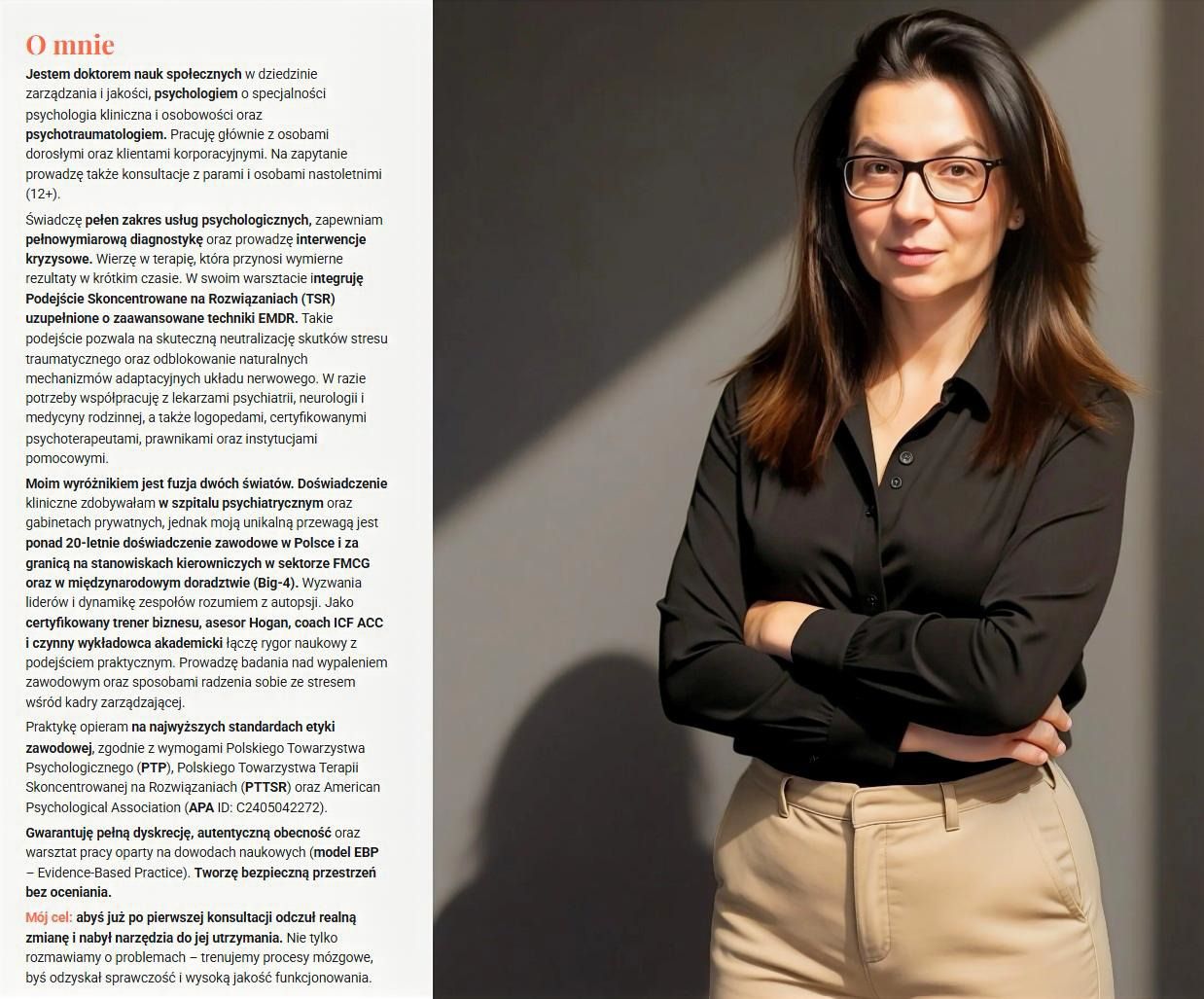 Bardzo polecam w sytuacjach kryzysowych w pracy. Świetny psycholog i widać, że zna realia biznesu. Trafiłam z powodu mobbingu i ogromnego poczucia niezrozumienia ze strony mojego szefa. Nocne emaile i...