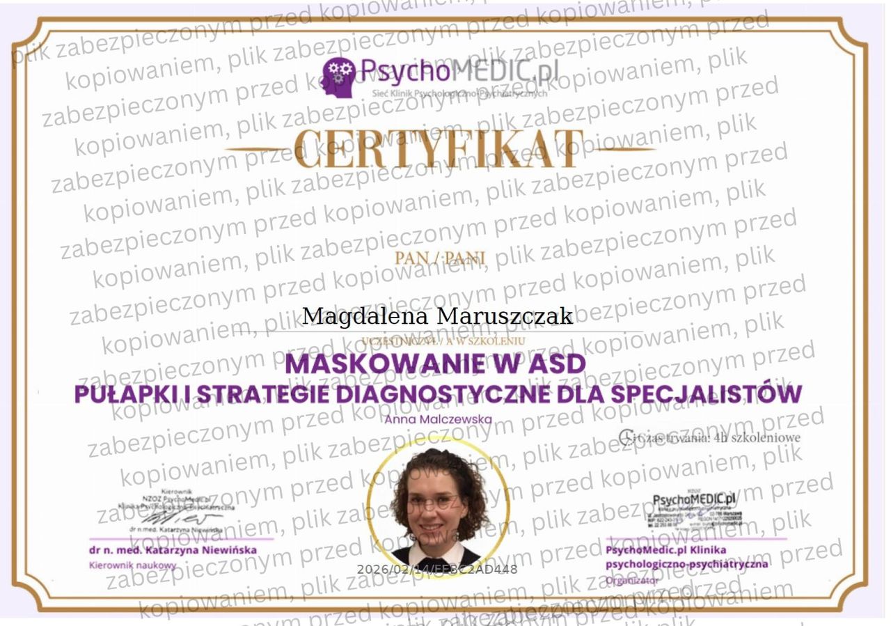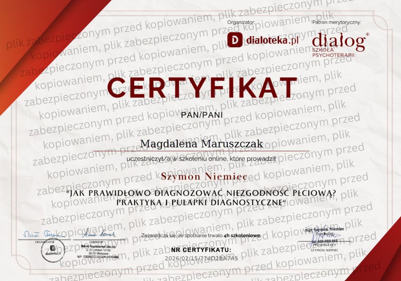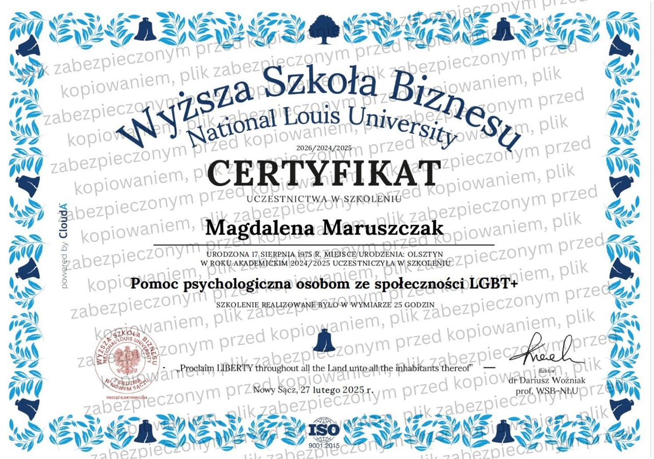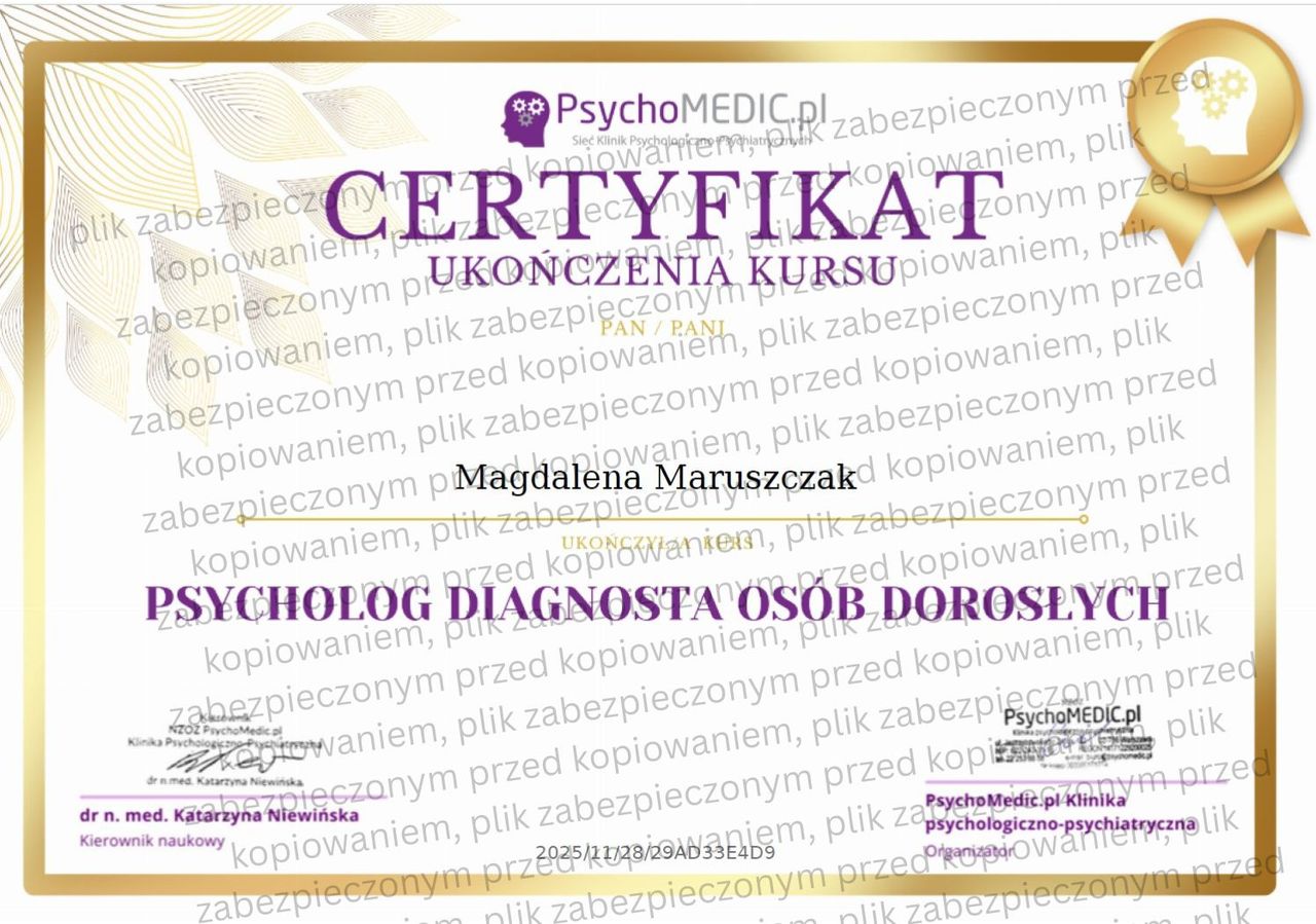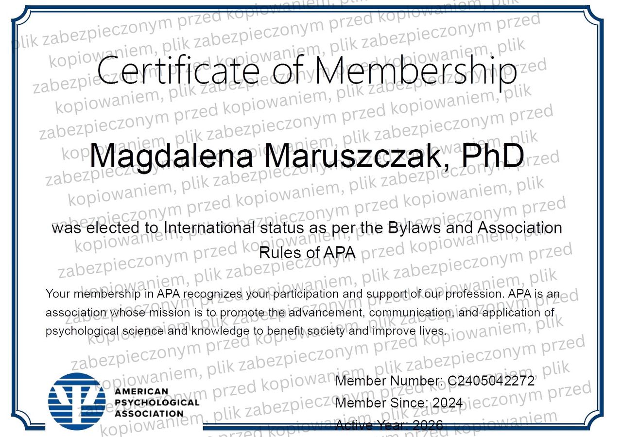 Oferuję także pełną diagnostykę, autorskie narzędzia pracy oraz sporządzam opinie psychologiczne. Pracuję zgodnie z najwyższymi standardami etyki zawodowej, wyznaczonymi przez Polskie Towarzystwo Psychologiczne (PTP) oraz American Psychological Association (APA).