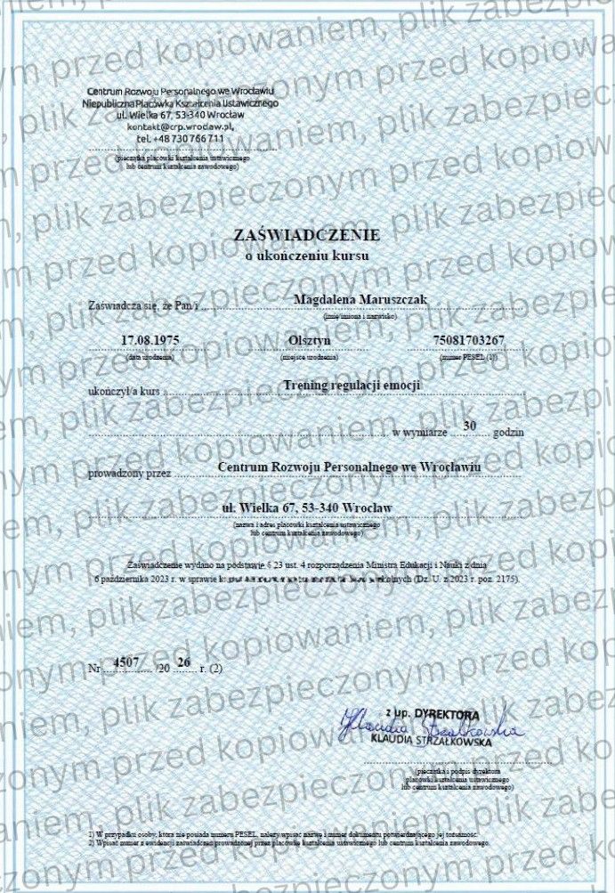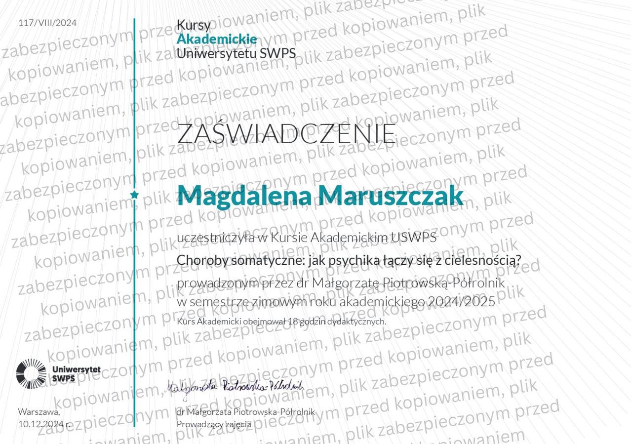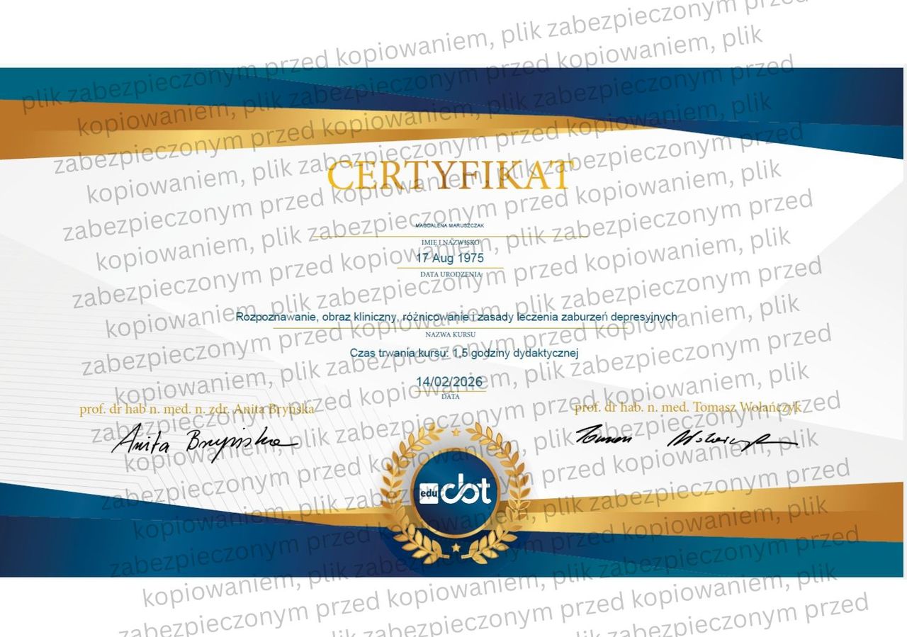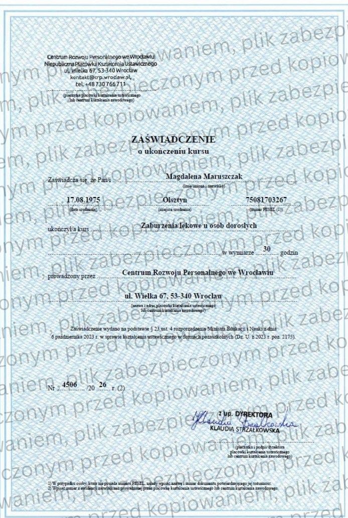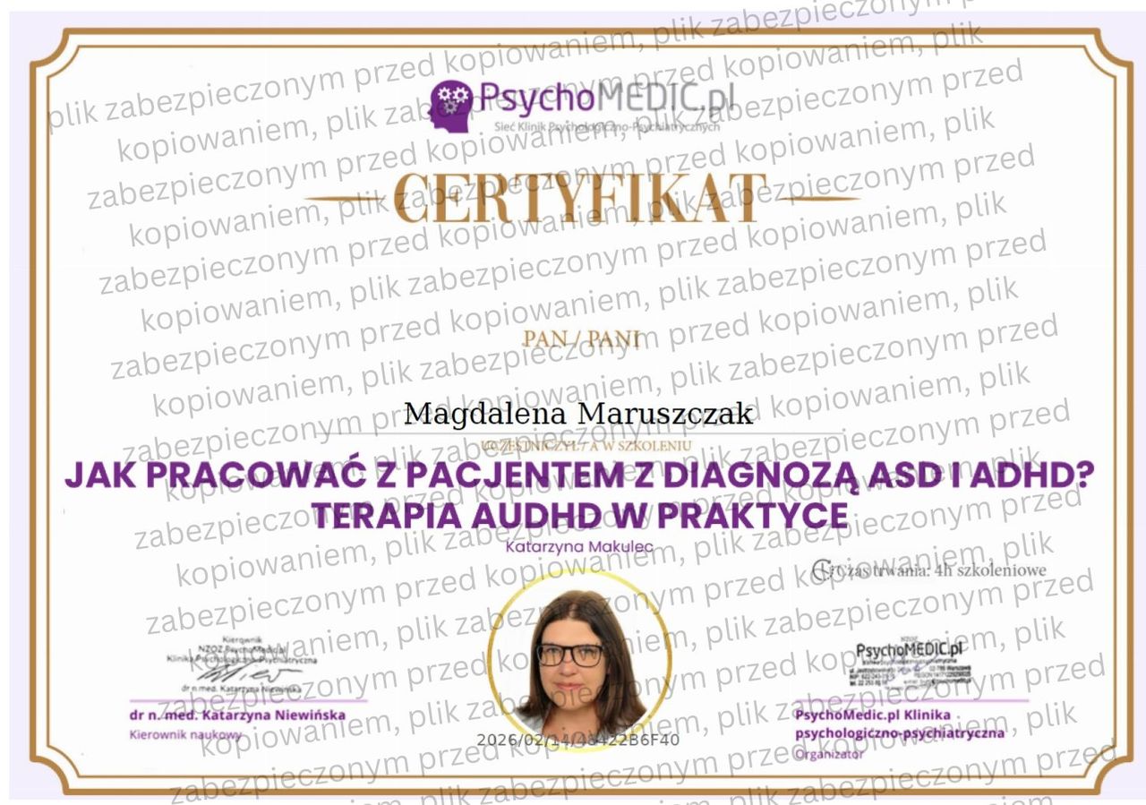 Oferuję także pełną diagnostykę, autorskie narzędzia pracy oraz sporządzam opinie psychologiczne. Pracuję zgodnie z najwyższymi standardami etyki zawodowej, wyznaczonymi przez Polskie Towarzystwo Psychologiczne (PTP) oraz American Psychological Association (APA).