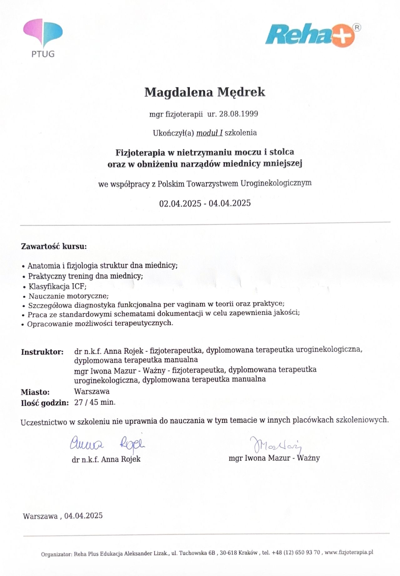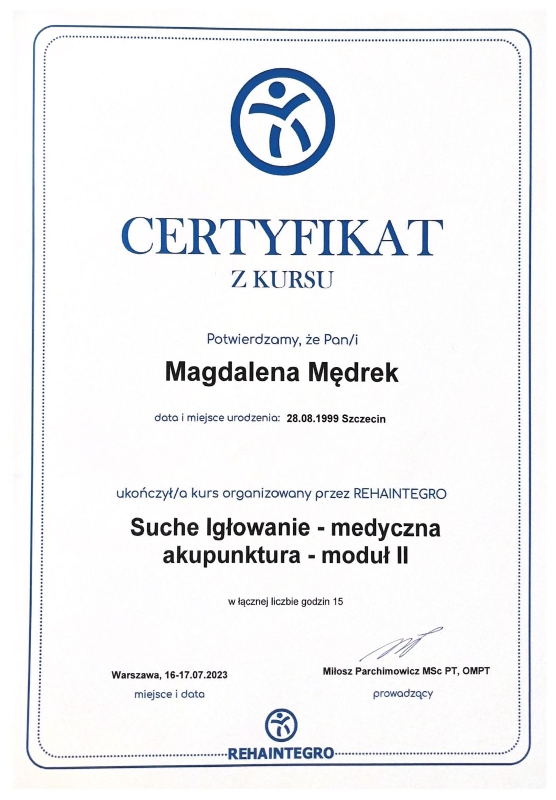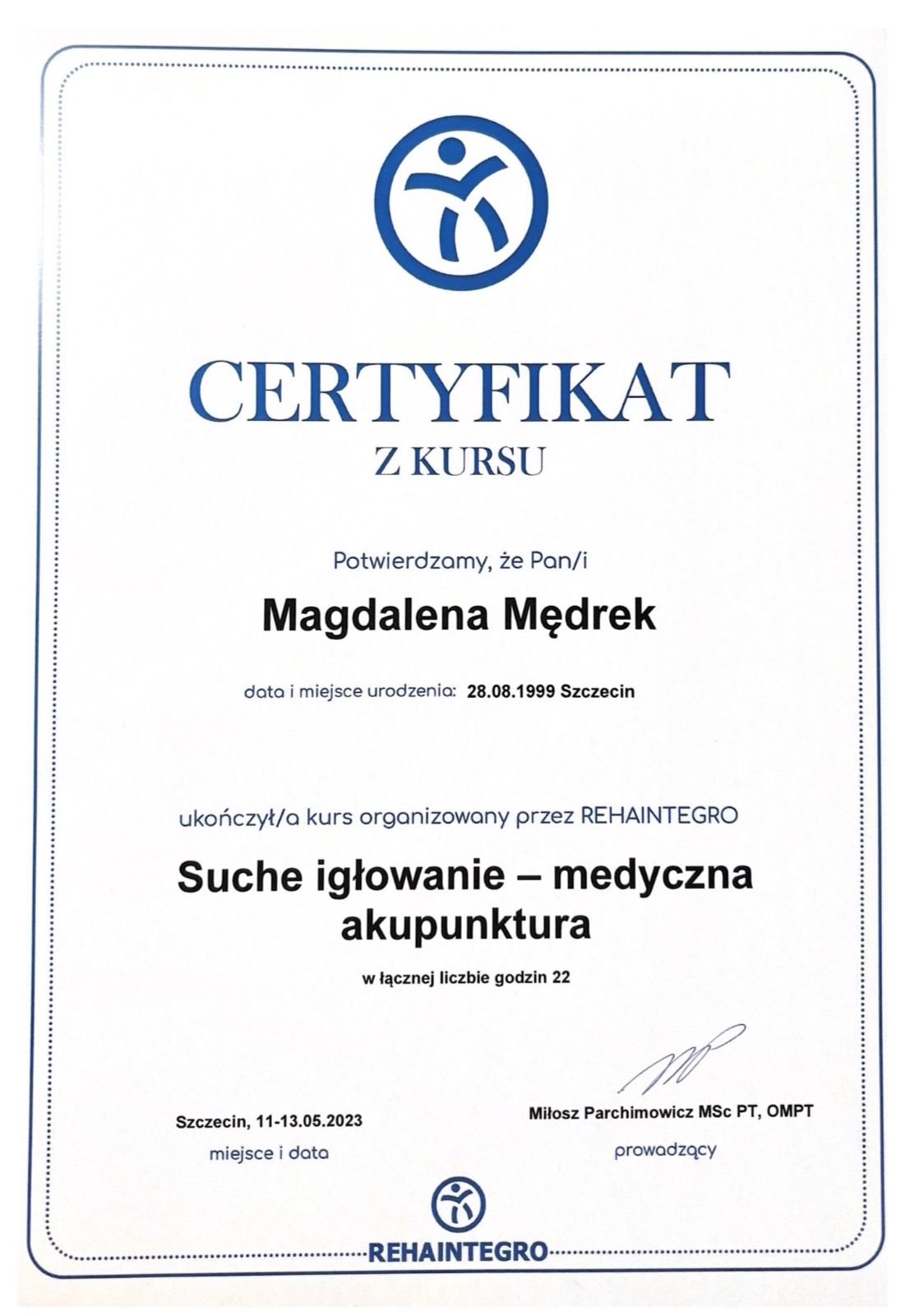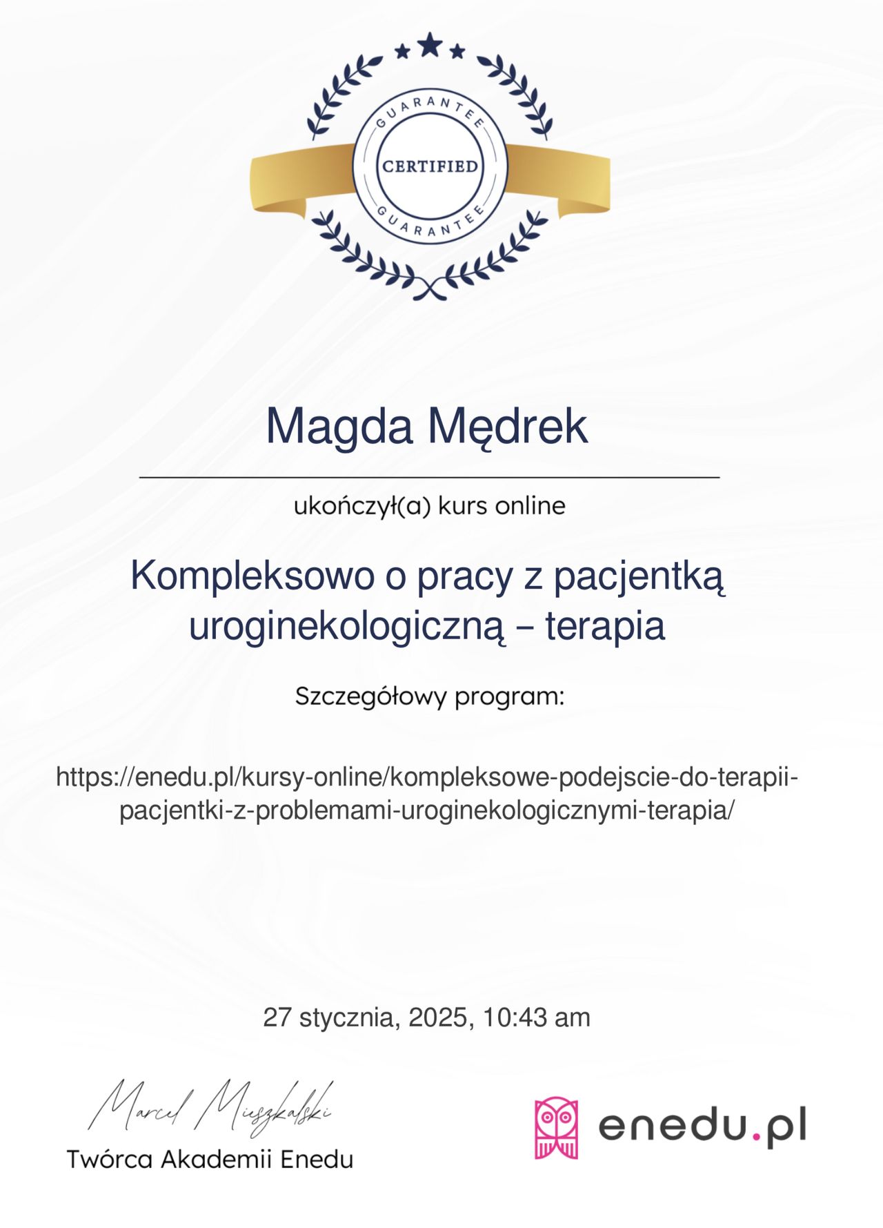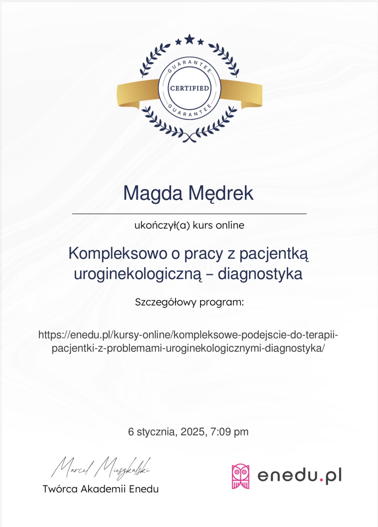 Jaki jest zakres porad oferowanych przez Magdalena Mędrek?Magdalena Mędrek to fizjoterapeuta. Na podstawie swojego doświadczenia i wykształcenia Magdalena Mędrek oferuje usługi takie jak: konsultacja fizjoterapeutyczna, Dry Needling suche igłowanie, kinesiotaping, fizjoterapia w zaburzeniach seksualnych, fizjoterapia dna miednicy, Fizjoterapia endometriozy, Fizjoterapia pourazowa, fizjoterapia, fizjoterapia uroginekologiczna, Igłoterapia sucha (pierwsza wizyta).