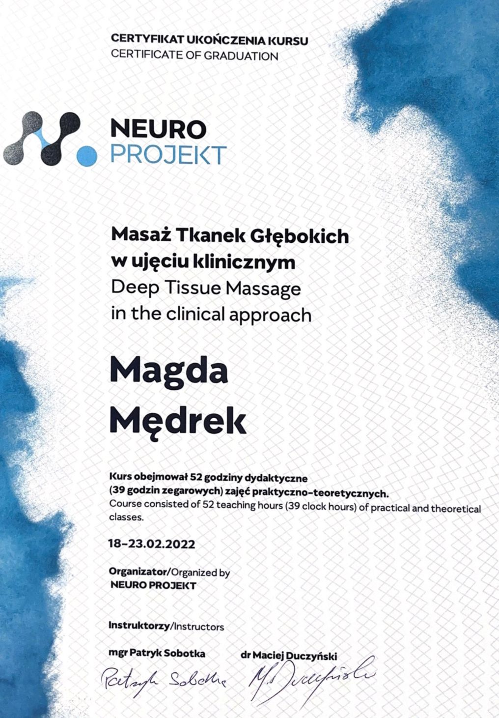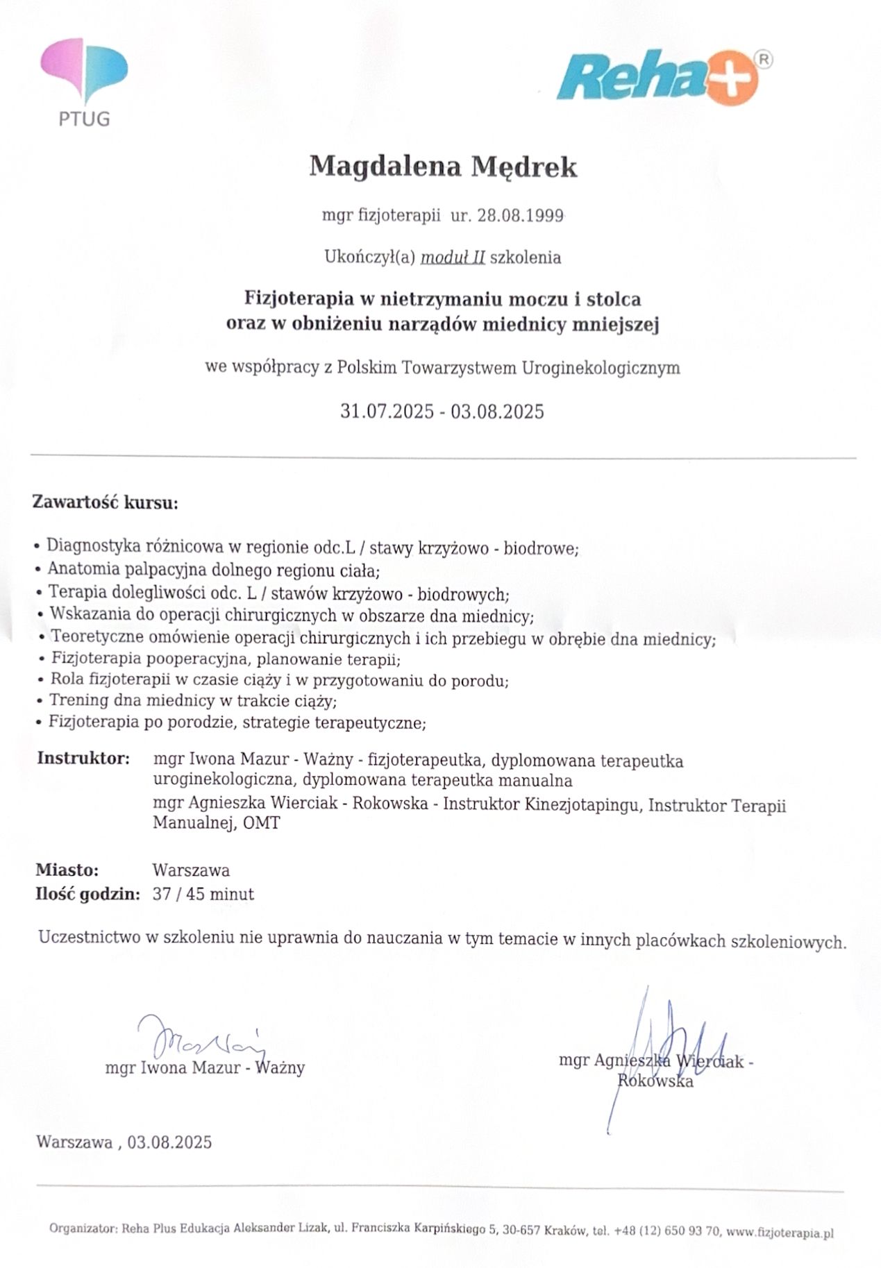 Bardzo polecam zajęcia z Panią Magdą. Kompetentna, sympatyczna i zaangażowana fizjoterapeutka. Zaproponowana terapia łącząca masaż i ćwiczenia pomogła bez większych trudności wrócić do pełni sprawności po operacji kolana. Bardzo dziękuję za poświęcony czas.