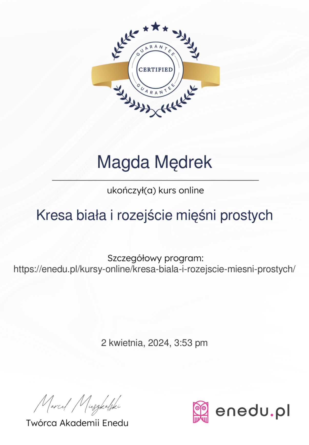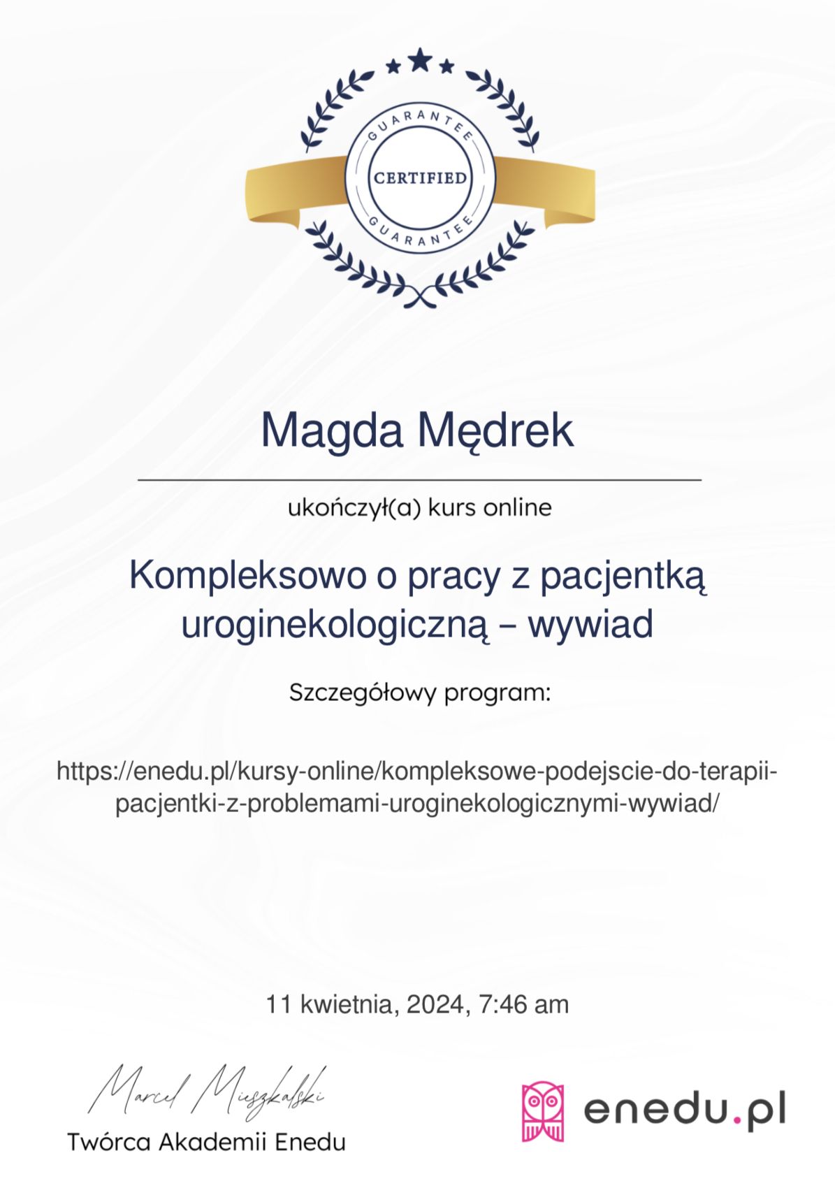 Czy Magdalena Mędrek przyjmuje online, bez konieczności pojawiania się w placówce?Nie, w tym momencie Magdalena Mędrek nie oferuje konsultacji online.