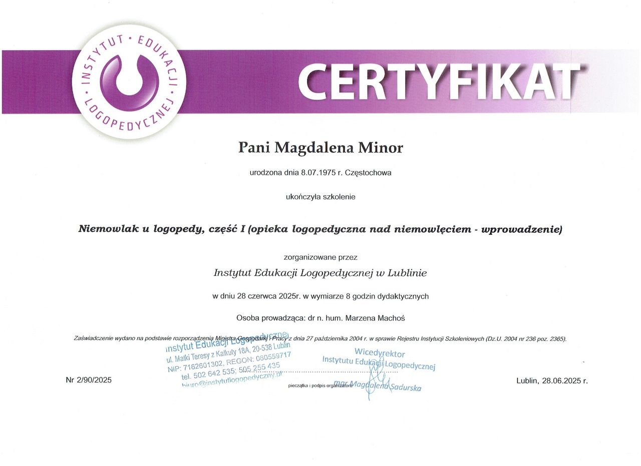 Trafiliśmy do Pani Mgr Magdaleny Minor z problemem ssania i otwartej buzi u 2,5-miesięcznego niemowlaka. W czasie wizyty zostało sprawdzone m.in. wędzidełko i przebieg procesu karmienia. Na szczęście okazało się, że ze strony logopedycznej wszystko jest w porządku, jednak Pani Magdalena poświęciła nam dużo czasu na analizę możliwych przyczyn naszych problemów i skierowała do innych specjalistów. Dodatkowo zwróciła uwagę na trudności oddechowe naszego Maluszka, dzięki czemu w porę zareagowaliśmy z wizytą u pediatry i udało się nam uniknąć pobytu w szpitalu.