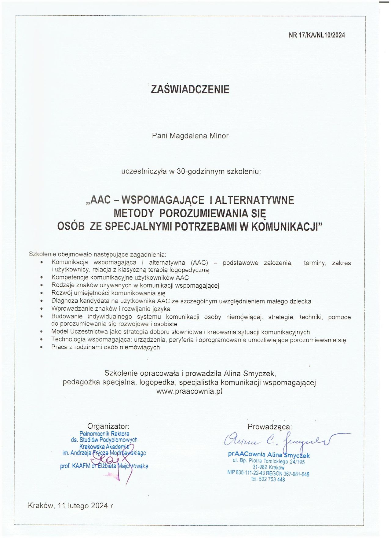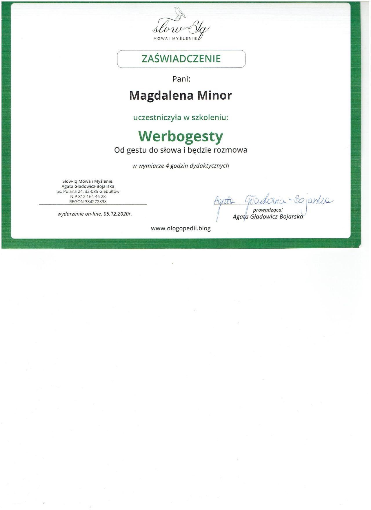 Jaki jest zakres porad oferowanych przez Magdalena Minor?Magdalena Minor to logopeda. Na podstawie swojego doświadczenia i wykształcenia Magdalena Minor oferuje usługi takie jak: diagnoza logopedyczna, konsultacja logopedyczna dzieci, konsultacja neurologopedyczna dzieci, terapia neurologopedyczna dzieci, diagnoza neurologopedyczna, terapia logopedyczna dzieci, wczesna interwencja terapeutyczna, diagnoza neurologopedyczna z opinią, diagnoza logopedyczna z opinią, stymulacja rozwoju mowy.