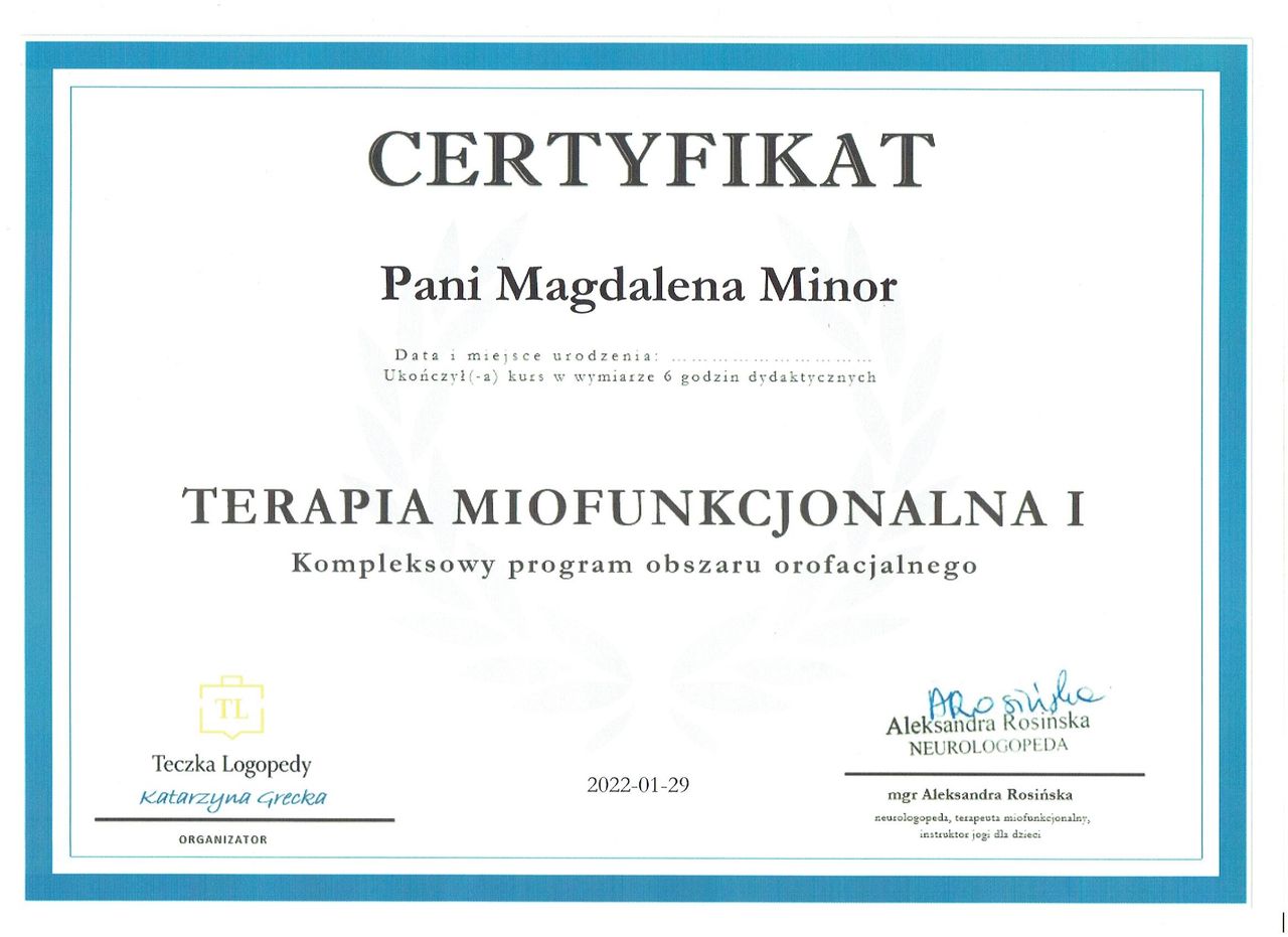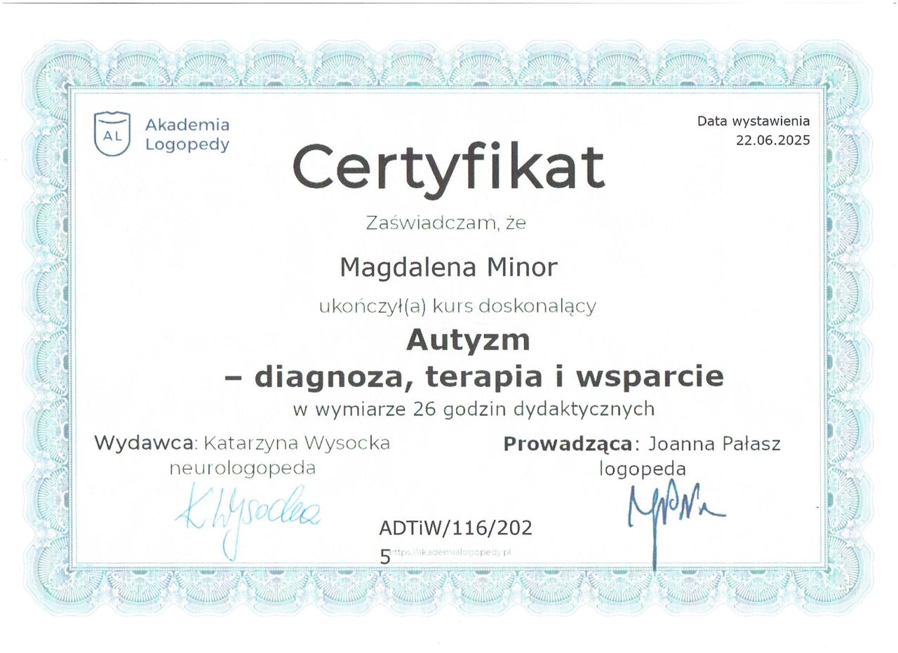 Wizyta u Pani Magdaleny Minor była bardzo przyjemna. Pani neurologopeda podchodzi do dzieci z ogromną cierpliwością i empatią – moje dziecko czuło się bezpiecznie i spokojnie. Wszystko dokładnie wyjaśniła, dała praktyczne wskazówki i wskazała, nad czym pracować w domu. Czuję się naprawdę spokojna, że trafiliśmy w dobre ręce. Serdecznie polecam każdemu rodzicowi!