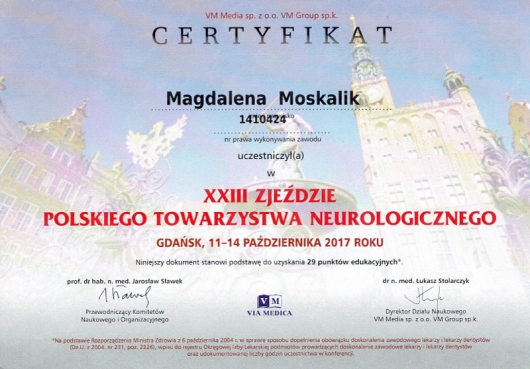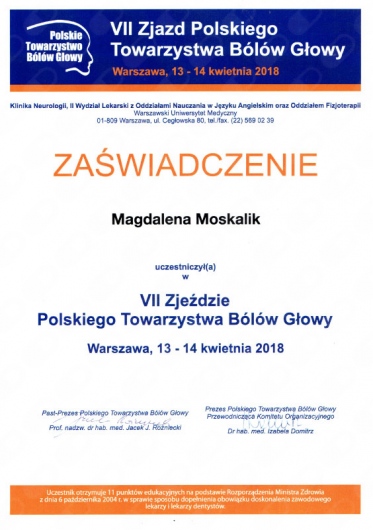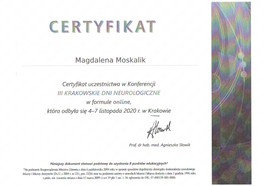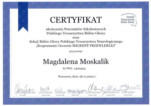 Jaki jest zakres porad oferowanych przez Magdalena Moskalik?Magdalena Moskalik to neurolog. Na podstawie swojego doświadczenia i wykształcenia Magdalena Moskalik oferuje usługi takie jak: konsultacja neurologiczna (kolejna wizyta), konsultacja neurologiczna (pierwsza wizyta), Leczenie migreny przy pomocy toksyny botulinowej, Konsultacja neurologiczna.