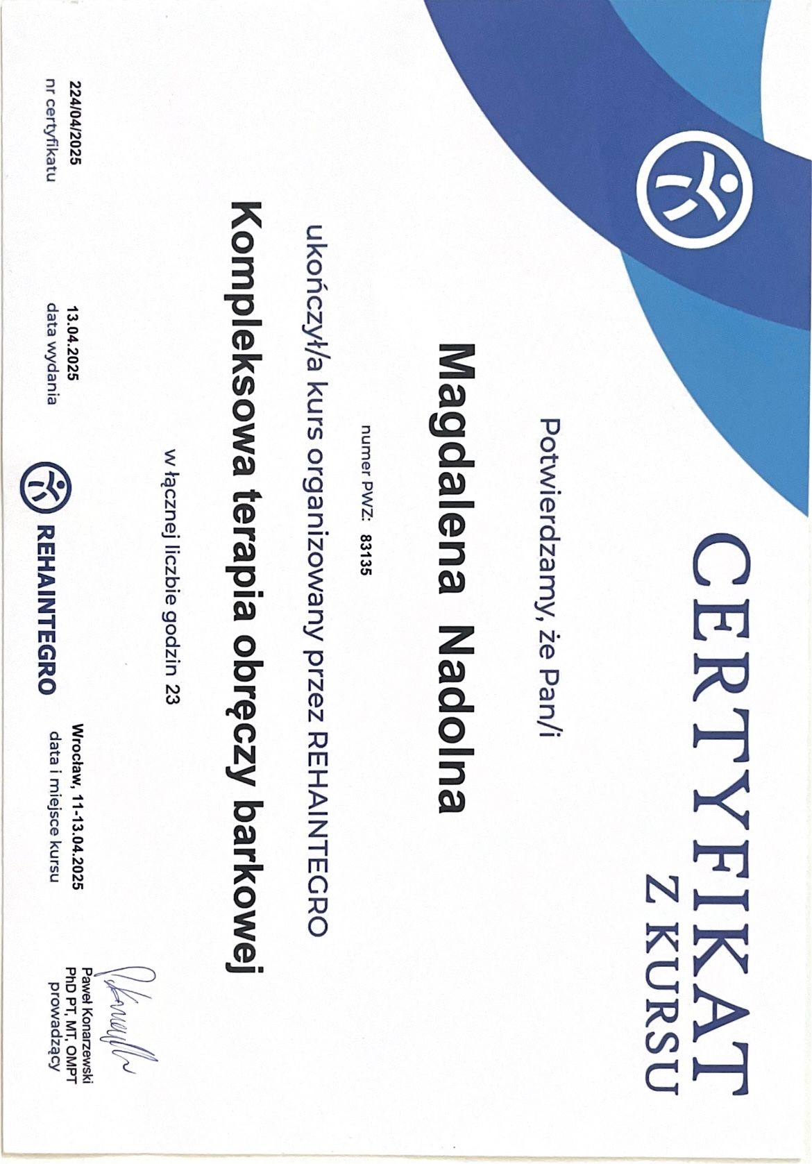 Jaki jest zakres porad oferowanych przez Magdalena Nadolna?Magdalena Nadolna to fizjoterapeuta. Na podstawie swojego doświadczenia i wykształcenia Magdalena Nadolna oferuje usługi takie jak: Drenaż limfatyczny, Masaż leczniczy, masaż relaksacyjny, rehabilitacja, Terapia manualna, terapia powięziowa, terapia mięśniowo-powięziowa, trening funkcjonalny, medyczny trening rehabilitacyjny, fizjoterapia.