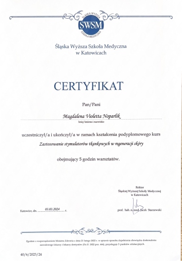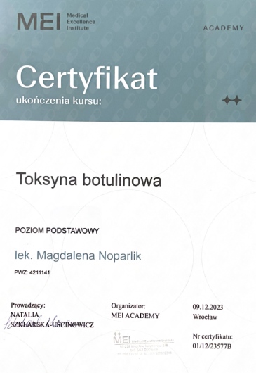 Jaki jest zakres porad oferowanych przez Magdalena Noparlik?Magdalena Noparlik to lekarz wykonujący zabiegi medycyny estetycznej, w trakcie specjalizacji (alergolog). Na podstawie swojego doświadczenia i wykształcenia Magdalena Noparlik oferuje usługi takie jak: Konsultacja z zakresu medycyny estetycznej, Botox - toksyna botulinowa, Laser Alma, Stymulator tkankowy CG Styler 600, Dr Cyj, Laser frakcyjny CO2, mezoterapia igłowa, Nucleofill, Osocze bogatopłytkowe, wolumetria.