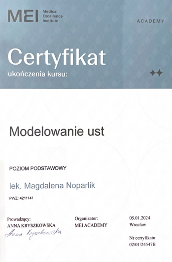 Miałam przyjemność modelować usta u Pani Doktor. Bardzo sympatyczna i oczywiście profesjonalna osoba, która wie co robi. Wiedza, olbrzymie umiejętności i indywidualne podejście do pacjenta Jestem bardzo zadowolona z efektu i na pewno powrócę.