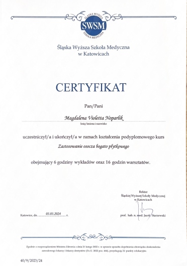 Serdecznie polecam Panią Doktor! Udałam się na wizytę w celu omówienia możliwości wykonania lasera CO2 wraz z osoczem bogatopłytkowym. Pani Doktor dokładnie omówiła zakres zabiegu, przedstawiła spodziewane efekty i ewentualne przeciwwskazania. Po szczegółowej rozmowie, na kolejnej wizycie mogłyśmy przystąpić do działania. W trakcie spotkań panowała bardzo miła atmosfera dzięki czemu nie odczuwałam stresu związanego z zabiegiem. Aktualnie jestem kilka tygodni po zabiegu a efekty są wspaniałe! Gorąco polecam!