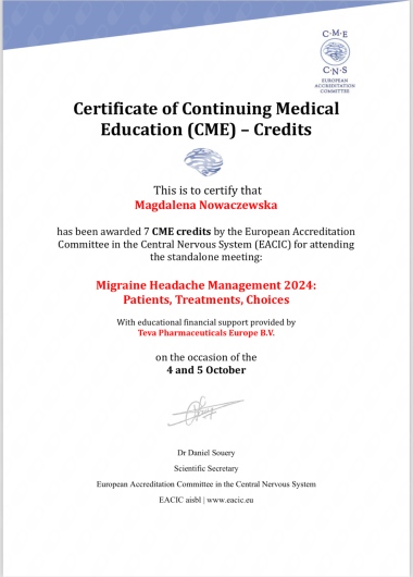 Jestem członkiem Polskiego Towarzystwa Neurologicznego, Polskiego Towarzystwa Neurosonologii, International Headache Society, American Interventional Headache Society