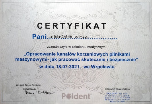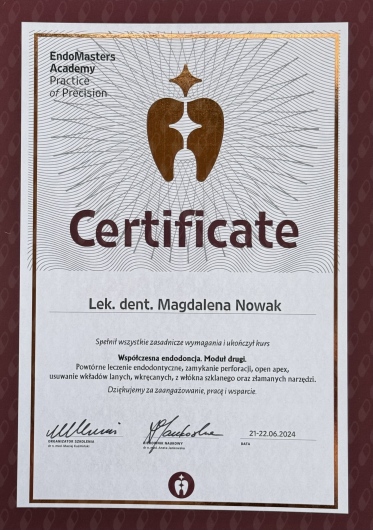 Dzień dobry! Jestem absolwentką kierunku lekarsko-dentystycznego Uniwersytetu Medycznego im. Piastów Śląskich we Wrocławiu. W swojej praktyce wykonuję zabiegi z zakresu endodoncji mikroskopowej (leczenie pierwotne i powtórne), stomatologią zachowawczą i chirurgii stomatologicznej (ekstrakcje). Zajmuję się również stomatologię interwencyjną. Do codziennej pracy używam powiększenia w postaci lup zabiegowych, co w znaczący sposób poprawia komfort pracy i zapewnia precyzyjne wykonanie procedur. Ponadto realizuję program specjalizacji ze stomatologii zachowawczej z endodoncją w Uniwersyteckim Centrum Stomatologicznym w Gdańsku. Nieustannie podnoszę swoje kwalifikacje z zakresu różnych dziedzin stomatologicznych dzięki udziałom w konferencjach i szkoleniach, żeby zapewnić Pacjentowi profesjonalną opiekę i metody leczenia zgodne z aktualną wiedzą medyczną. Zależy mi na tym, aby podczas wizyty w Gabinecie panowała przyjemna atmosfera, Pacjent czuł się zaopiekowany i finalnie był zadowolony z efektów leczenia po wyjściu z Gabinetu.