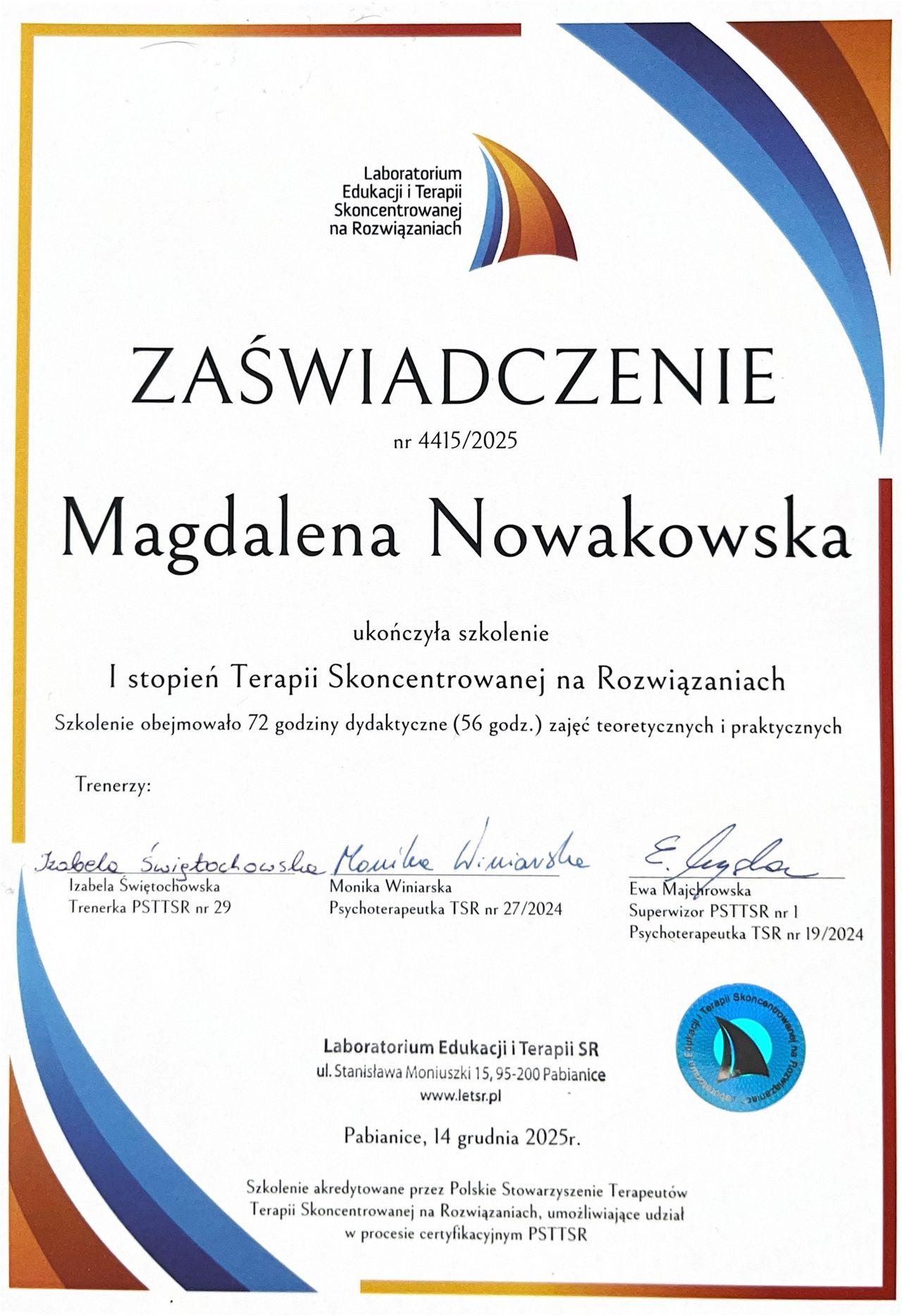 Nazywam się Magdalena Nowakowska, jestem magistrem psychologii. Swoją wiedzę i doświadczenie zdobywałam zarówno podczas pracy w fundacjach, jak i w ramach wolontariatu. Stale poszerzam swoje kompetencje, uczestnicząc w kursach, szkoleniach oraz superwizjach, które pozwalają mi dbać o wysoką jakość świadczonej pomocy.