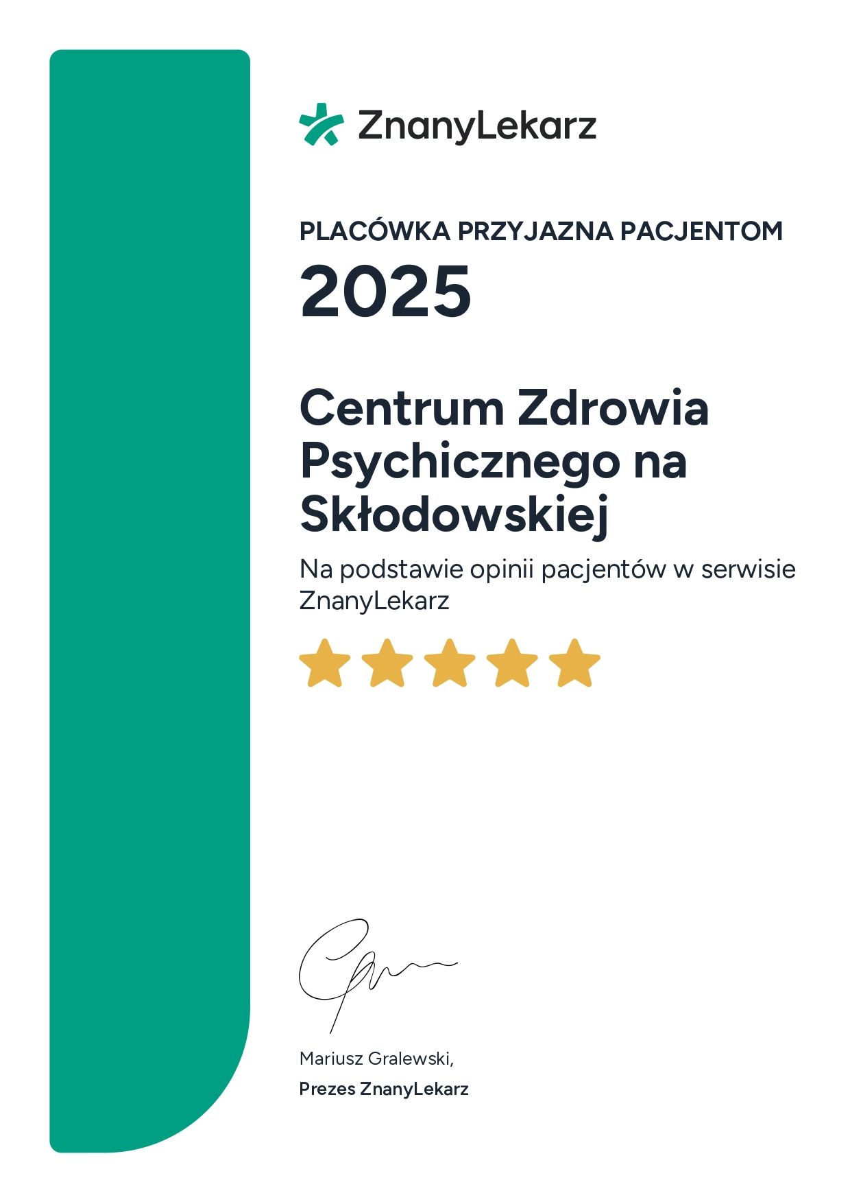 Administratorem danych osobowych jest ZnanyLekarz sp. z o.o. z siedzibą w Warszawie przy ul. Kolejowej 5/7. Informujemy, że po przekazaniu przez nas Twoich danych osobowych wybranemu przez Ciebie Profesjonaliście, staje się on również administratorem Twoich danych osobowych i przetwarza je w celach związanych ze świadczeniem usług medycznych lub innych podobnych.