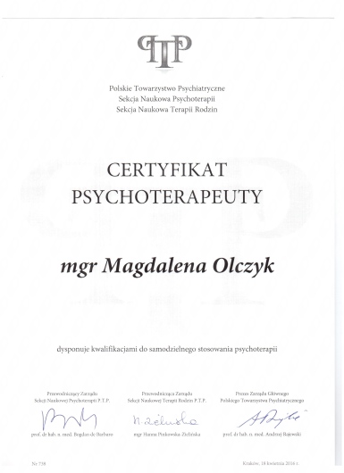Jaki jest zakres porad oferowanych przez Magdalena Olczyk?Magdalena Olczyk to psychoterapeuta certyfikowany, psycholog. Na podstawie swojego doświadczenia i wykształcenia Magdalena Olczyk oferuje usługi takie jak: psychoterapia indywidualna, Konsultacja do psychoterapii, konsultacja do terapii grupowej, psychoterapia grupowa, konsultacja psychoterapeutyczna, psychoterapia par i małżeństw, psychoterapia par, Konsultacja pary, konsultacja online, superwizja.