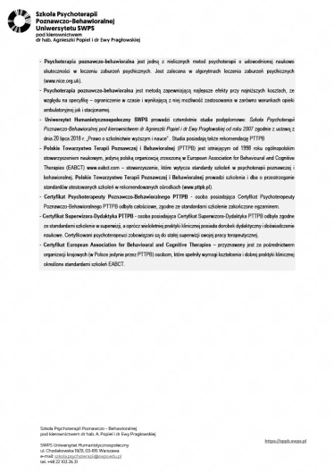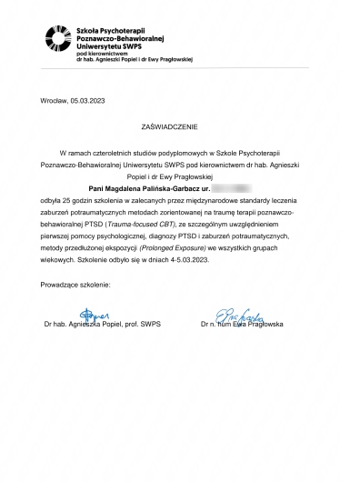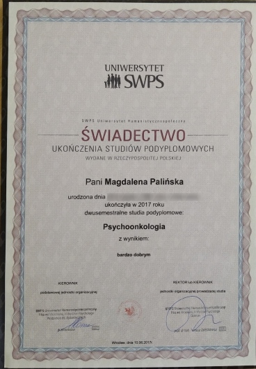 Z wykształcenia jestem psychologiem, ukończyłam studia magisterskie na Uniwersytecie Śląskim w Katowicach. Jestem absolwentką studiów podyplomowych Uniwersytetu SWPS na kierunku psychoonkologia oraz seksuologia kliniczna. W czerwcu 2025r. kończyłam 4-letnią Szkołę Psychoterapii Poznawczo-Behawioralnej SWPS we Wrocławiu - nadal jestem w procesie certyfikacji, oczekuję na egzamin certyfikacyjny. Swoją pracę poddaję regularnej superwizji. Jestem członkiem Polskiego Towarzystwa Terapii Poznawczej i Behawioralnej oraz Polskiego Towarzystwa Seksuologicznego. Jako terapeuta w trakcje certyfikacji posiadam rekomendację Polskiego Towarzystwa Terapii Poznawczej i Behawioralnej- można odszukać mnie na mapie terapeutów wpisując w wyszukiwarce na stronie adres mojego Gabinetu. Doświadczenie kliniczne w zawodzie psychologa zdobywałam m.in. w pracy w Szpitalu Nefrolux w Siemianowicach Śląskich, Hospicjum Opolskim Betania w Opolu, Opolskim Centrum Onkologii w Opolu oraz Specjalistycznej Poradni Psychologiczno-Seksuologicznej we Wrocławiu. Odbyłam staż kliniczny w Poradni Seksuologicznej i Patologii Współżycia w Warszawie. Odbyłam również staż kliniczny na Oddziale Psychiatrycznym całododobowym w Szpitalu Wielospecjalistycznym w Legnicy. Swoje zainteresowania zawodowe wiążę m.in. z dziedziną jaką jest onkoseksuologia, która skupia się na wsparciu seksuologicznym osób chorych onkologicznie. Zapraszam na konsultacje osoby dorosłe, które doświadczają trudności natury psychologicznej, seksuologicznej lub psychoonkologicznej. Oferuję psychoterapię indywidualną oraz psychoterapię par i małżeństw. Przyjmuję pacjentów stacjonarnie w gabinecie we Wrocławiu oraz on-line (WhatsApp). W celu rezerwacji sesji on-line(WhatsApp) pacjent zobowiązuje się przedpłacić ją co najmniej 24h przed umówionym spotkaniem, w przeciwnym razie rezerwacja zostaje odwołana. Wizyty, które pacjent zarezerwował, a na których nie pojawił się/ nie mógł się pojawić/ nie odwołał ich 24h przed terminem spotkania traktuję jako wizyty pełnopłatne (zarówno stacjonarne jak i on-line(WhatsApp)), wyjątek stanowić będą sytuacje niezależne od woli pacjenta/klienta. Szczegółowe warunki współpracy ustalane będą indywidualnie z pacjentem/klientem. Nie wystawiam opinii psychologicznych/seksuologicznych, a jedynie zaświadczenia o odbytym spotkaniu. Decydując się na wizytę akceptujecie Państwo powyższe zasady regulaminu.
