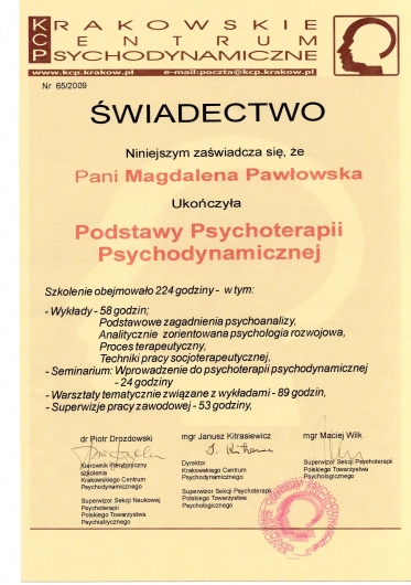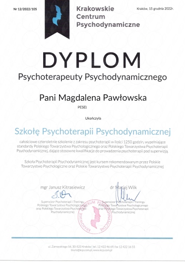 3. W przypadku osób będących w psychoterapii psychodynamicznej obowiązują zasady współpracy określone w kontrakcie terapeutycznym. W związku z dbaniem o efektywność procesu psychoterapii, a także ze względu na rezerwację stałego/wyłącznego terminu psychoterapii dopuszczane są maks. 2 nieobecności w ciągu roku. Pozostałe zasady regulujące spotkania omawiane są na konsultacjach wstępnych.
