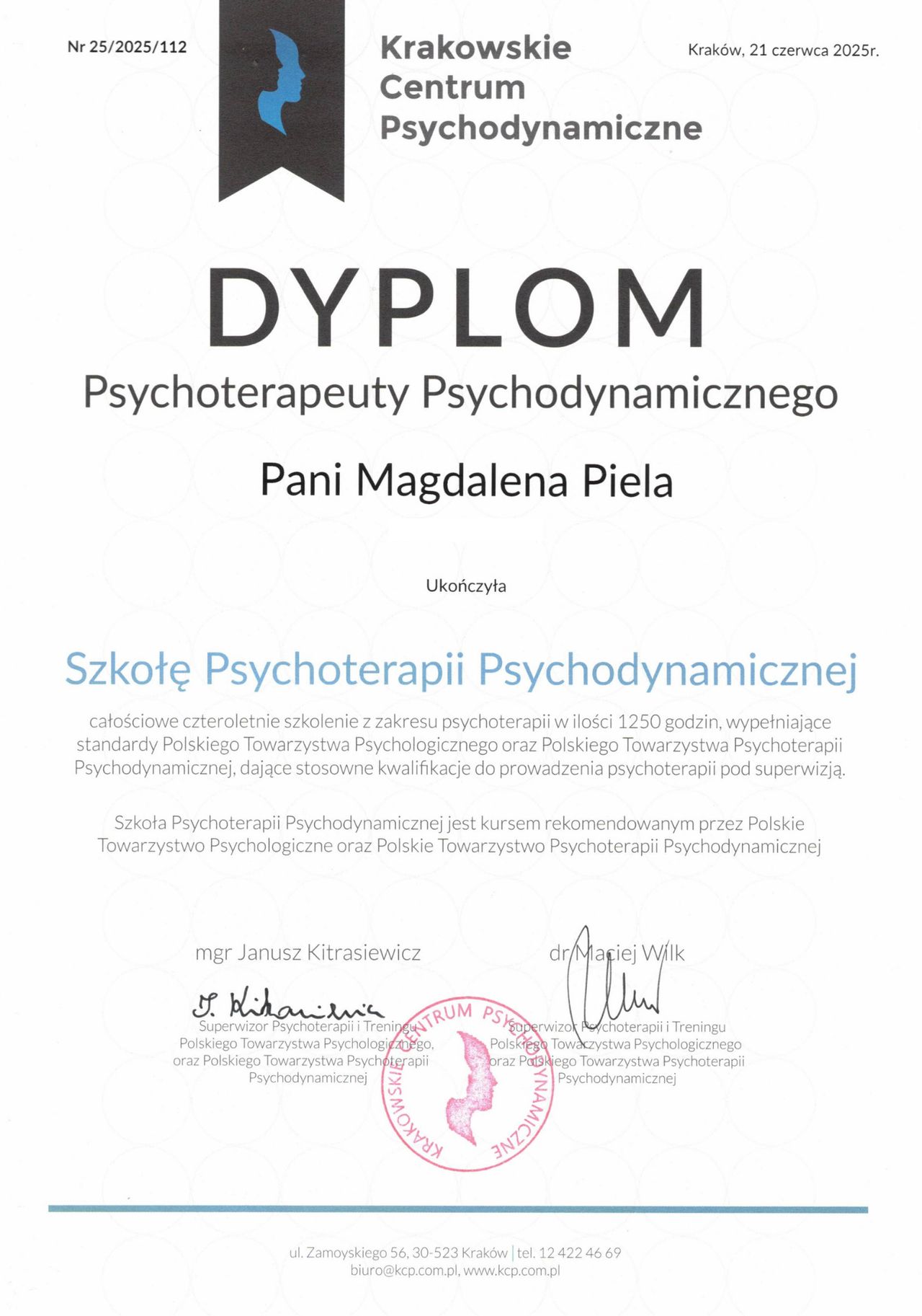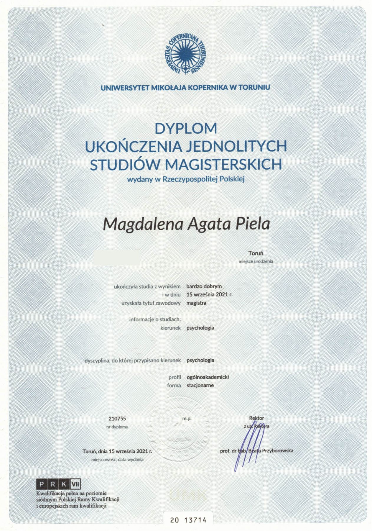 Specjalizuję się w psychoterapii osób z zaburzeniami osobowości (np. borderline, narcystycznym, histrionicznym, schizoidalnym). Pomagam również osobom z następującymi diagnozami: zaburzenia depresyjno-lękowe, choroba afektywna dwubiegunowa (CHAD), zaburzenia odżywiania (m.in. anoreksja i bulimia), zespół stresu pourazowego (PTSD), zaburzenia występujące pod maską somatyczną (m.in. hipochondryczne, bóle psychogenne), zaburzenia obsesyjno-kompulsyjne (OCD).