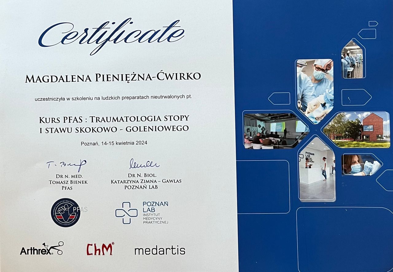 Posiadam wieloletnie doświadczenie zawodowe, które zdobyłam pracując najpierw jako młodszy, następnie jako starszy asystent w Klinice Ortopedii i Chirurgii Urazowej Narządu Ruchu Samodzielnego Publicznego Szpitala Klinicznego im. Adama Grucy w Otwocku, CMKP (2009-2022 r.) oraz na licznych kursach i szkoleniach doskonalących (min. AO Trauma Course – stopień podstawowy i zaawansowany oraz kursach związanych z endoplastyką stawów biodrowego i kolanowego)