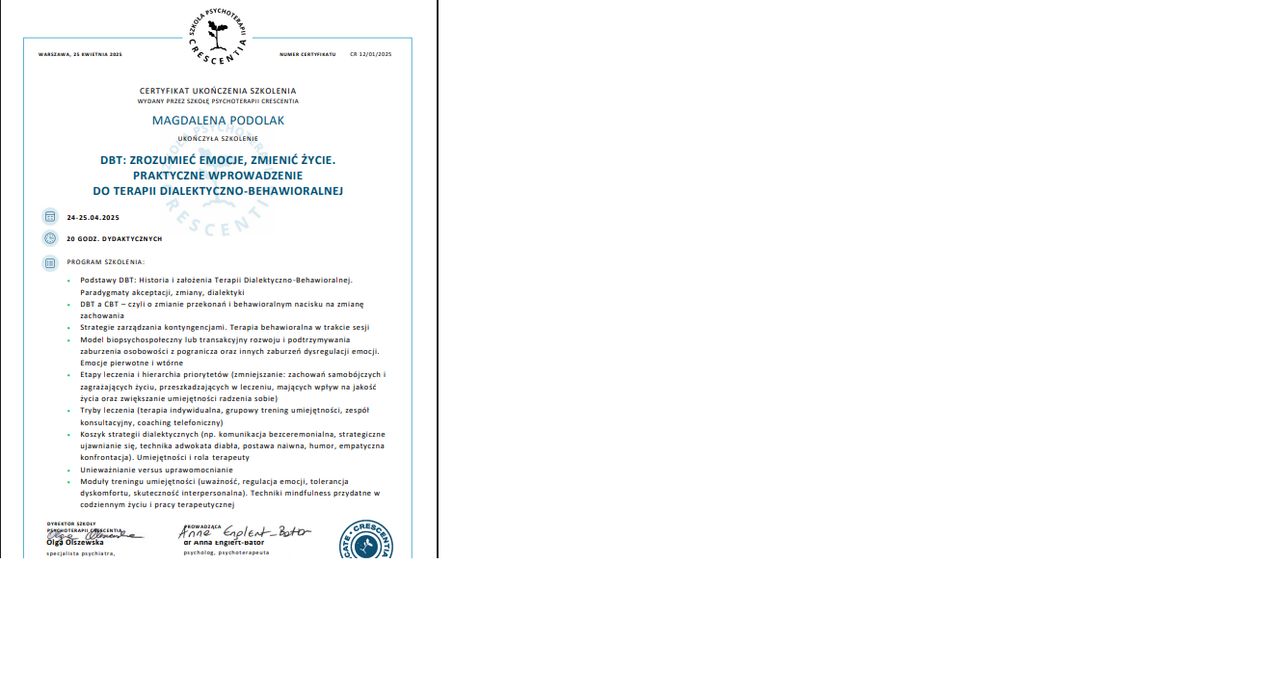 Jestem psychologiem - Uniwersytet Gdański i psychoterapeutką w trakcie czteroletniego szkolenia Terapii Poznawczo-Behawioralnej w Szkole Psychoterapii Crescentia (4 rok). Ukończyłam również dwa stopnie Terapii Skoncentrowanej na Rozwiązaniach. Regularnie korzystam z superwizji i rozwijam swój warsztat poprzez szkolenia.