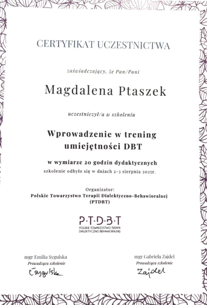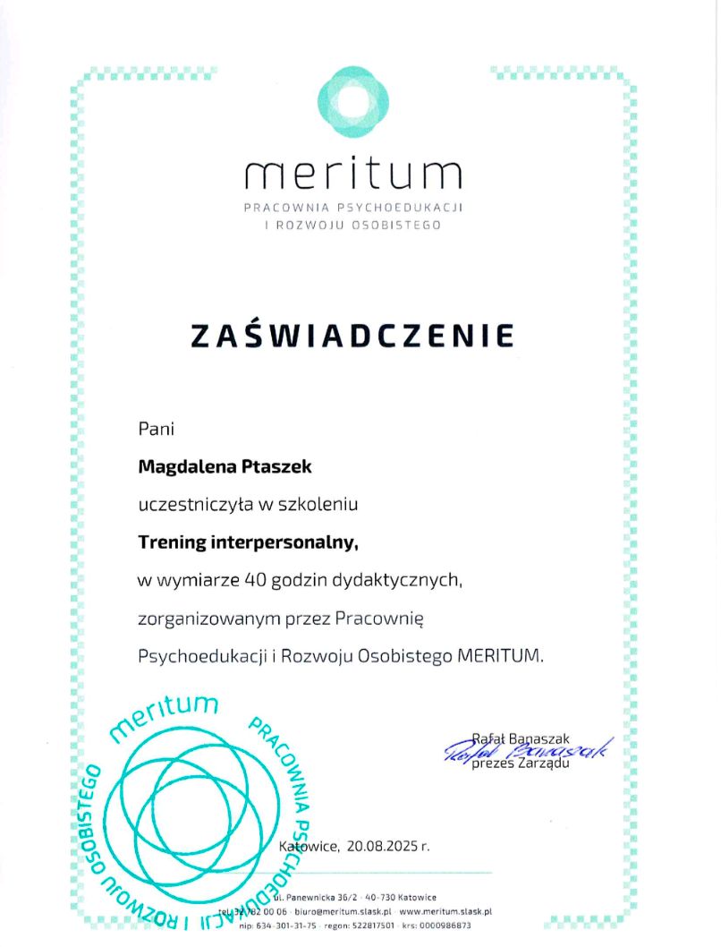 Od pierwszych spotkań czuję się wysłuchana i traktowana z autentyczną uważnością. Pani Magda łączy ciepło i empatię z dużym profesjonalizmem oraz umiejętnością prowadzenia procesu terapeutycznego w sposób przemyślany i konsekwentny. Nawet przy złożonych problemach potrafi nadać pracy jasny kierunek. Dzięki tej terapii łatwiej radzę sobie w trudnych, granicznych momentach życia.