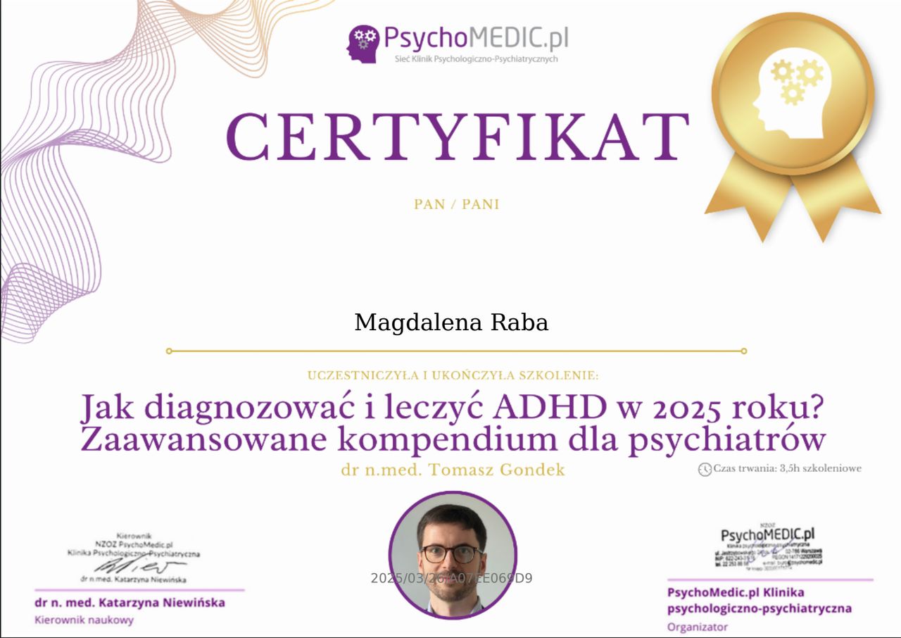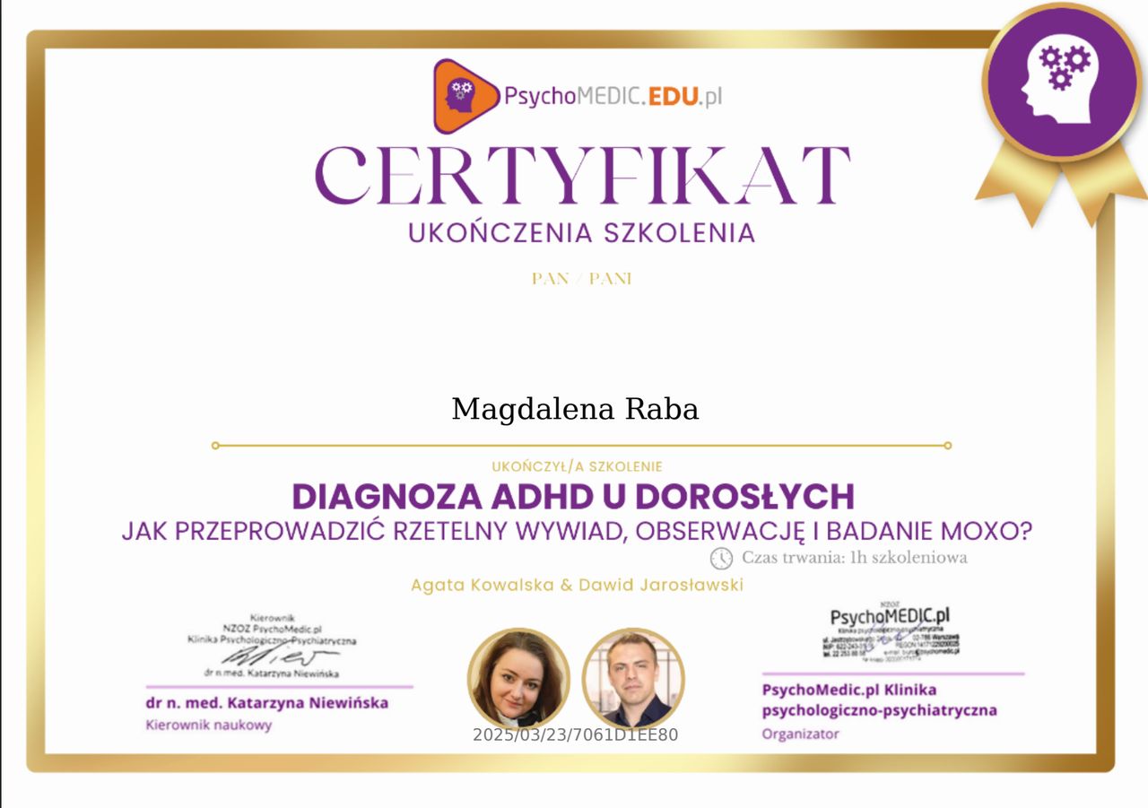 Wizyta przebiegła bardzo dobrze. Pani Magdalena jest empatyczna i zaangażowana, poczułam się wysłuchana. Już na pierwszym spotkaniu otrzymałam cenne informacje zarówno o sobie jak i o procesie diagnozy ADHD. Umówiłam się na kolejne spotkania. Serdecznie polecam gabinet Pani psycholog.