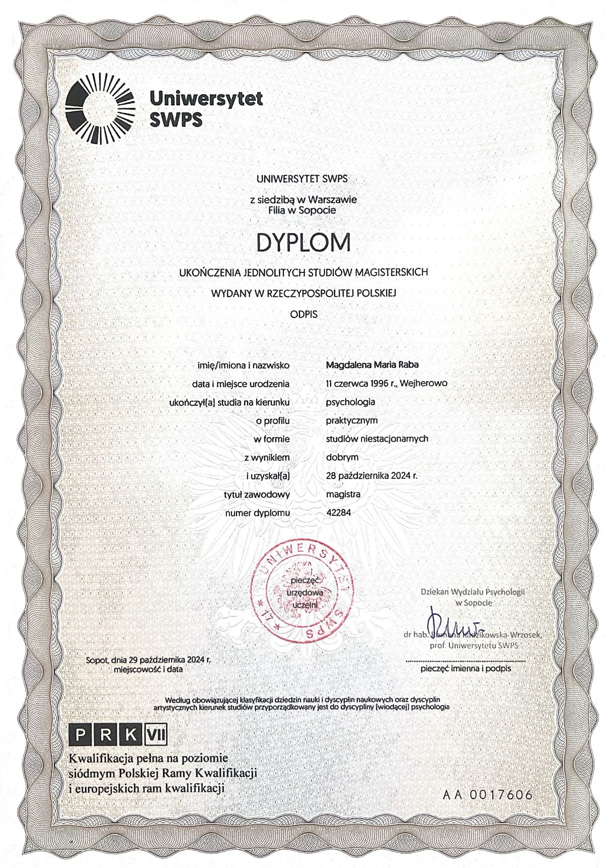 Jestem psychologiem i psychoterapeutą w trakcie szkolenia, a moją misją jest wspieranie osób w odzyskiwaniu równowagi i harmonii w życiu poprzez wspólne poszukiwanie najlepszych rozwiązań. Ukończyłam Uniwersytet SWPS w Sopocie na specjalności klinicznej oraz I stopień Terapii Skoncentrowanej na Rozwiązaniach. Obecnie kształcę się w czteroletniej szkole Psychoterapii Integratywnej oraz na zaawansowanym stopniu terapii skoncentrowanej na rozwiązaniach. Jestem również członkiem Polskiego Towarzystwa Psychoterapii Integratywnej. Dbając o najwyższą jakość mojej pracy, pozostaję w stałej superwizji i terapii własnej. W pracy łączę różne podejścia terapeutyczne, dostosowując metody do indywidualnych potrzeb i sytuacji. Wierzę, że każdy ma w sobie potencjał do zmiany – moim zadaniem jest pomóc odnaleźć drogę do lepszego samopoczucia i życiowej harmonii.