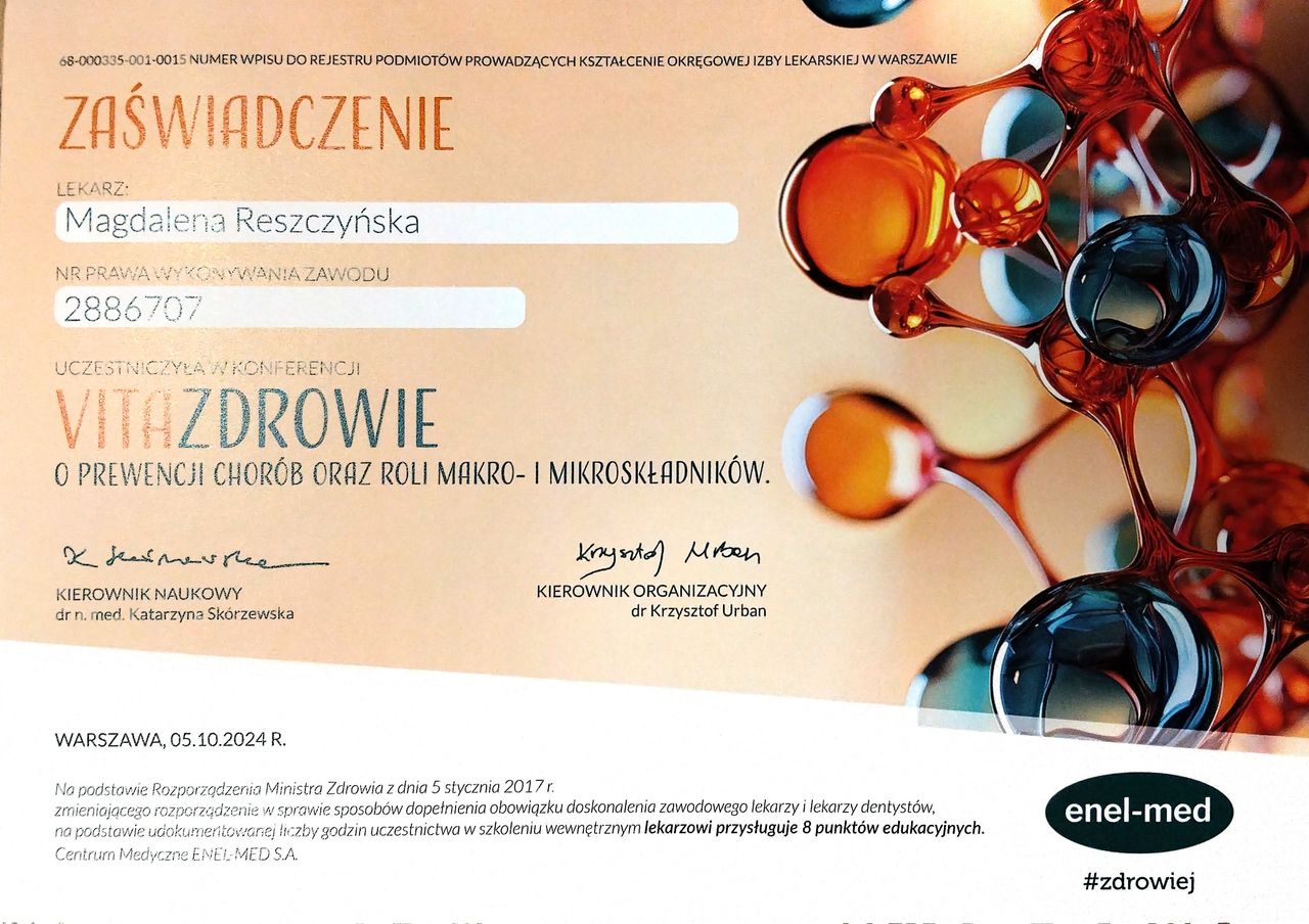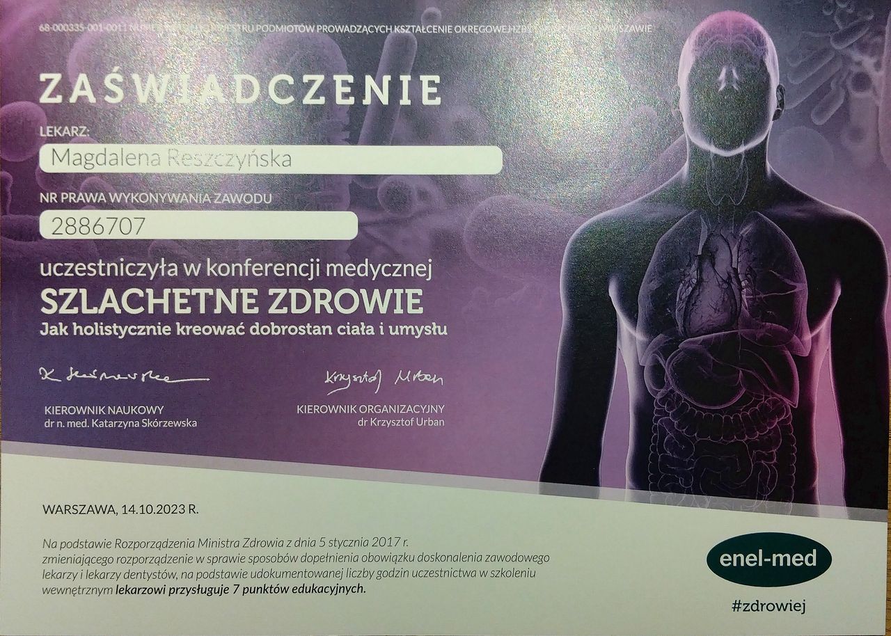 Jestem specjalistą medycyny rodzinnej. Moja pasją jest edukacja zdrowotna. Staram się każdego z moich Pacjentów "zarażać" wiedzą medyczną oraz udzielać wskazówek, jak osiągnąć zdrowie i dobre samopoczucie. Interesuje się również zagadnieniami przewlekłego stresu i jego wpływu na zdrowie.