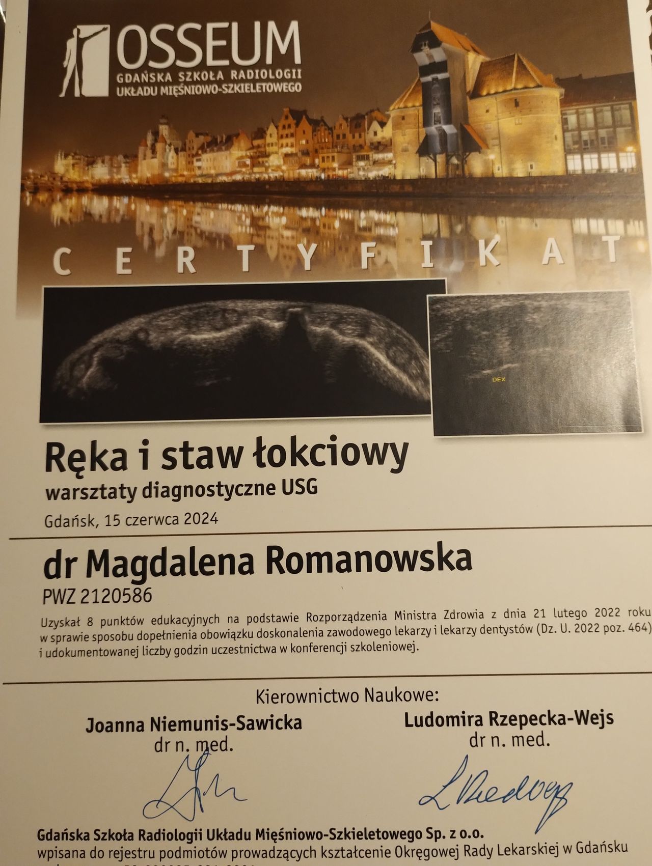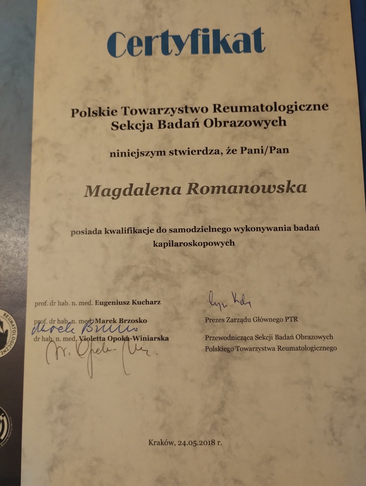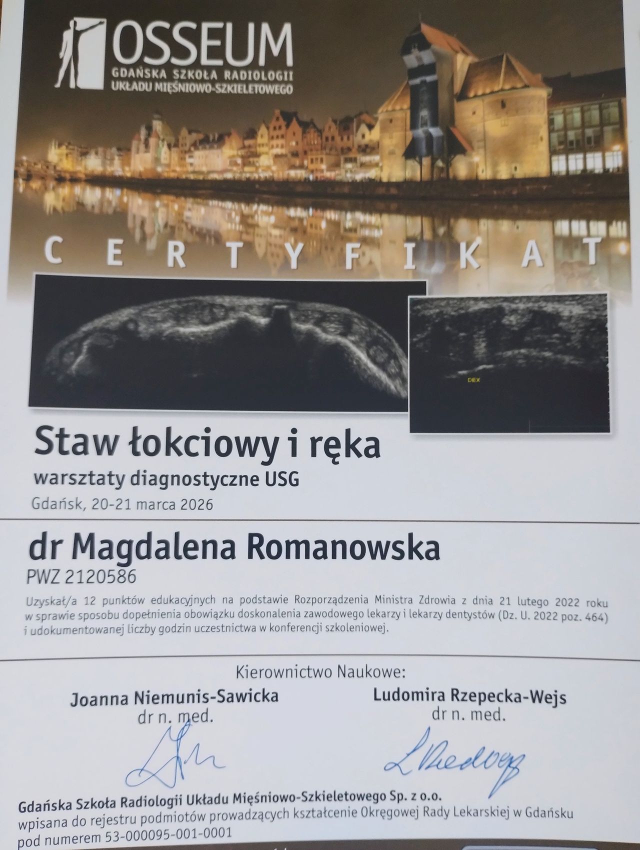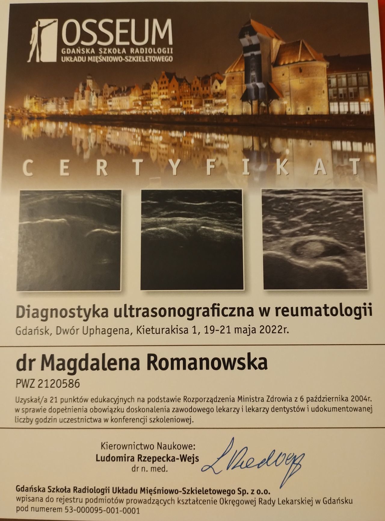 Lek. Magdalena Romanowska SPECJALISTA REUMATOLOGII I CHORÓB WEWNĘTRZNYCH Ukończyła II LO im. K. Jagiellończyka w Elblągu. Studiowała na Akademii Medycznej w Gdańsku na wydziale lekarskim (część praktyk lekarskich poza granicami kraju – Niemcy, Austria) do 2005r . Od 2005 roku pracuje w Wojewódzkim Szpitalu Zespolonym w Elblągu. Ponadto udziela świadczeń specjalistycznych reumatologicznych w innych poradniach. Specjalizację II giego stopnia w dziedzinie chorób wewnętrznych uzyskała w 2013r , a w dziedzinie reumatologii 2016r . Ukończyła liczne kursy z zakresu badań obrazowych usg narządu ruchu i kapilaroskopii. Posiada wiedzę z zakresu orzecznictwa lekarskiego i orzecznictwa Zus. Ciągle doskonali swoje umiejętności uczestnicząc aktywnie w liczych konferencjach naukowych, szkoleniach i kursach.Udziela konsultacji specjalistycznych i kompleksowych porad w zakresie Reumatologii.