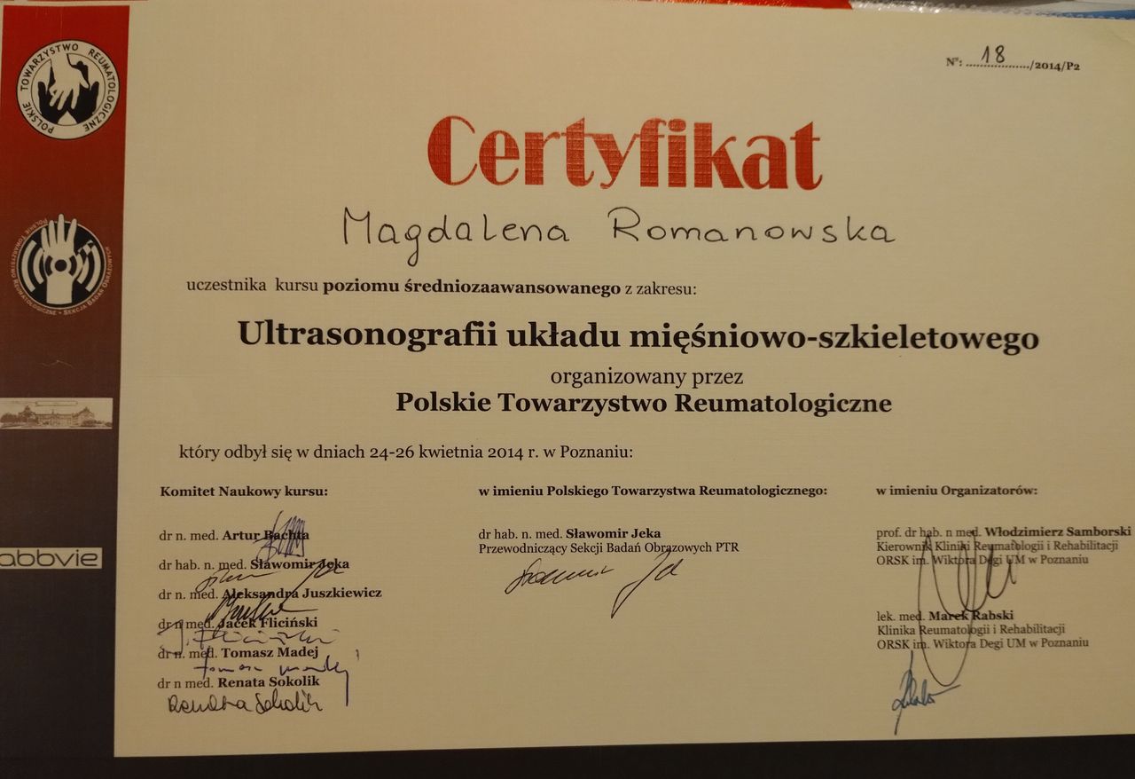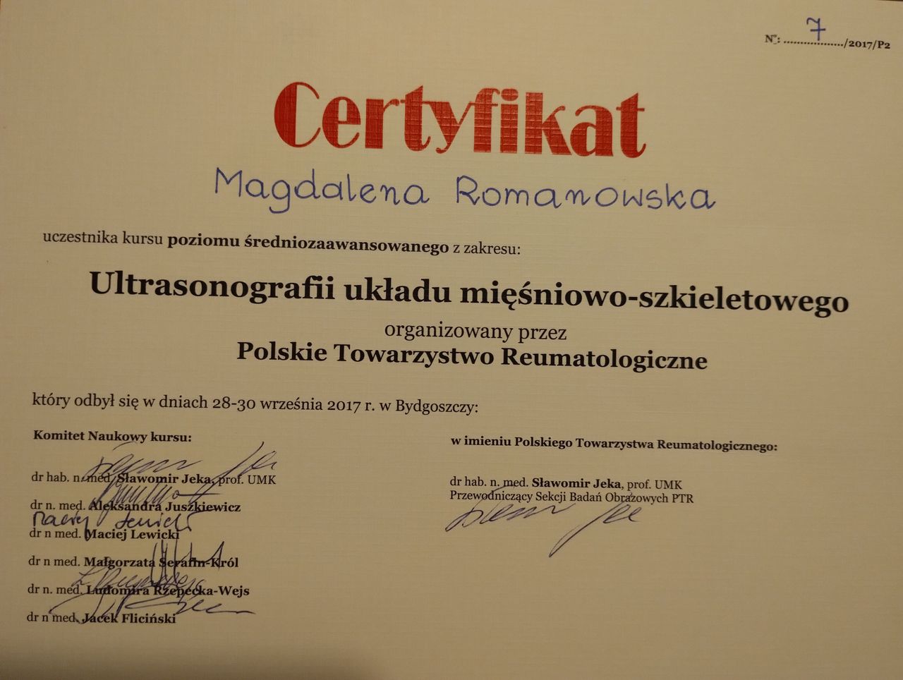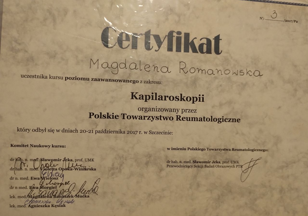 Lek. Magdalena Romanowska SPECJALISTA REUMATOLOGII I CHORÓB WEWNĘTRZNYCH Ukończyła II LO im. K. Jagiellończyka w Elblągu. Studiowała na Akademii Medycznej w Gdańsku na wydziale lekarskim (część praktyk lekarskich poza granicami kraju – Niemcy, Austria) do 2005r . Od 2005 roku pracuje w Wojewódzkim Szpitalu Zespolonym w Elblągu. Ponadto udziela świadczeń specjalistycznych reumatologicznych w innych poradniach. Specjalizację II giego stopnia w dziedzinie chorób wewnętrznych uzyskała w 2013r , a w dziedzinie reumatologii 2016r . Ukończyła liczne kursy z zakresu badań obrazowych usg narządu ruchu i kapilaroskopii. Posiada wiedzę z zakresu orzecznictwa lekarskiego i orzecznictwa Zus. Ciągle doskonali swoje umiejętności uczestnicząc aktywnie w liczych konferencjach naukowych, szkoleniach i kursach.Udziela konsultacji specjalistycznych i kompleksowych porad w zakresie Reumatologii.