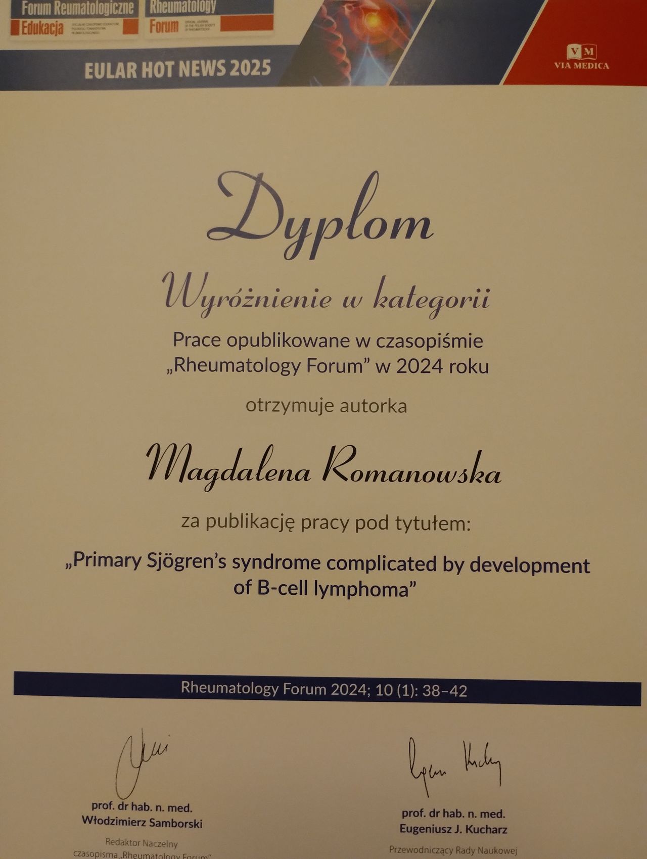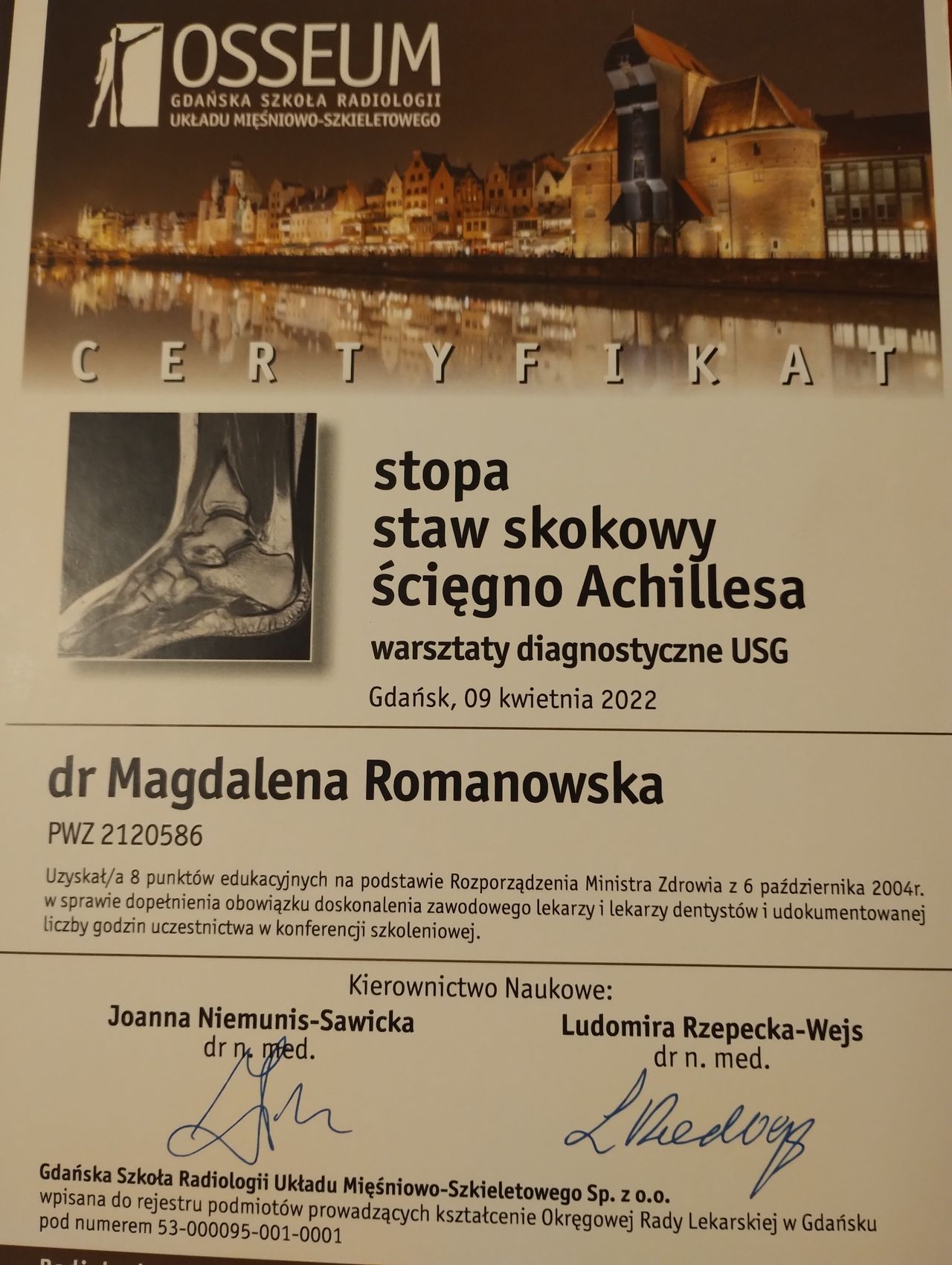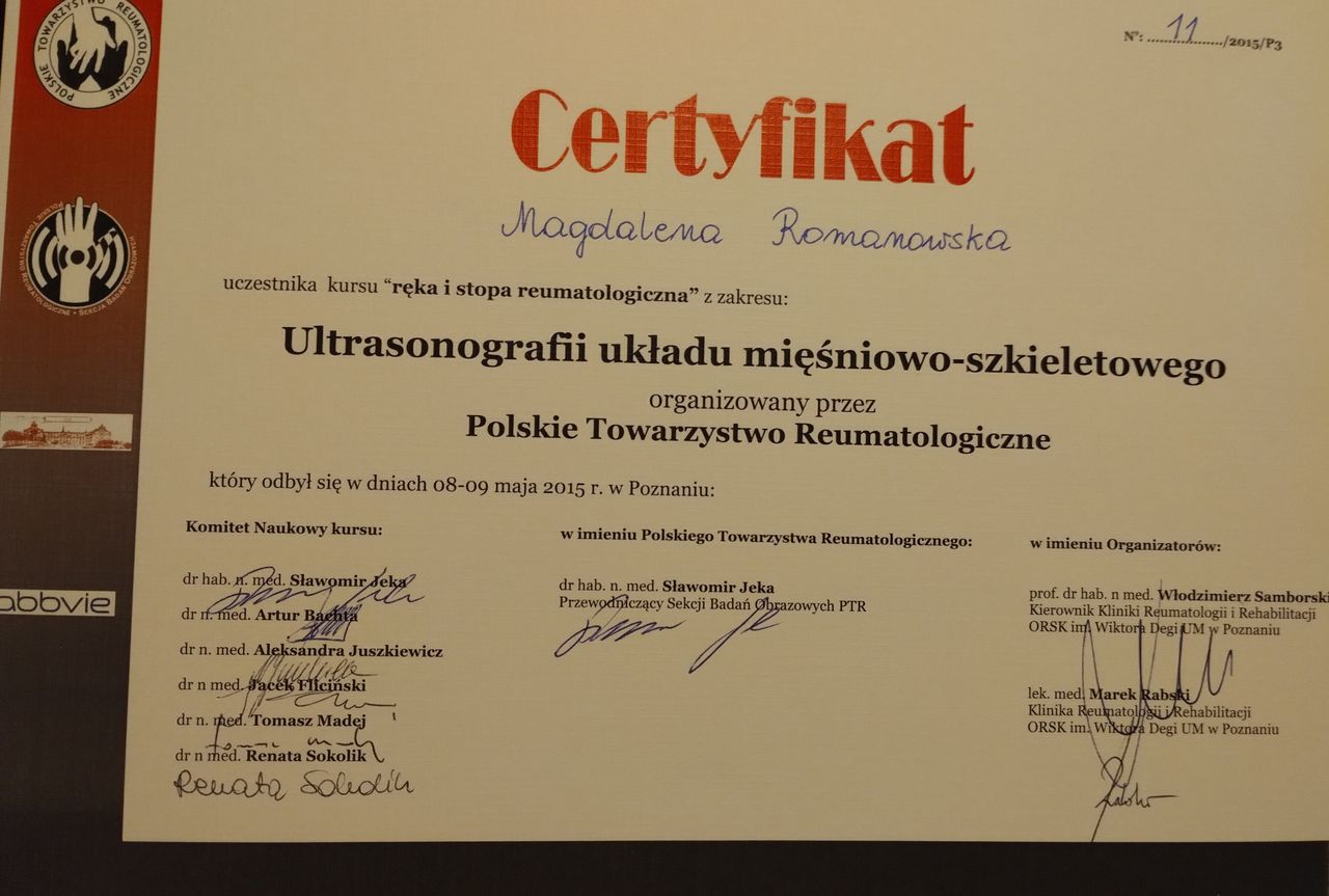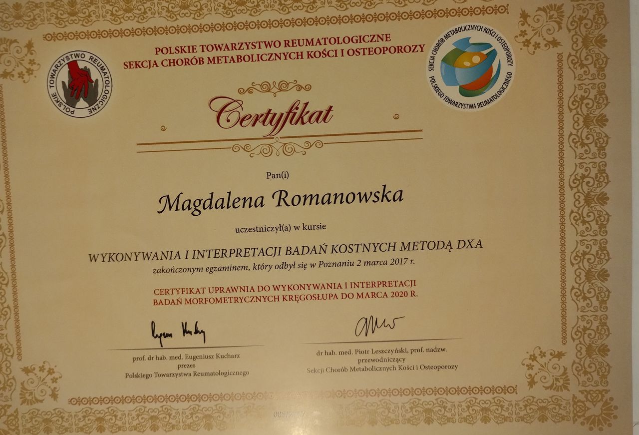 Lek. Magdalena Romanowska SPECJALISTA REUMATOLOGII I CHORÓB WEWNĘTRZNYCH Ukończyła II LO im. K. Jagiellończyka w Elblągu. Studiowała na Akademii Medycznej w Gdańsku na wydziale lekarskim (część praktyk lekarskich poza granicami kraju – Niemcy, Austria) do 2005r . Od 2005 roku pracuje w Wojewódzkim Szpitalu Zespolonym w Elblągu. Ponadto udziela świadczeń specjalistycznych reumatologicznych w innych poradniach. Specjalizację II giego stopnia w dziedzinie chorób wewnętrznych uzyskała w 2013r , a w dziedzinie reumatologii 2016r . Ukończyła liczne kursy z zakresu badań obrazowych usg narządu ruchu i kapilaroskopii. Posiada wiedzę z zakresu orzecznictwa lekarskiego i orzecznictwa Zus. Ciągle doskonali swoje umiejętności uczestnicząc aktywnie w liczych konferencjach naukowych, szkoleniach i kursach.Udziela konsultacji specjalistycznych i kompleksowych porad w zakresie Reumatologii.
