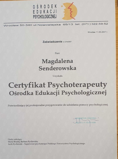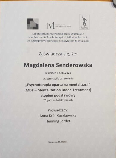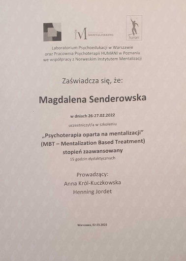 Przez jakiś czas chodziłem do Pani Magdaleny Senderowskiej, o ile Pani dość miła i powiedziała kilka pomocnych rzeczy, to również miałem wrażenie (jak w kilku innych opiniach) że większość rzeczy była bagatelizowanych, do wielu rzeczy nigdy nie wracaliśmy a wszystkie moje problemy się znacznie pogłębiły. Po czym terapia dostała przerwana bo "to już wszystko". Teraz inny psycholog pomaga mi naprawić moje pogłębione problemy.