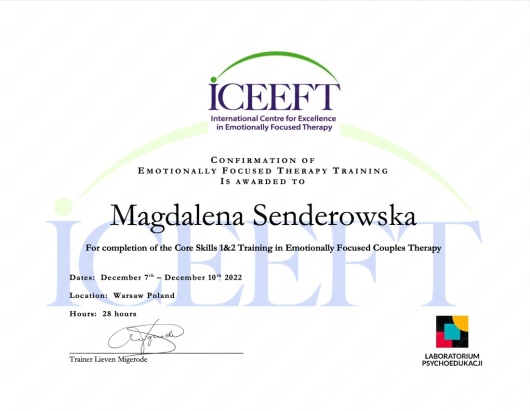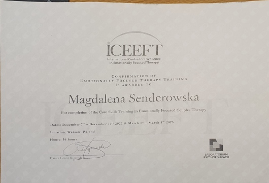 Na konsultację przyszliśmy z mężem w momencie, gdy nasz związek praktycznie wisiał na włosku. Myśleliśmy, że to już koniec. Dzięki atmosferze zaufania i metodzie EFT zaczęliśmy ze sobą rozmawiać inaczej, bardziej z serca. Okazało się, że tak naprawdę dopiero się poznajemy a czas spędzany wspólnie to nie tylko konieczność a właściwie esencja związku :) Pozdrawiamy! :)