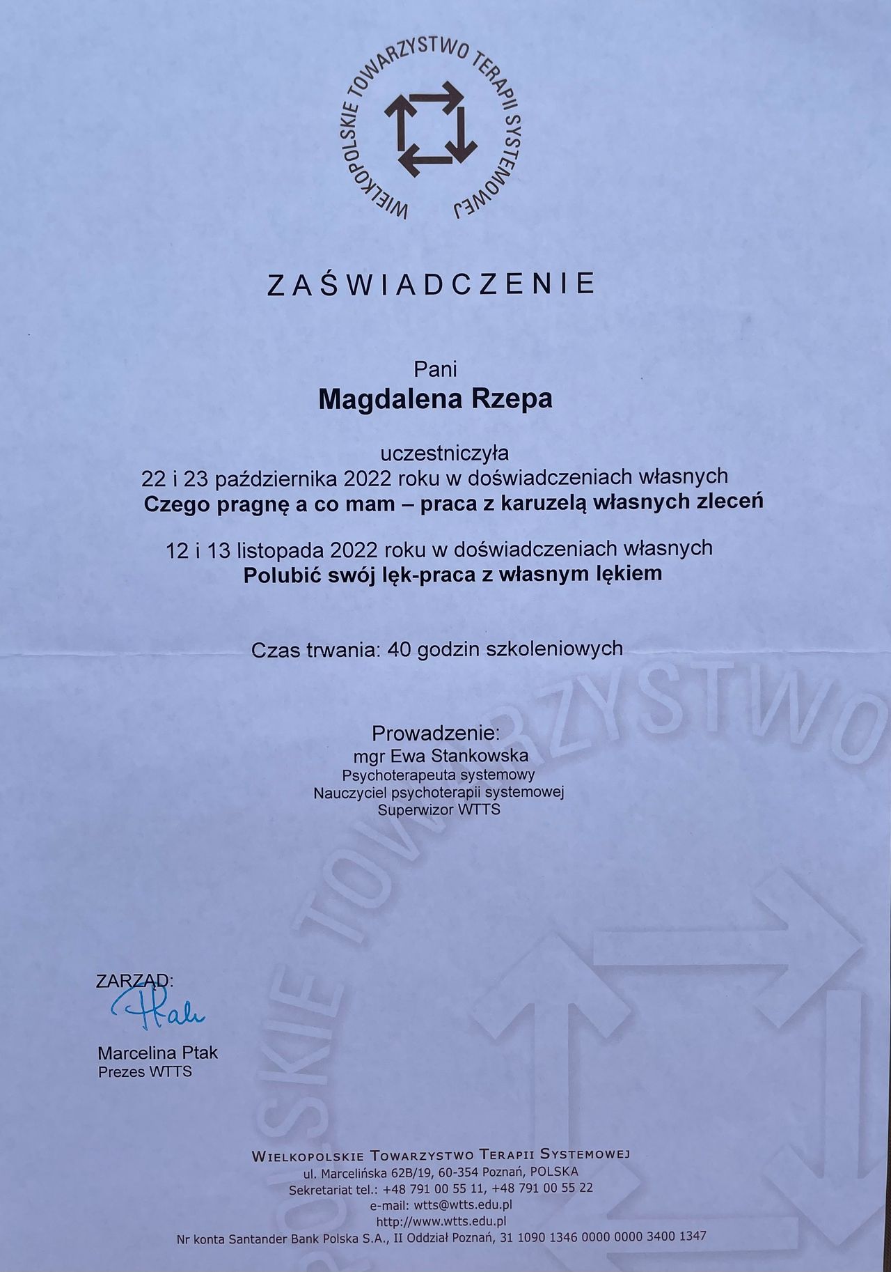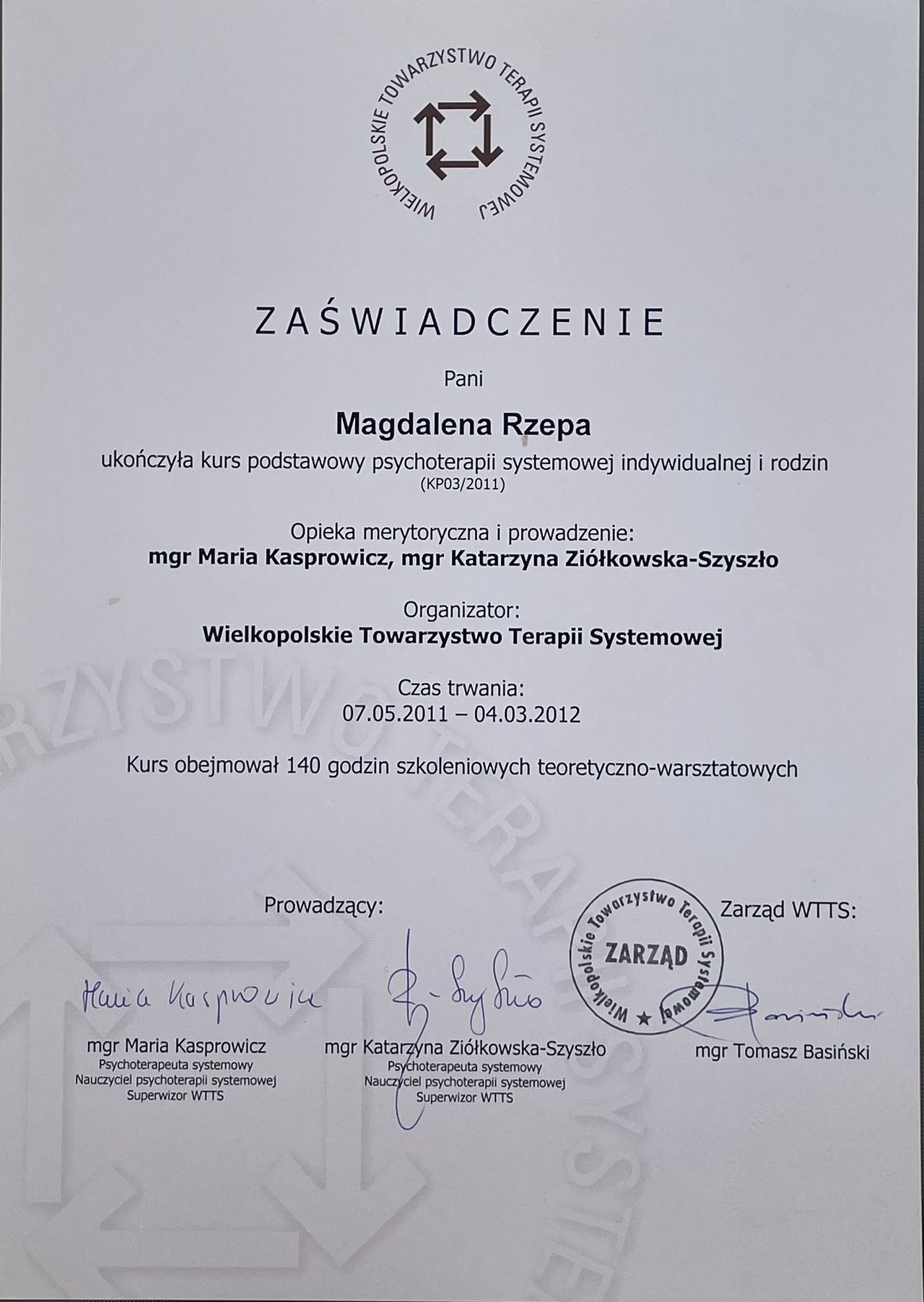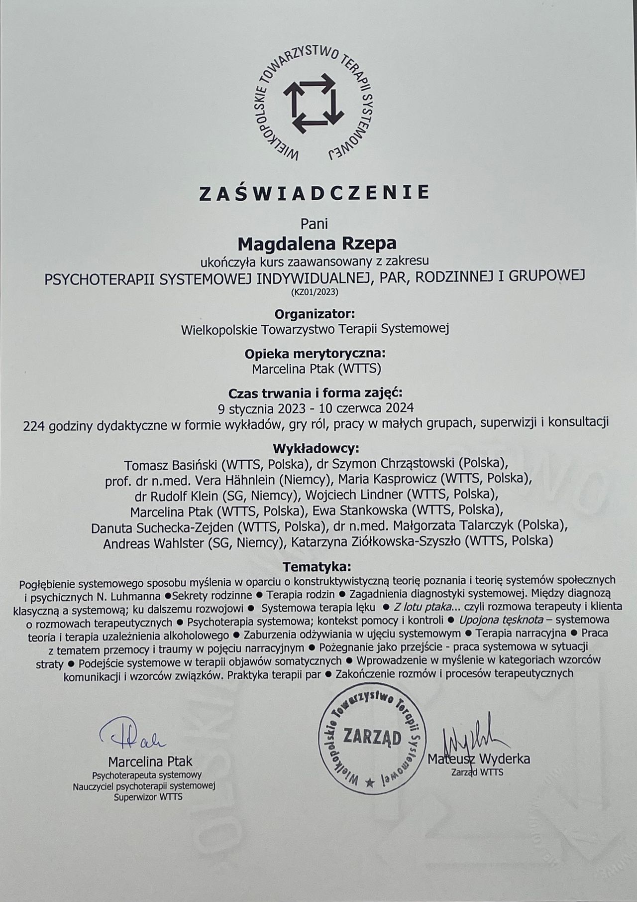 Aktualnie rozwijam kompetencje terapeutyczne na 1,5 rocznym kursie integrującym idee systemowe z różnymi modelami pracy terapeutycznej w Wielkopolskim Towarzystwie Terapii Systemowej, którego jestem członkiem nadzwyczajnym. Celem zachowania etyki pracy pracuję pod stałą superwizją. Sesje ze mną mają charakter nieformalnych spotkań, na których głównym narzędziem pracy jest rozmowa. W zależności od potrzeb czasami proponuję również elementy pracy z przestrzenią, kartką, figurkami, procesem cielesnym (doświadczeniem cielesnym klienta), wizualizacją i inne. Prowadzę zarówno sesje terapeutyczne jak i rozwojowe zorientowane na life coaching. Spotkania trwają 50 minut, odbywają się w klimatycznym gabinecie na poznańskim Grunwaldzie lub online przez WhatsUpp. Zapraszam serdecznie!