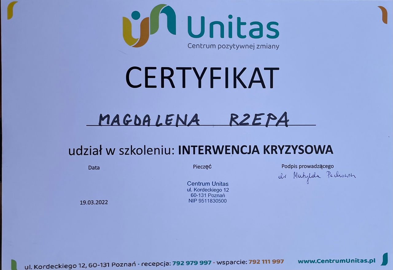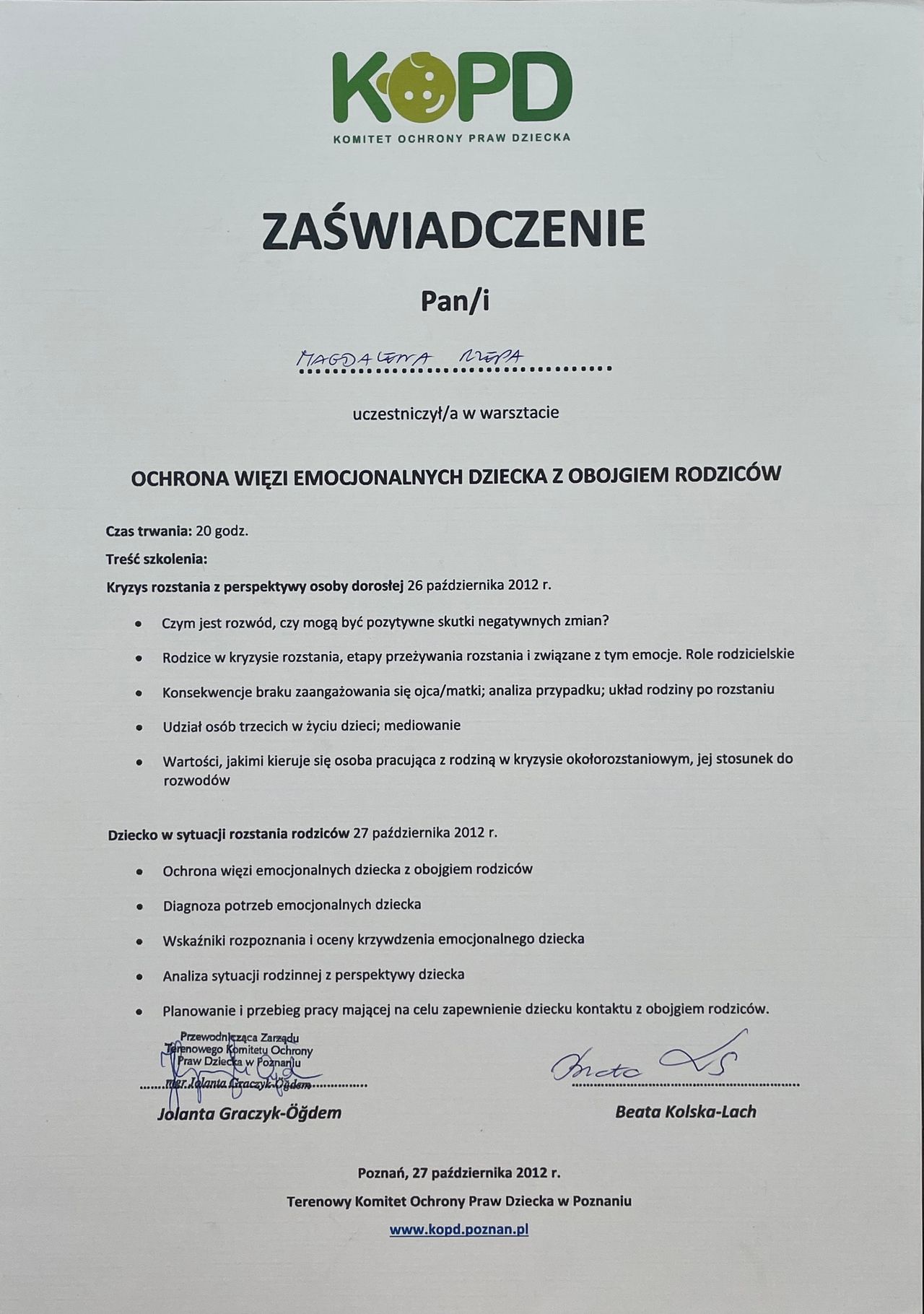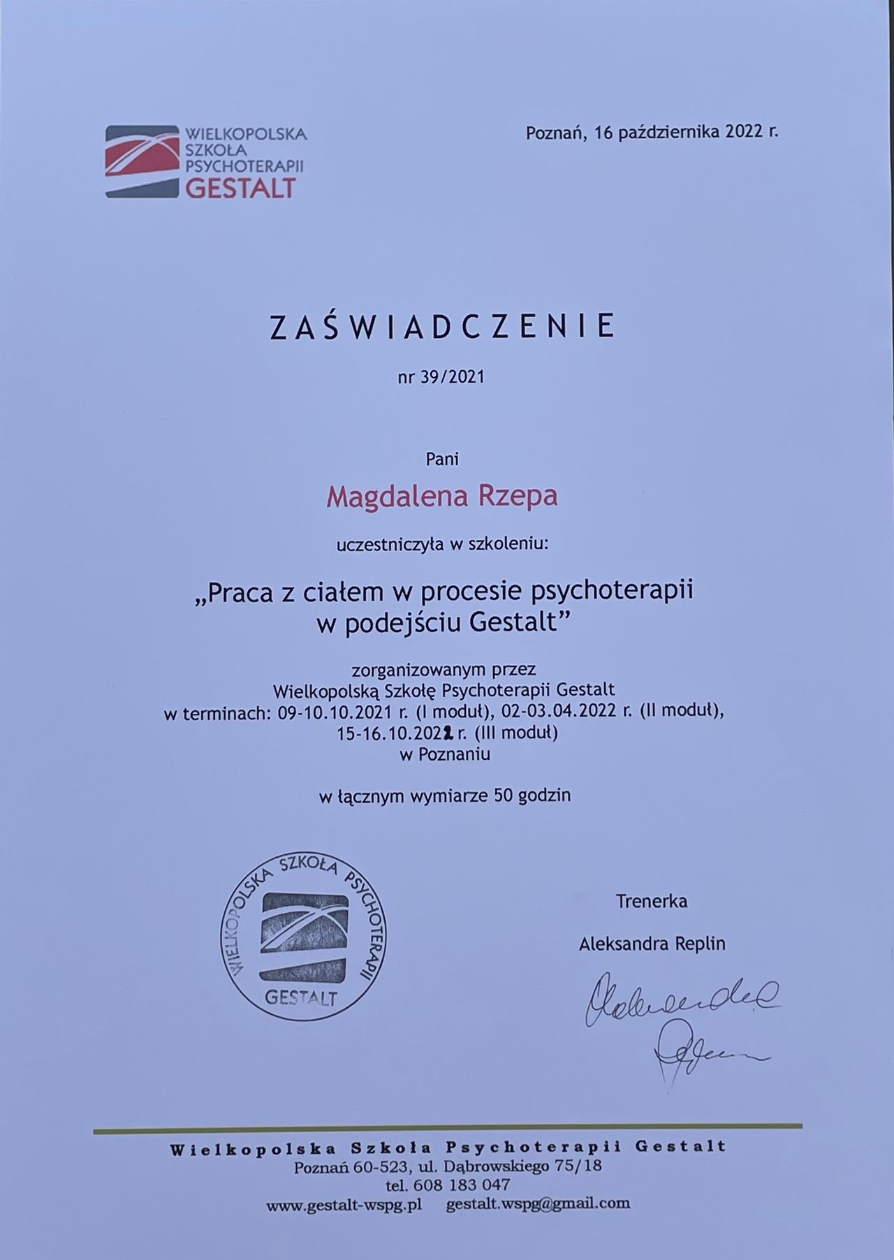 Ukończyłam psychologię (UAM), kurs zaawansowany z zakresu psychoterapii indywidualnej, par, rodzinnej i grupowej w Wielkopolskim Towarzystwie Terapii Systemowej, kurs pracy z procesem cielesnym w psychoterapii w Wielkopolskiej Szkole Psychoterapii Gestalt oraz studia podyplomowe z coachingu na uniwersytecie SWPS.