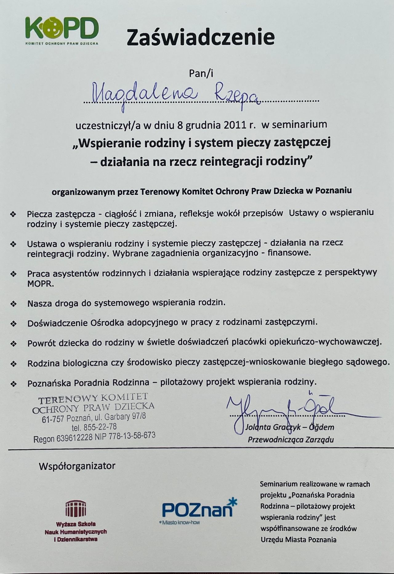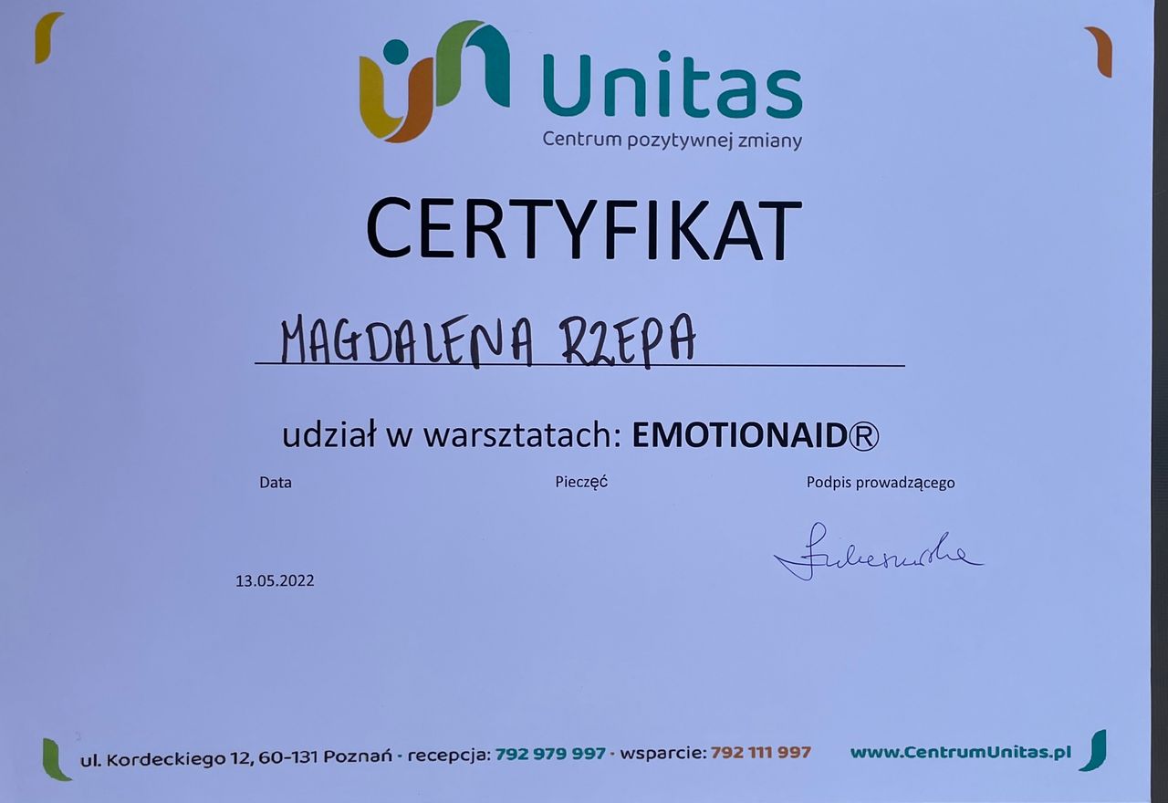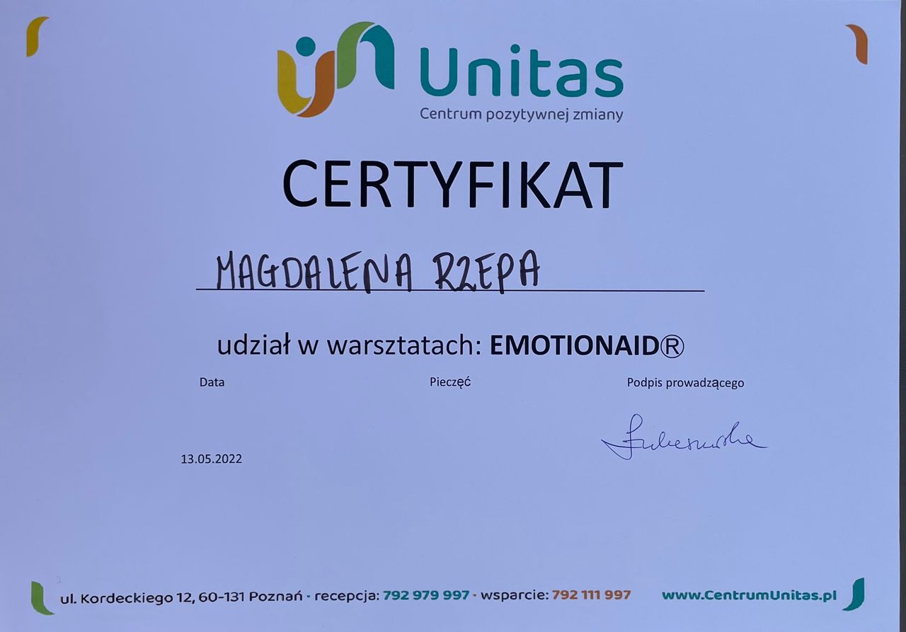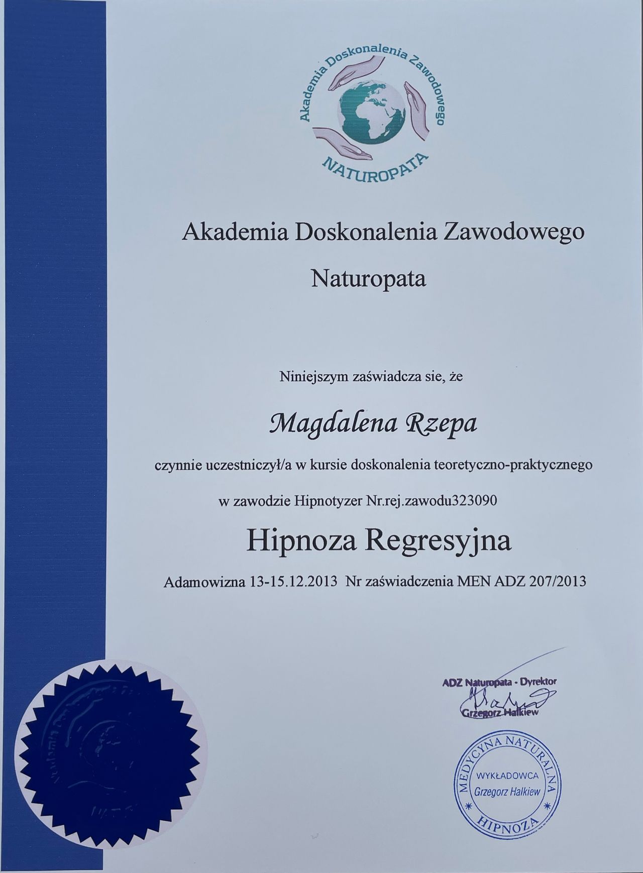 Ukończyłam psychologię (UAM), kurs zaawansowany z zakresu psychoterapii indywidualnej, par, rodzinnej i grupowej w Wielkopolskim Towarzystwie Terapii Systemowej, kurs pracy z procesem cielesnym w psychoterapii w Wielkopolskiej Szkole Psychoterapii Gestalt oraz studia podyplomowe z coachingu na uniwersytecie SWPS.