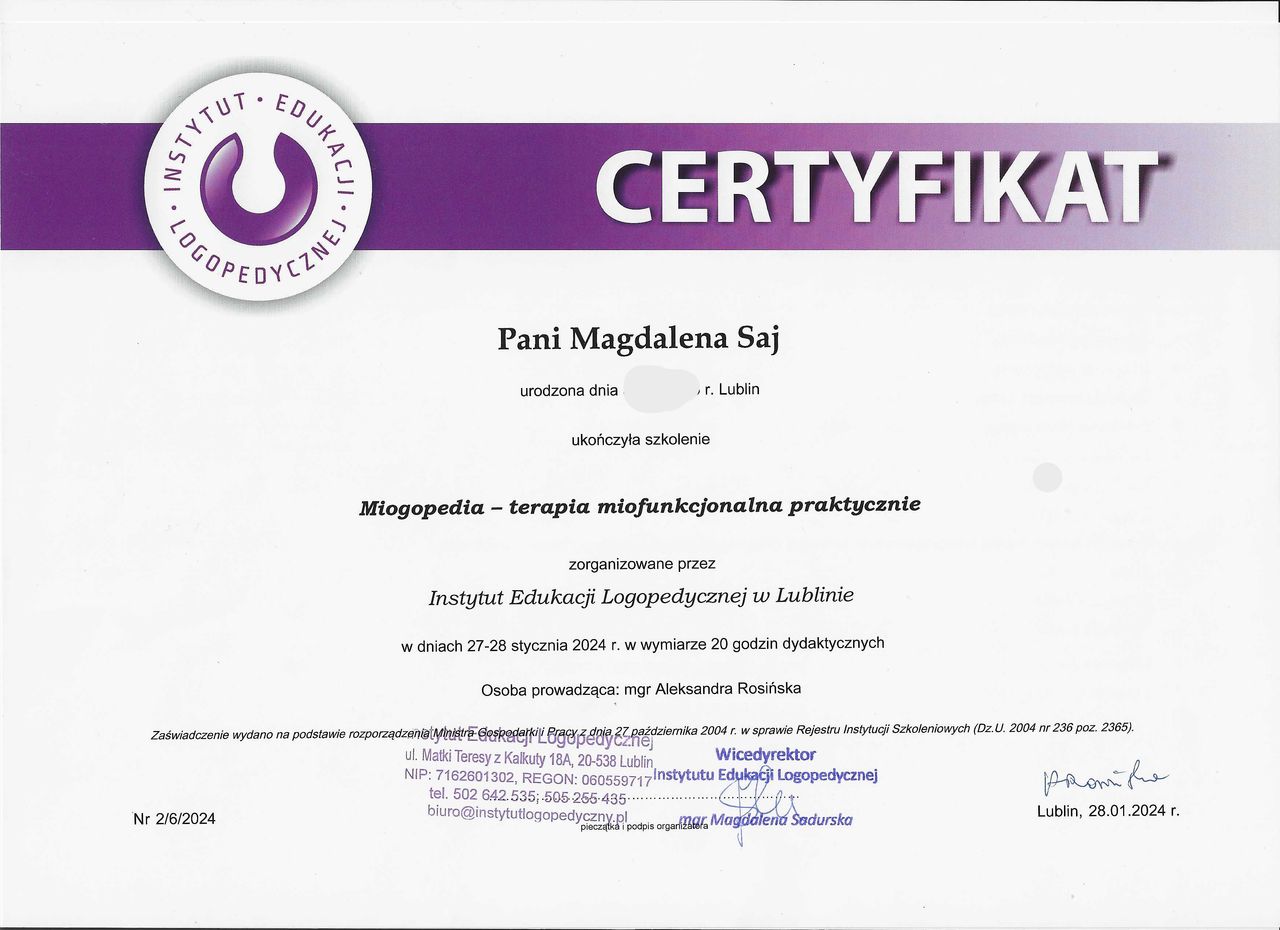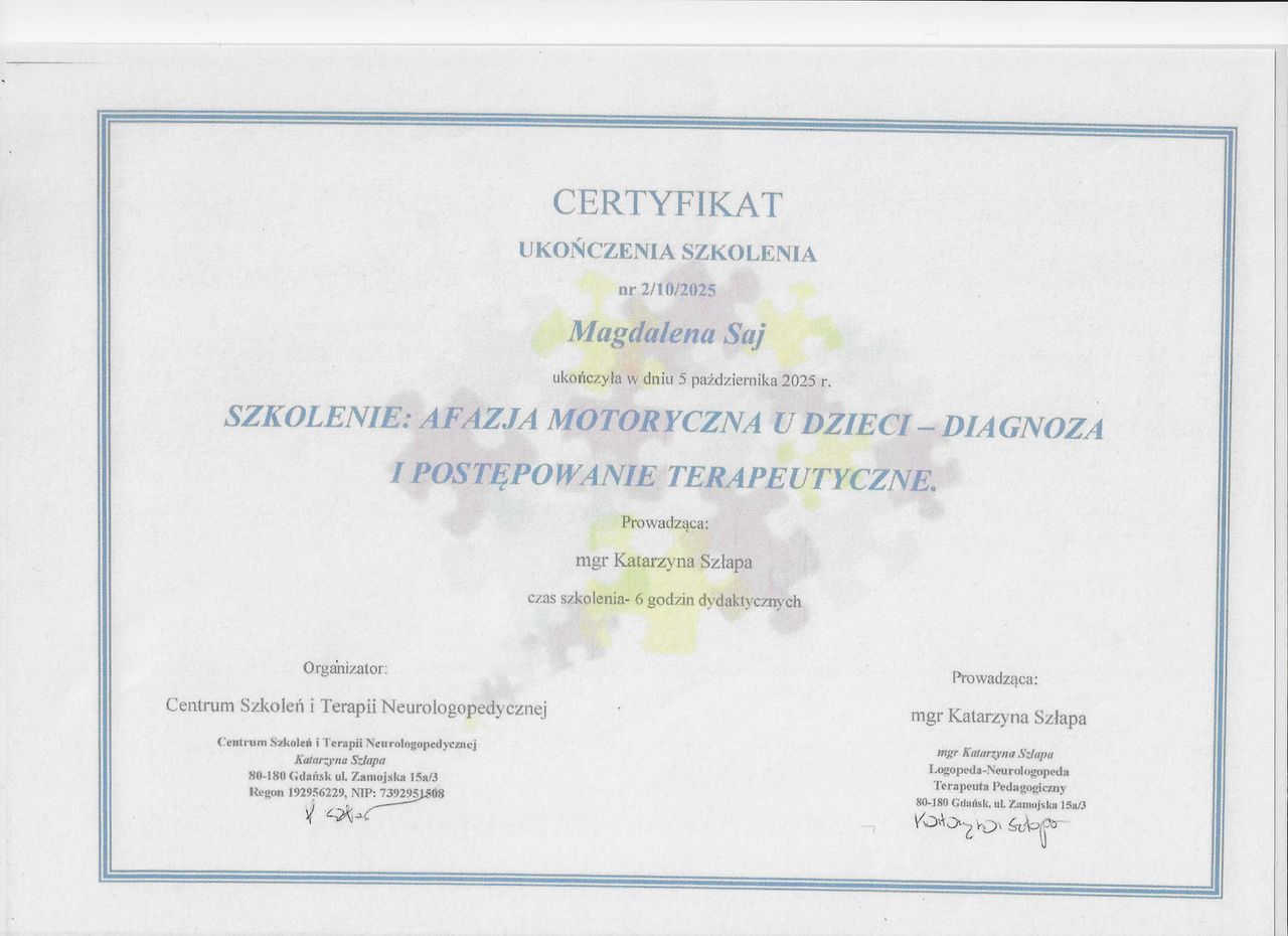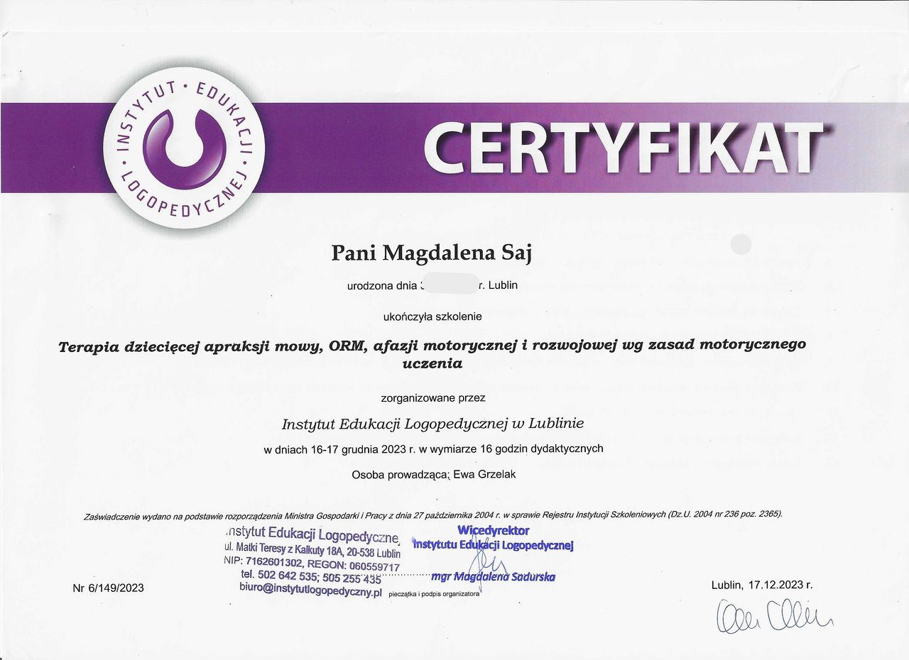 Jestem dyplomowanym logopedą, legitymuję się dyplomem magistra o specjalizacji logopedia kliniczna. Prowadzę terapię logopedyczną pacjentów z różnymi zaburzeniami mowy, zarówno dzieci, jak i dorosłych. Swoją praktykę zawodową rozpoczęłam już na studiach angażując się w działalność wolontariacką, prowadziłam terapię logopedyczną pacjentów chorych neurologicznie. Zdobywałam bogate doświadczenie i doskonaliłam swój warsztat zawodowy w takich miejscach jak oddział Neurologii z Pododdziałem Udarowym i Wczesnej Rehabilitacji Poudarowej, przedszkola, żłobki, przychodnia specjalistyczna, prywatne gabinety logopedyczne.