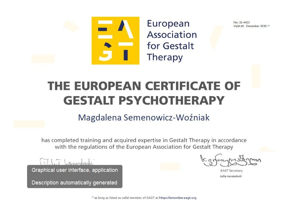 Ukończyłam liczne szkolenia, m.in. roczne szkolenie „Podstawy Psychoterapii Psychoanalitycznej” w Instytucie Studiów Psychoanalitycznych im. Hanny Segal, kurs pracy ze snami w oparciu o analizę jungowską oraz kurs diagnozy predyspozycji i talentów zgodnie z typologią C.G. Junga (Gifts Compass Certified Advisor). W mojej pracy łączę myśl psychoanalityczną, koncepcje analizy jungowskiej oraz podejście Gestalt, co pozwala mi dostosować metody do indywidualnych potrzeb klientów.
