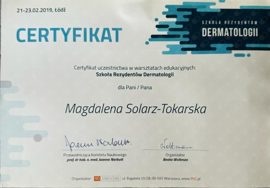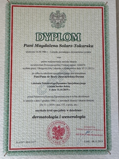 Szkolenie specjalizacyjne realizowałam w Szpitalu Specjalistycznym im. Stefana Żeromskiego w Krakowie uzyskując tytuł specjalisty dermatologii i wenerologii w 2019 roku.