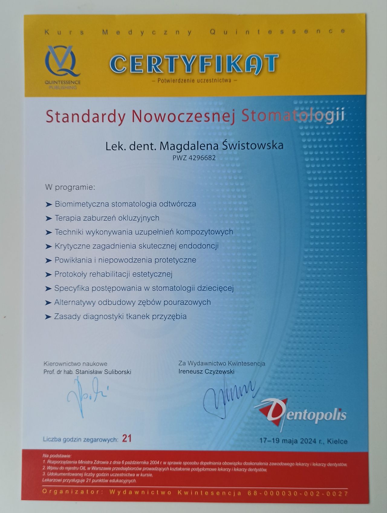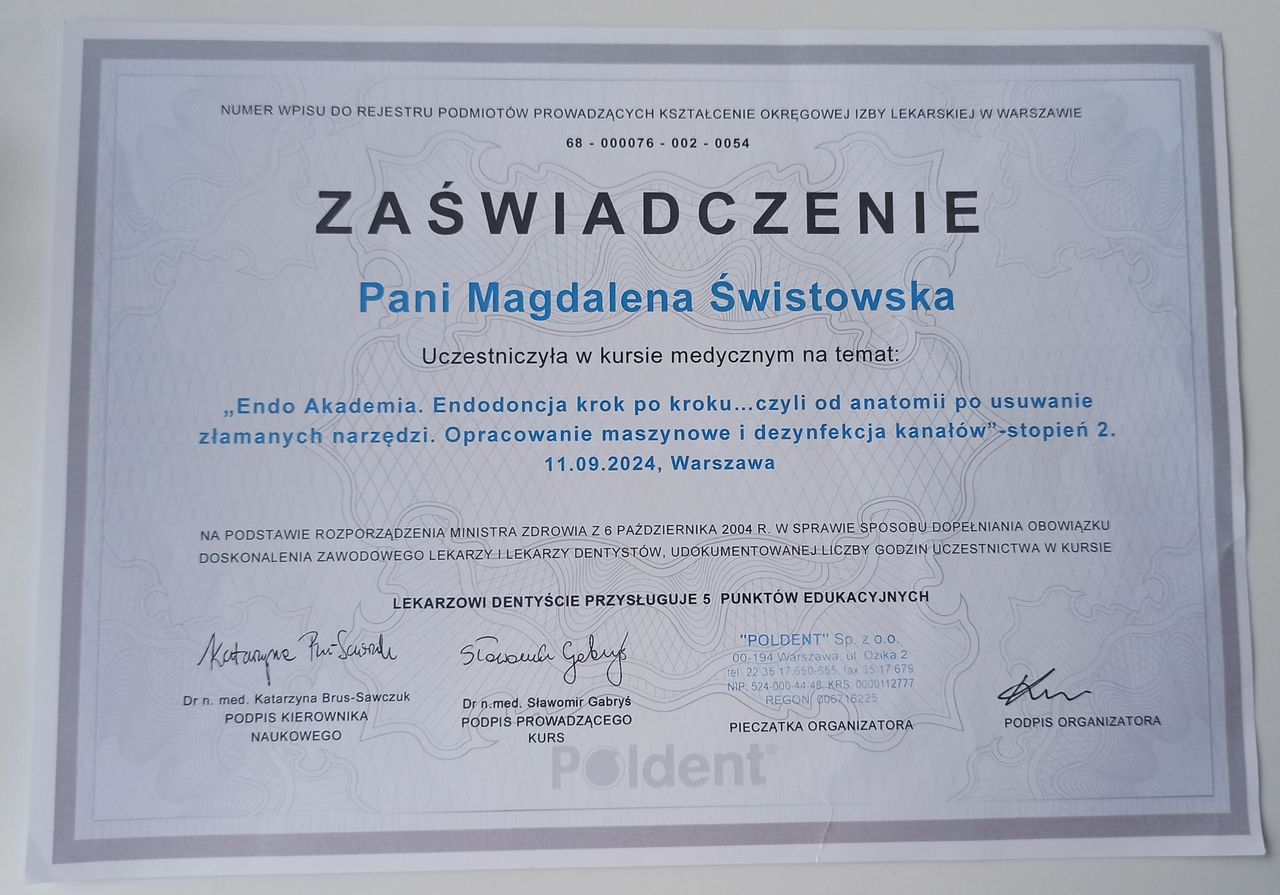 Jaki jest zakres porad oferowanych przez Magdalena Świstowska?Magdalena Świstowska to stomatolog. Na podstawie swojego doświadczenia i wykształcenia Magdalena Świstowska oferuje usługi takie jak: konsultacja endodontyczna, leczenie chorób dziąseł, leczenie kanałowe, leczenie nadwrażliwości zębów, leczenie próchnicy, leczenie stomatologiczne pod mikroskopem, odbudowa zębów, stomatologia dziecięca, stomatologia estetyczna, usuwanie kamienia nazębnego.