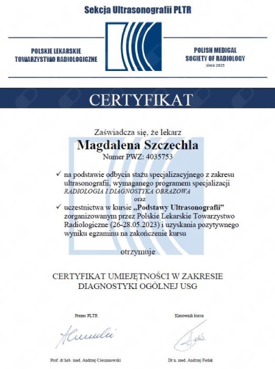 Dbam o poszerzanie swojej wiedzy zarówno na płaszczyźnie teoretycznej jak i w praktyce. Jestem członkinią Polskiego Towarzystwa Radiologicznego, z ramienia towarzystwa uzyskałam certyfikat ukończenia kursu umiejętności ultrasonografii.